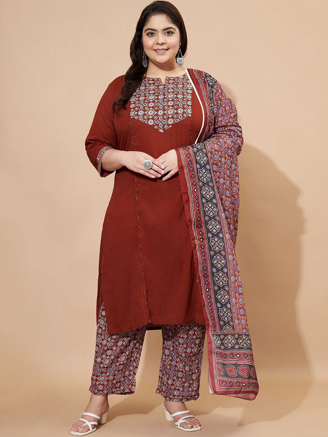 GULMEHAK Women Plus Size Ethnic Motifs Printed Pure Cotton Kurta with Palazzo & Dupatta