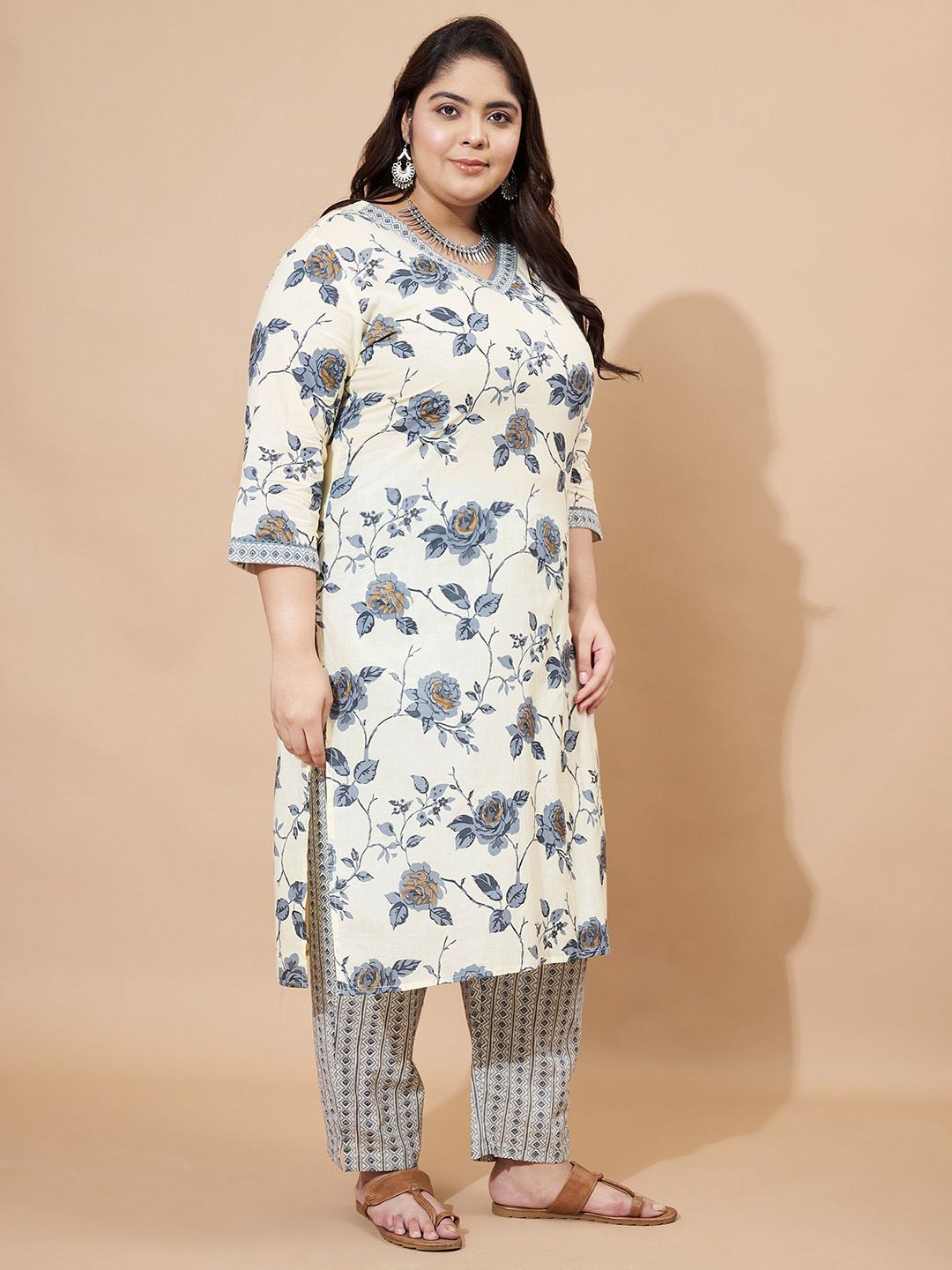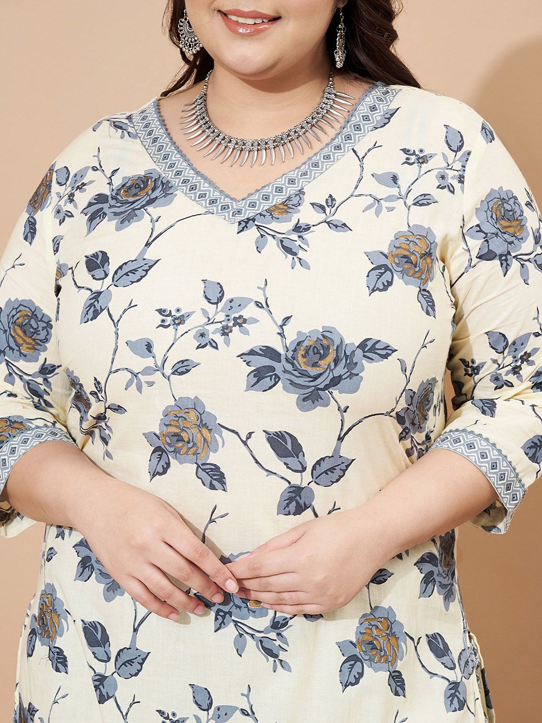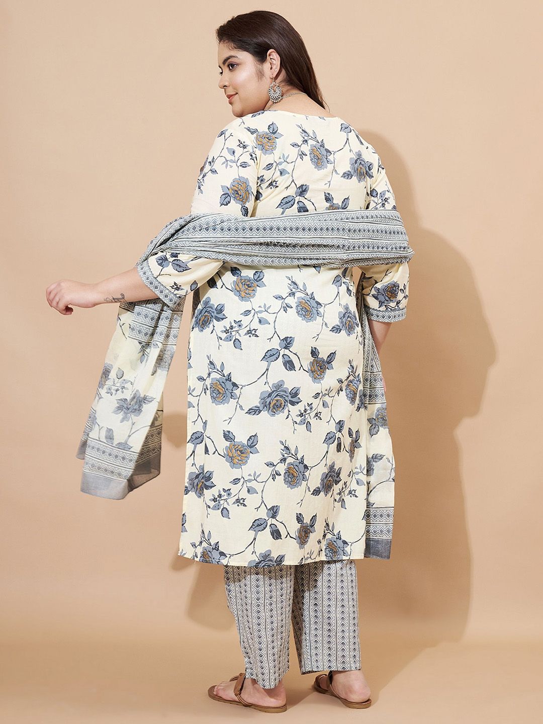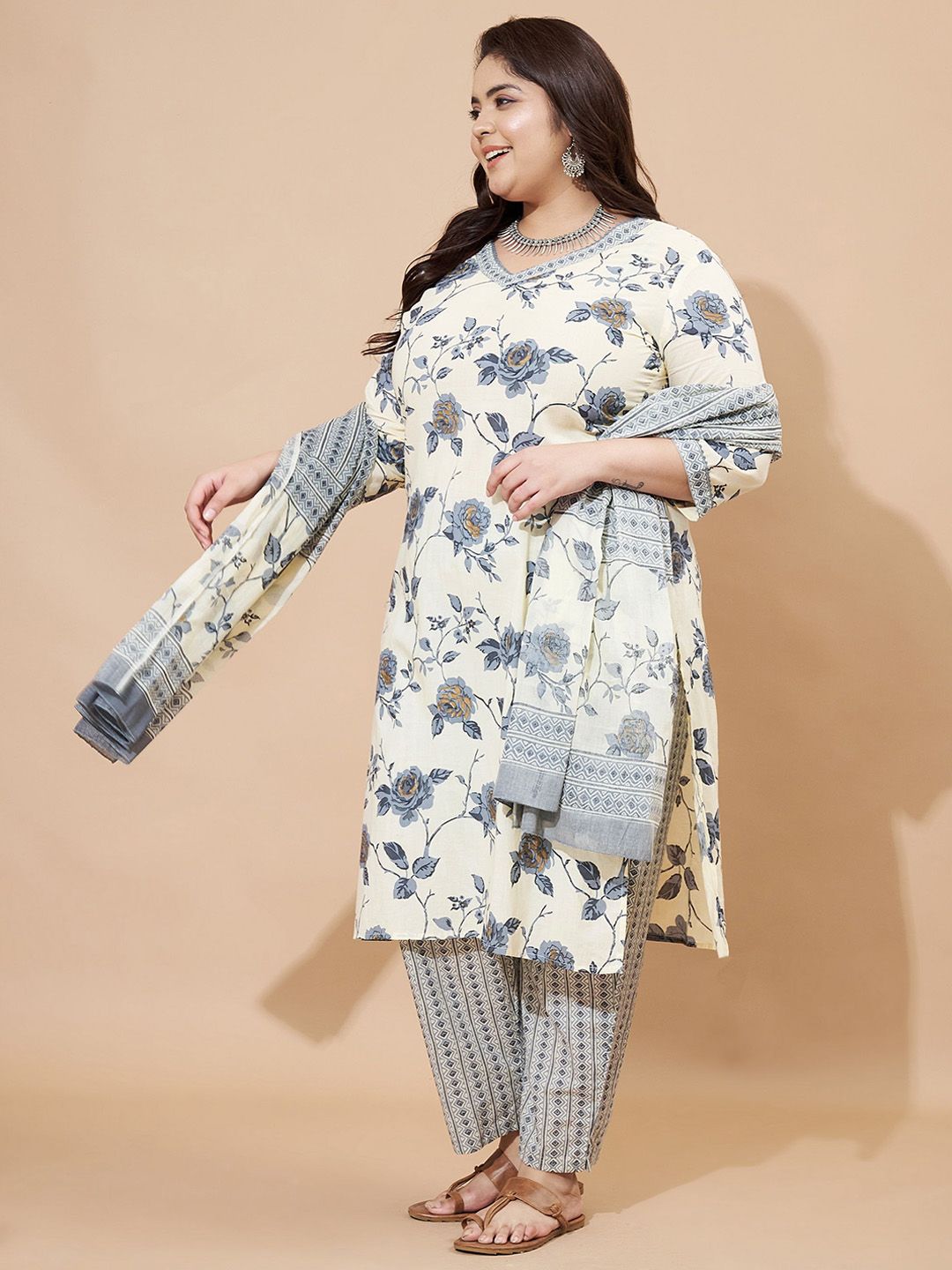 GULMEHAK Women Plus Size Floral Printed V-Neck Pure Cotton Kurta with Trousers & Dupatta