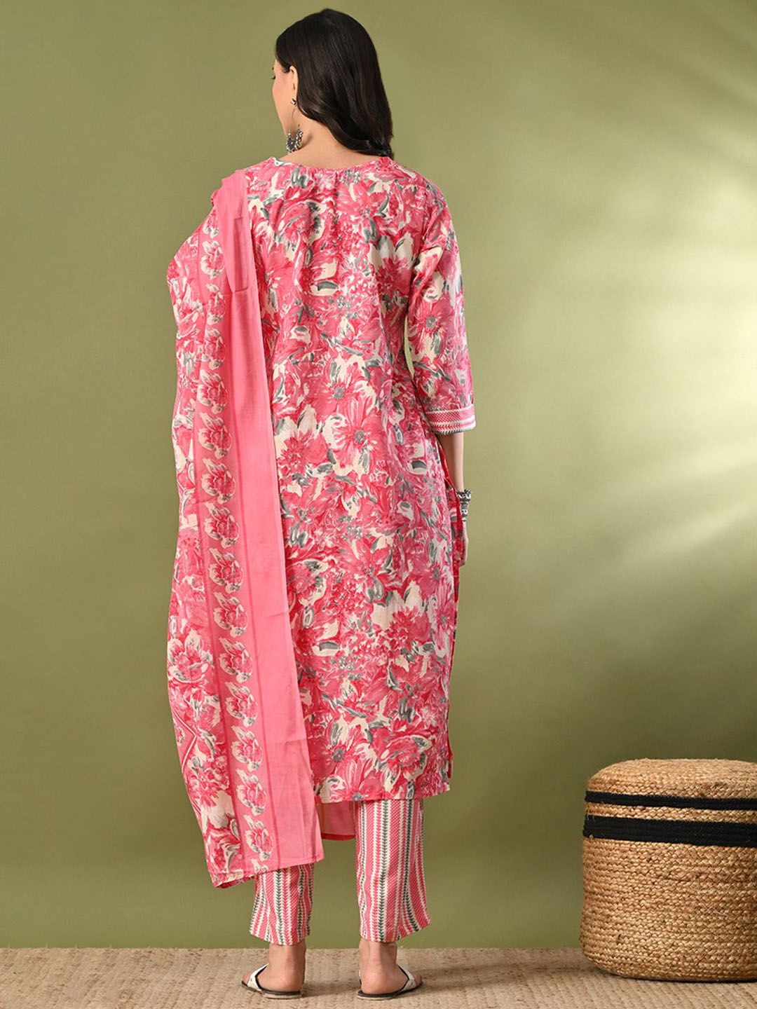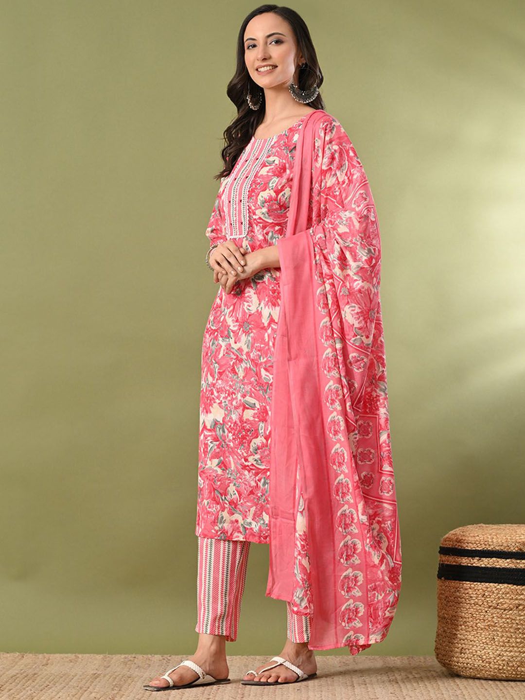HARIKS Floral Printed Round Neck Pure Cotton Straight Kurta & Trousers With Dupatta