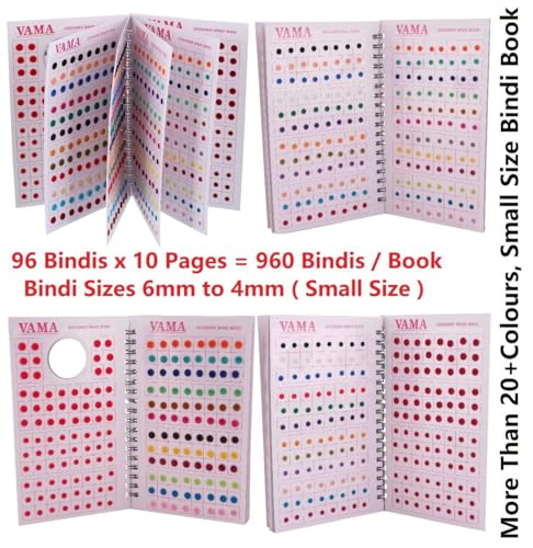 Colour-Multi. These multicolor Round Daily Use bindis are perfect for everyday indian ethnic wear or any special occasion, weddings, festivals, parties, proms, dances and anytime of the year. New Spiral Bindi Book Concept! Is has Basic Daily wear Round bindis. Total of 960 Bindis Booklet With 10 Pages. Bindis for ladies multi color are Self Adhesive & Just Ready for Use & these Bridal Bindiya bindi designs are handcrafted with care and attempt to embody the elegance and grace of a woman.