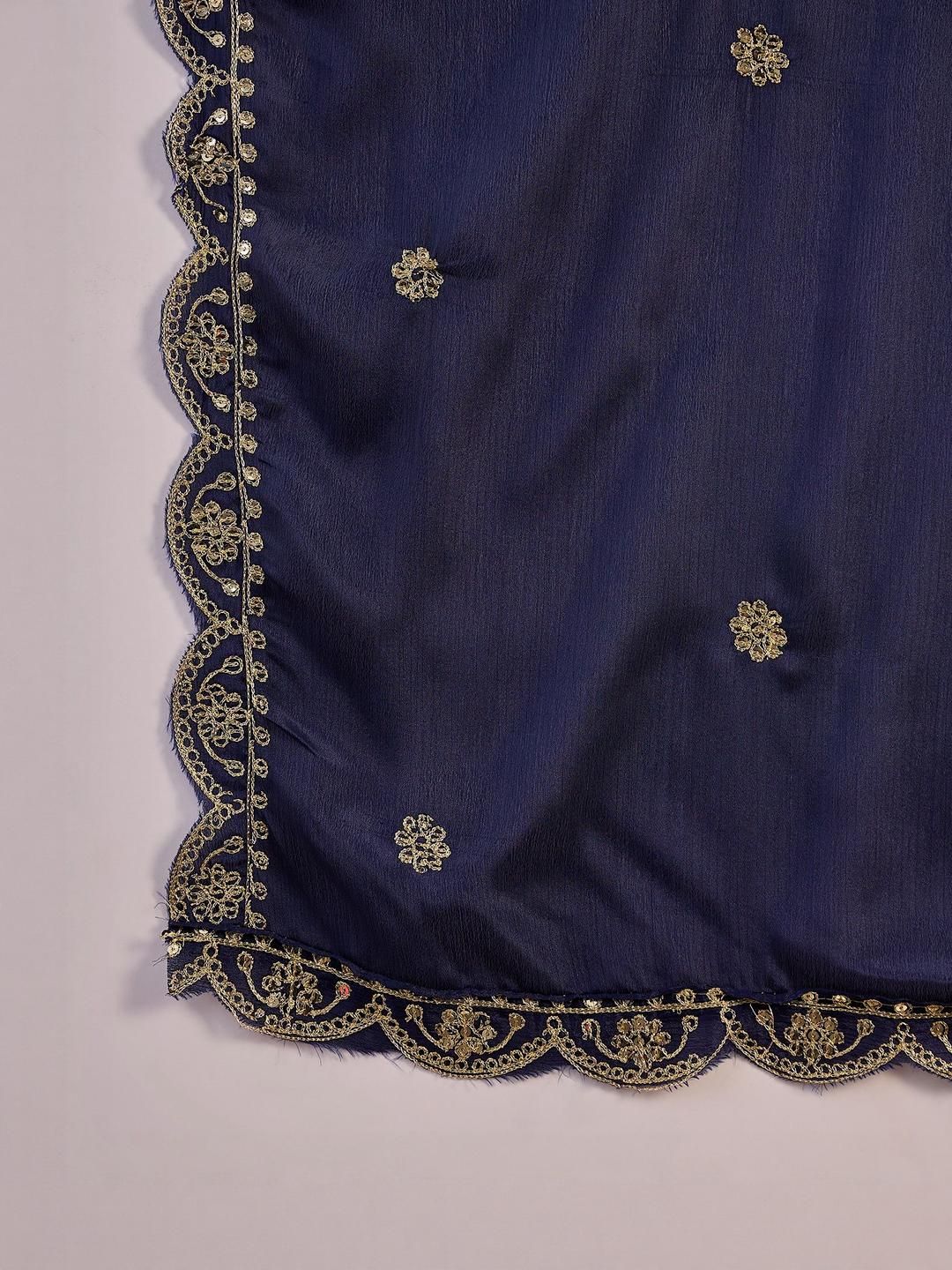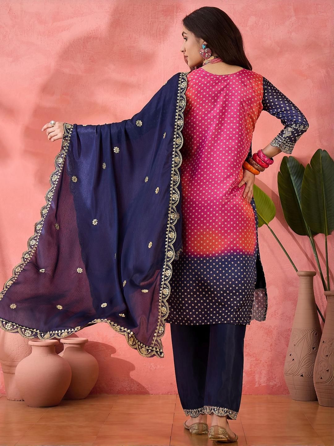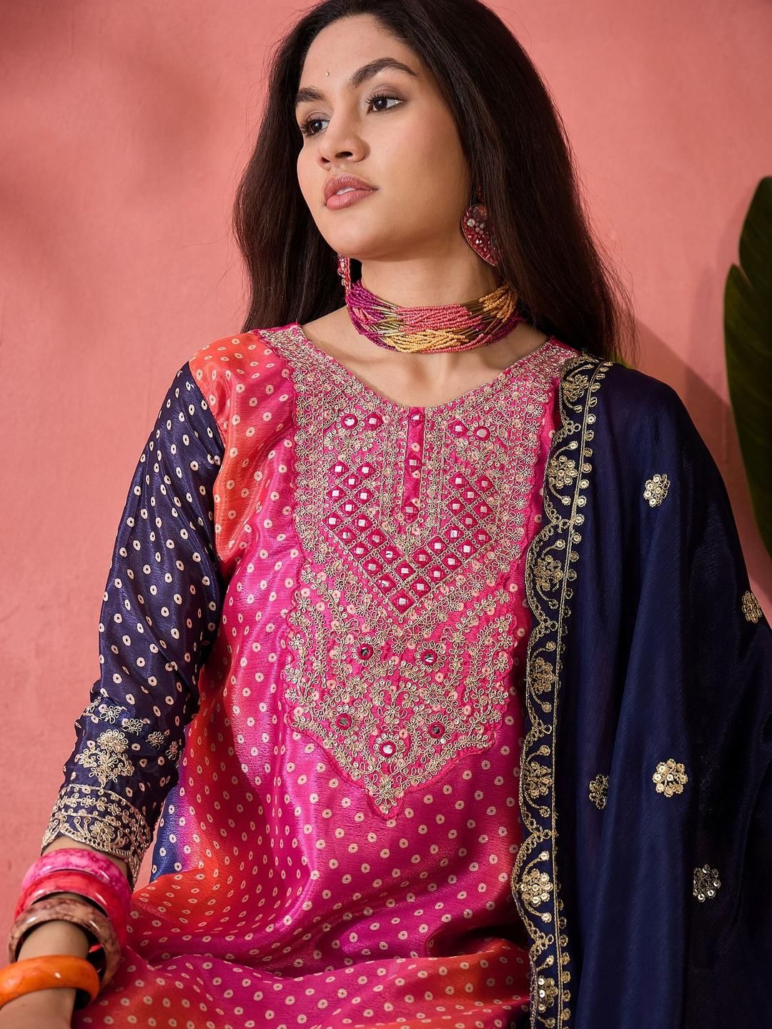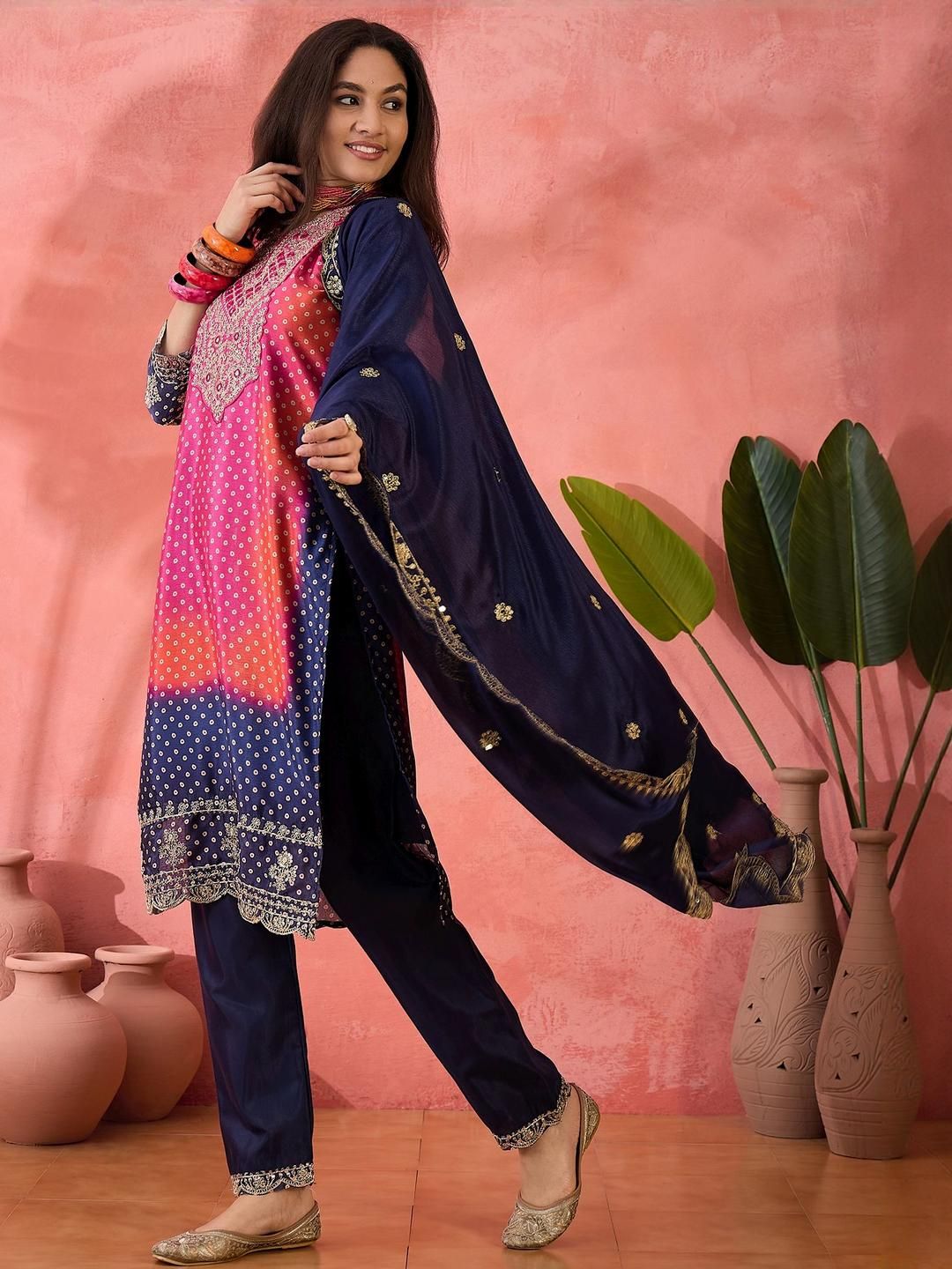 HERE&NOW Bandhani Printed Round Neck Sequinned Straight Kurta With Trousers & Dupatta
