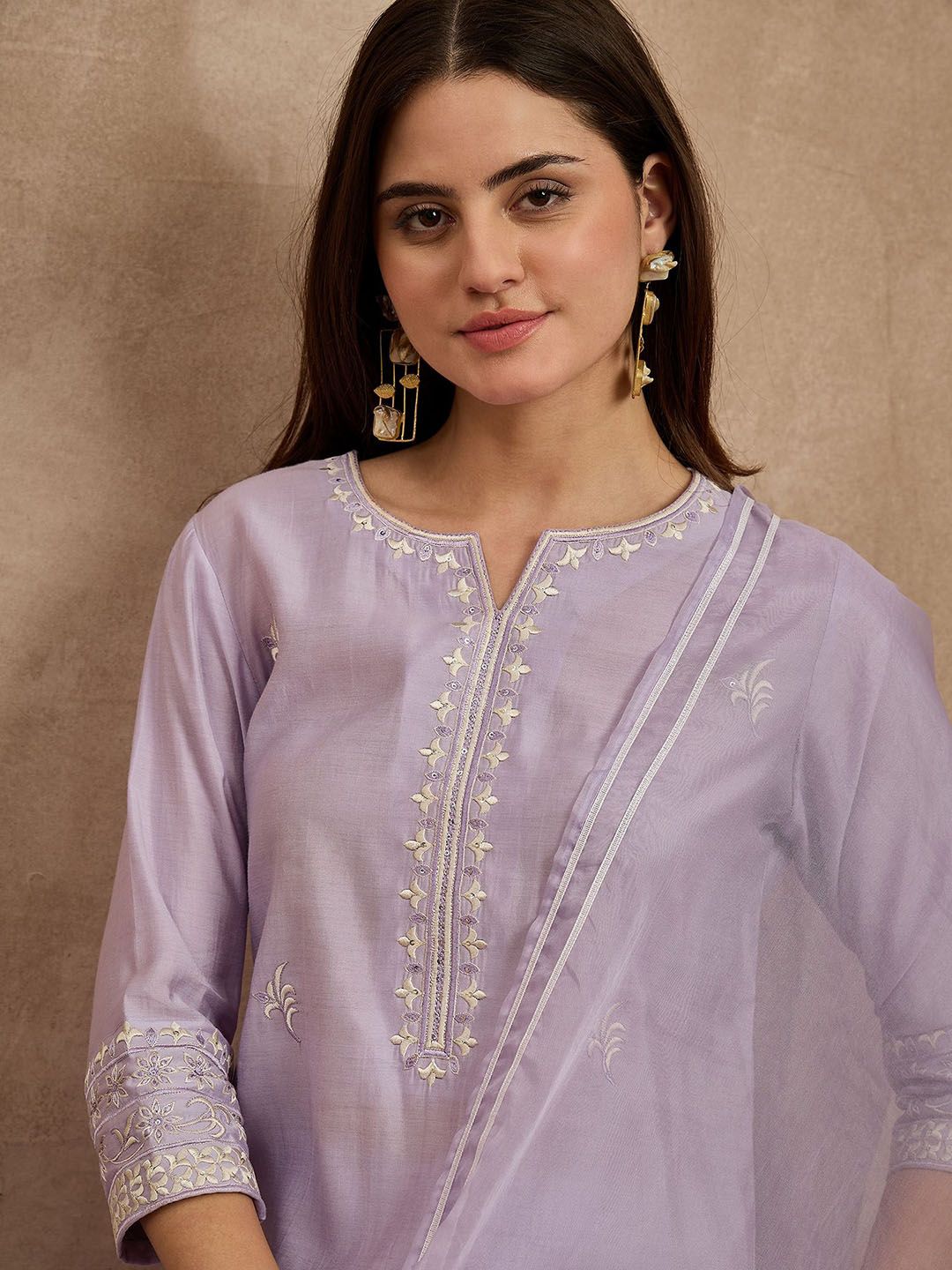 HERE&NOW Floral Embroidered Notch Neck Thread Work Straight Kurta With Trousers & Dupatta