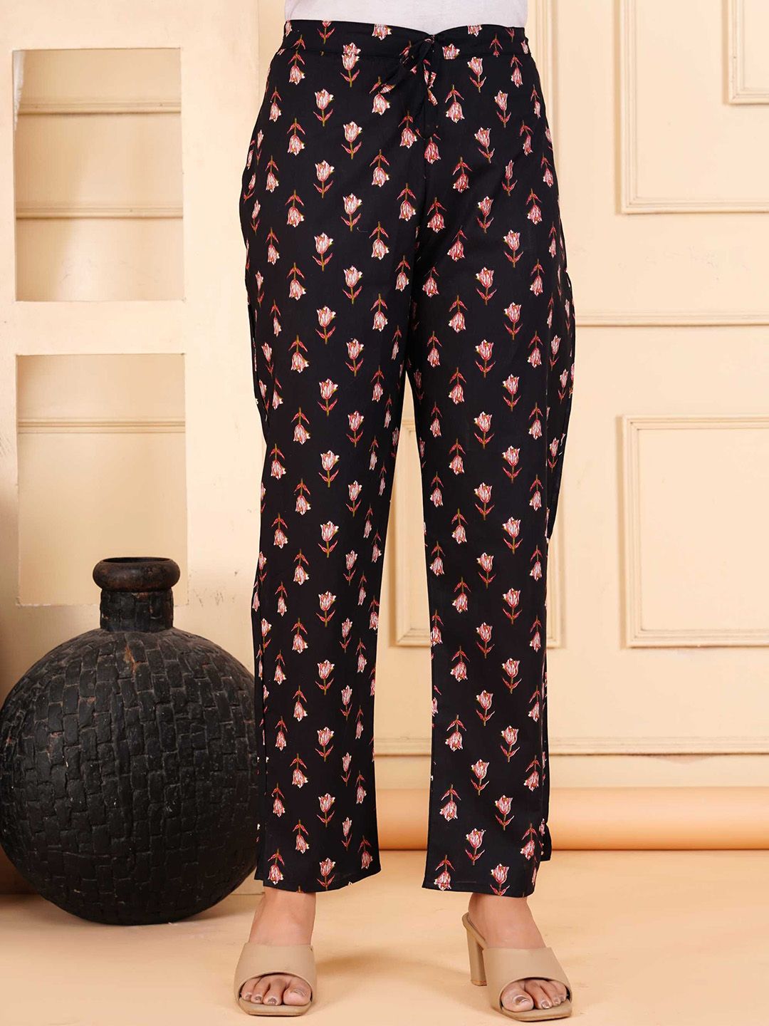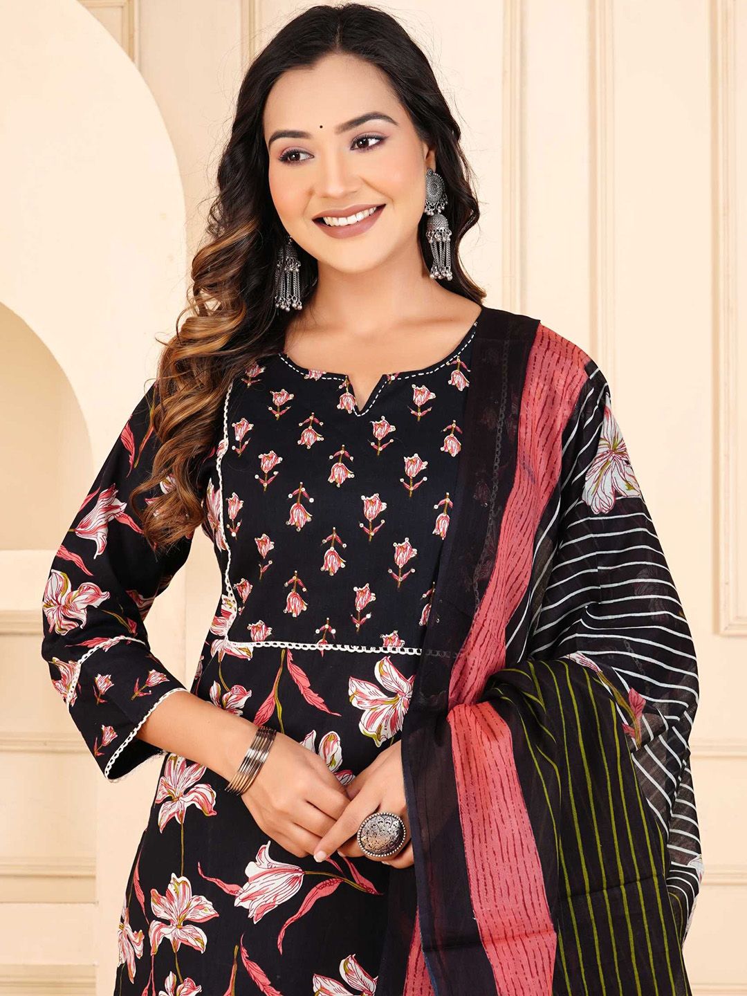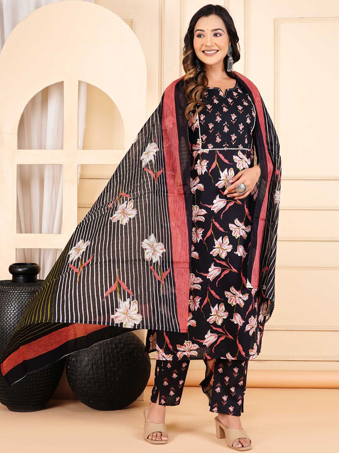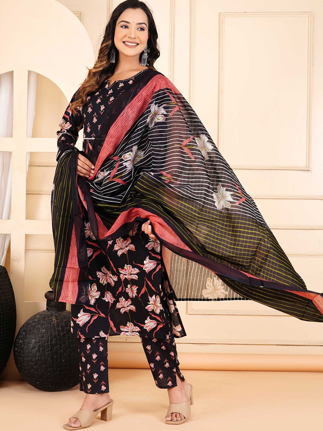 HERE&NOW Floral Printed Pure Cotton Kurta With Trousers & Dupatta