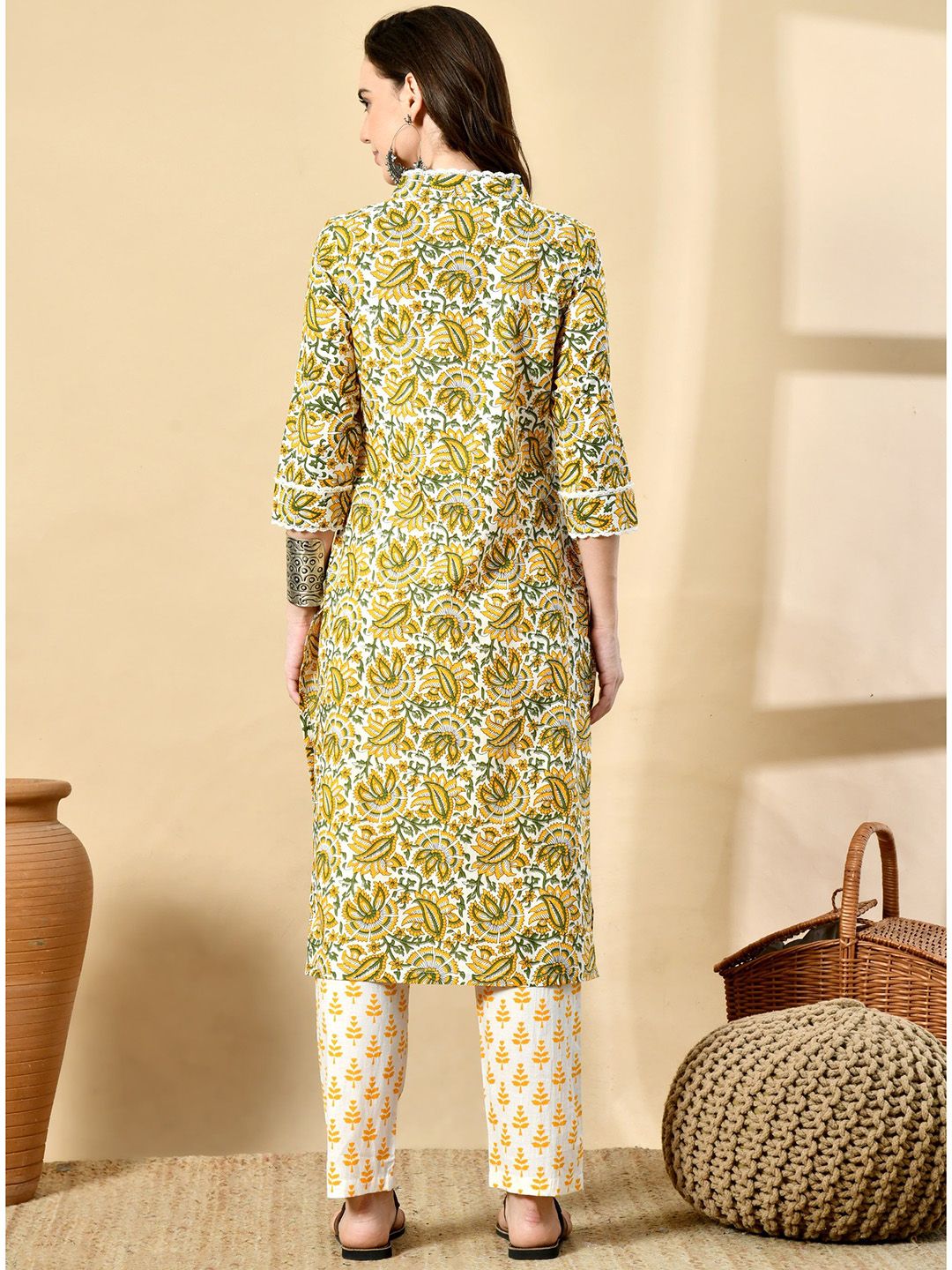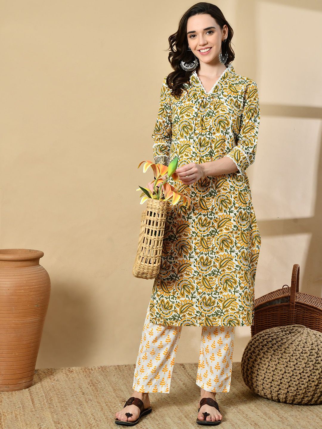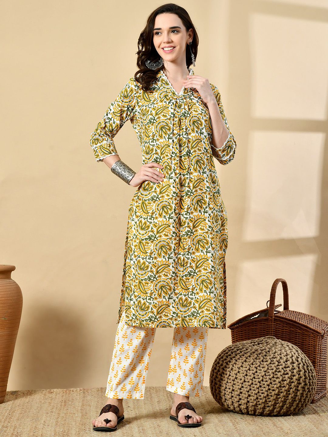 HERE&NOW Floral Printed V-Neck Pure Cotton Straight Kurta With Trousers