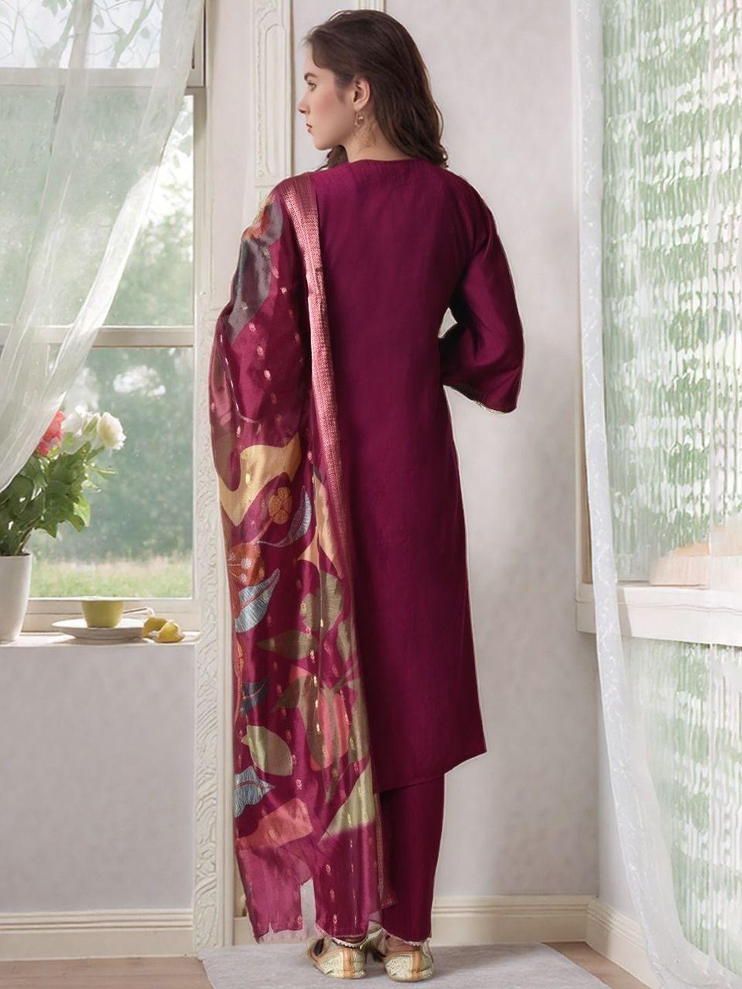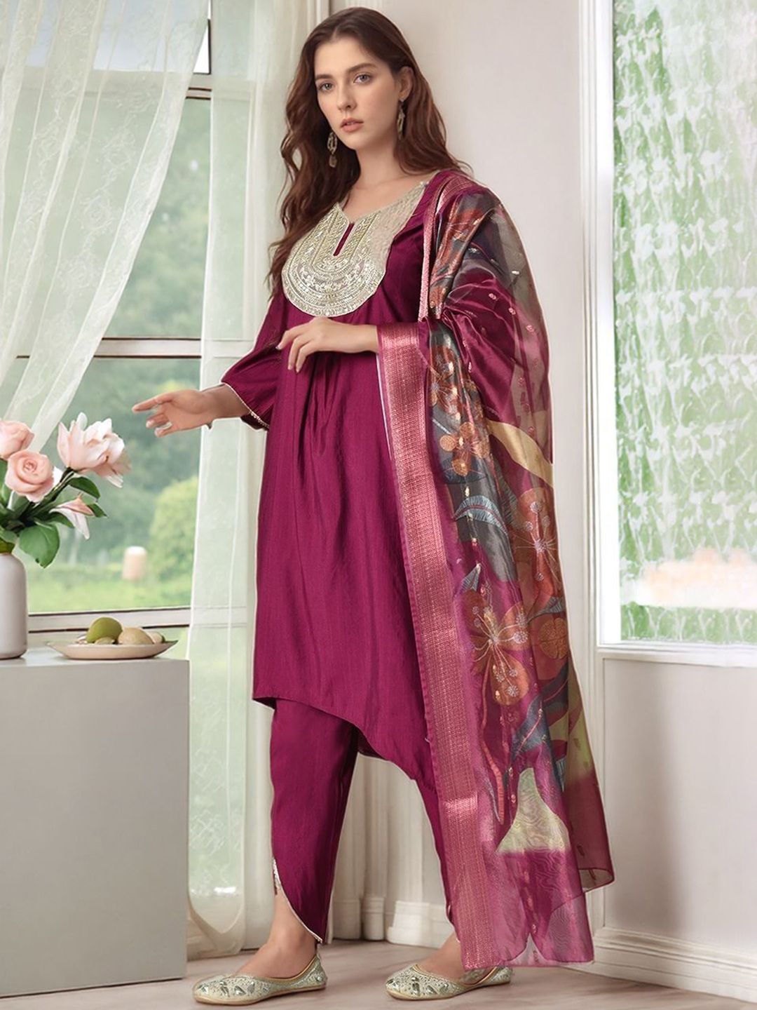 HERE&NOW Floral Yoke Design Notch Neck Sequinned A-Line Kurta With Dhoti Pants And Dupatta