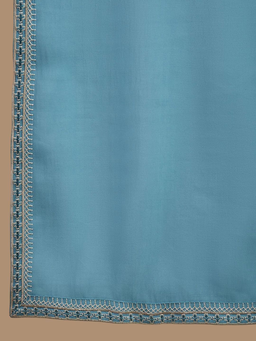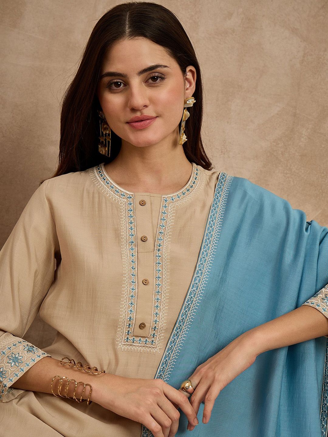 HERE&NOW Floral Yoke Design Thread Work Straight Kurta With Trousers And Dupatta