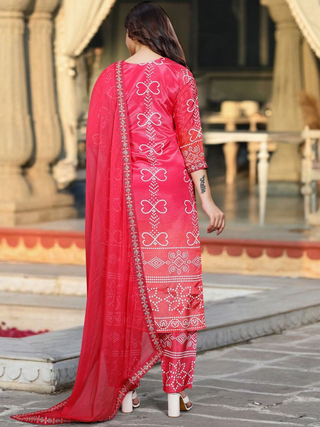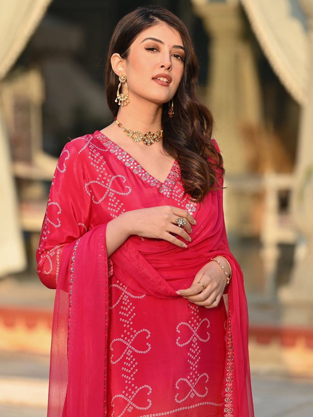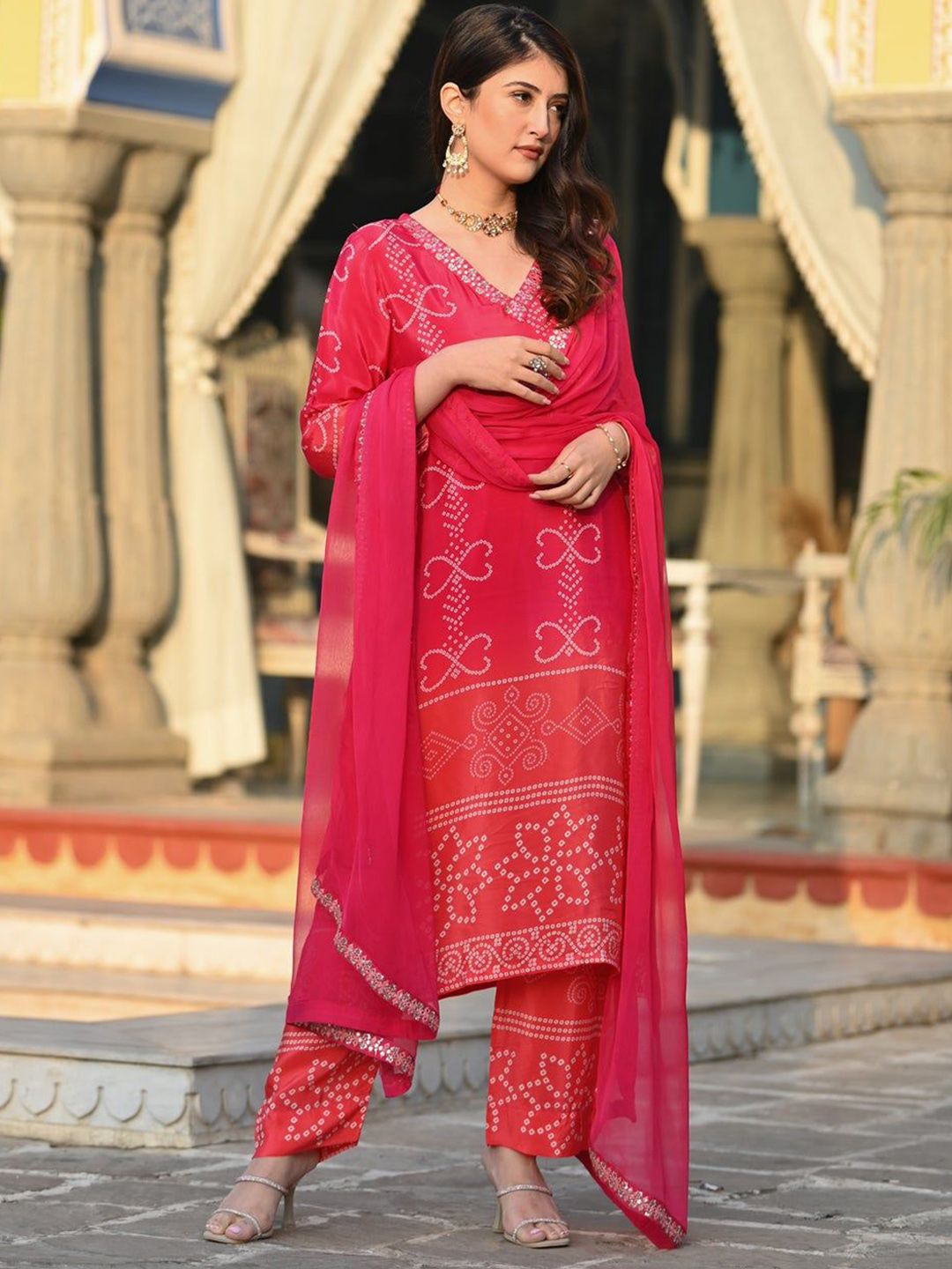 HERE&NOW Women Bandhani Printed Kurta with Trousers & Dupatta