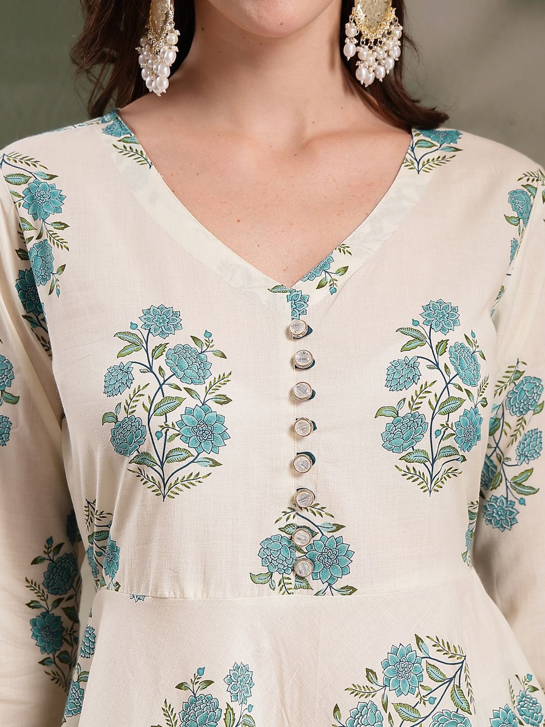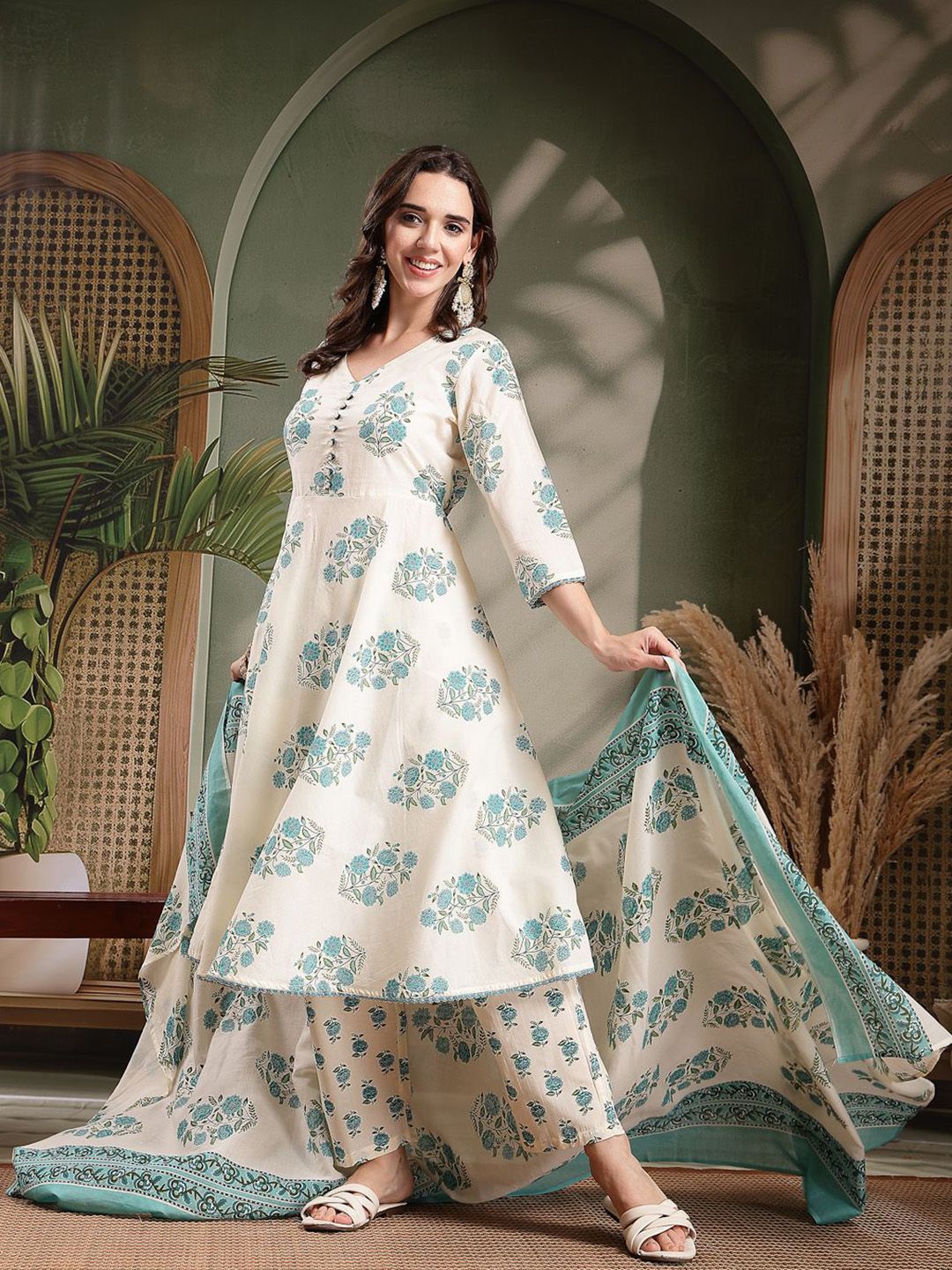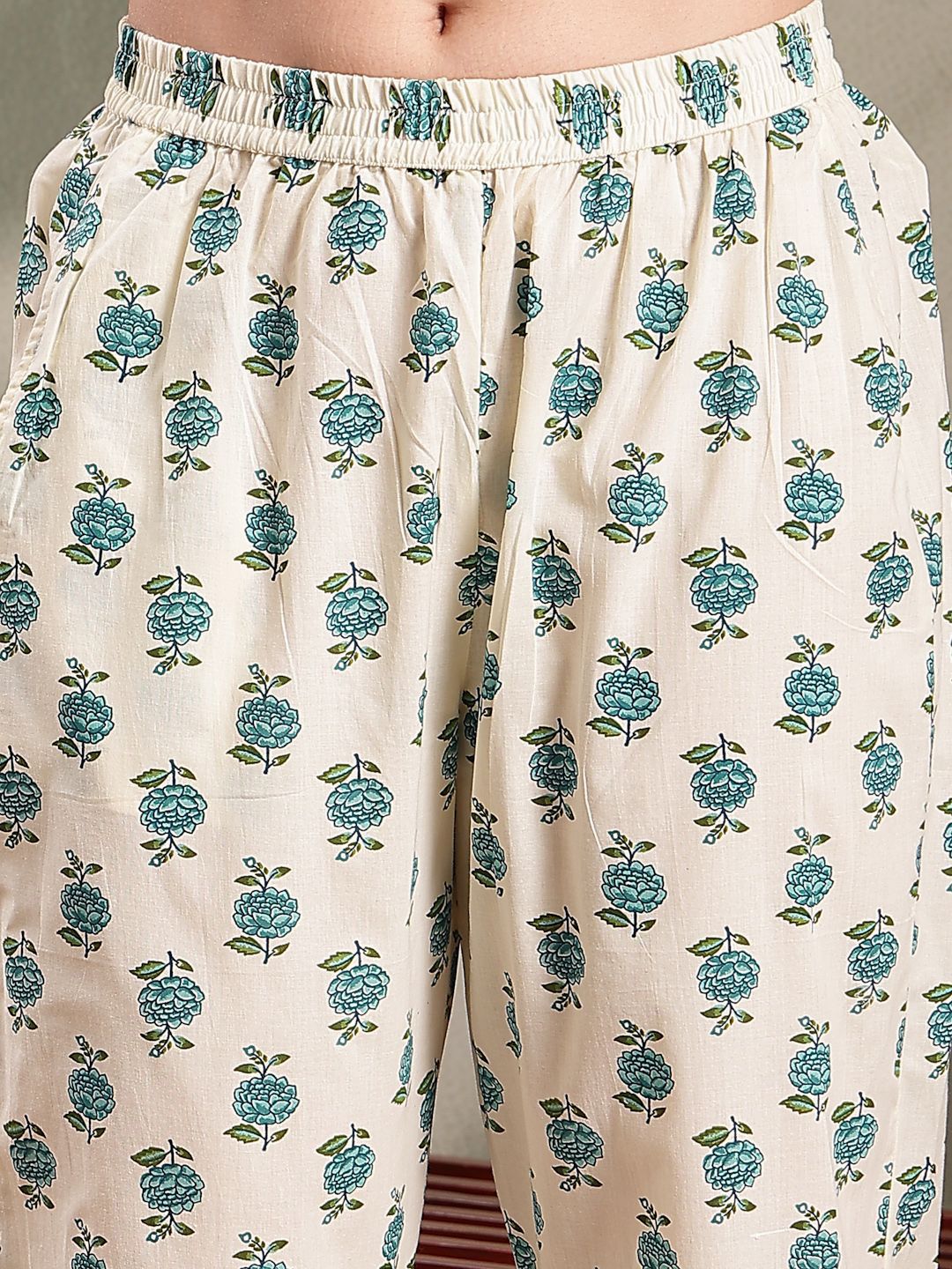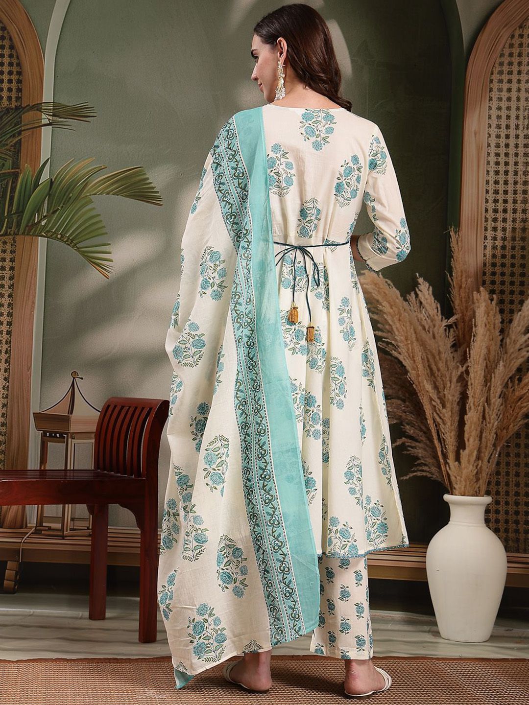 HERE&NOW Women Floral Pleated Pure Cotton Kurta & Trousers With Dupatta