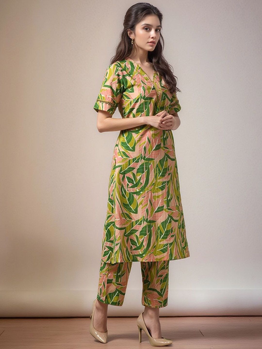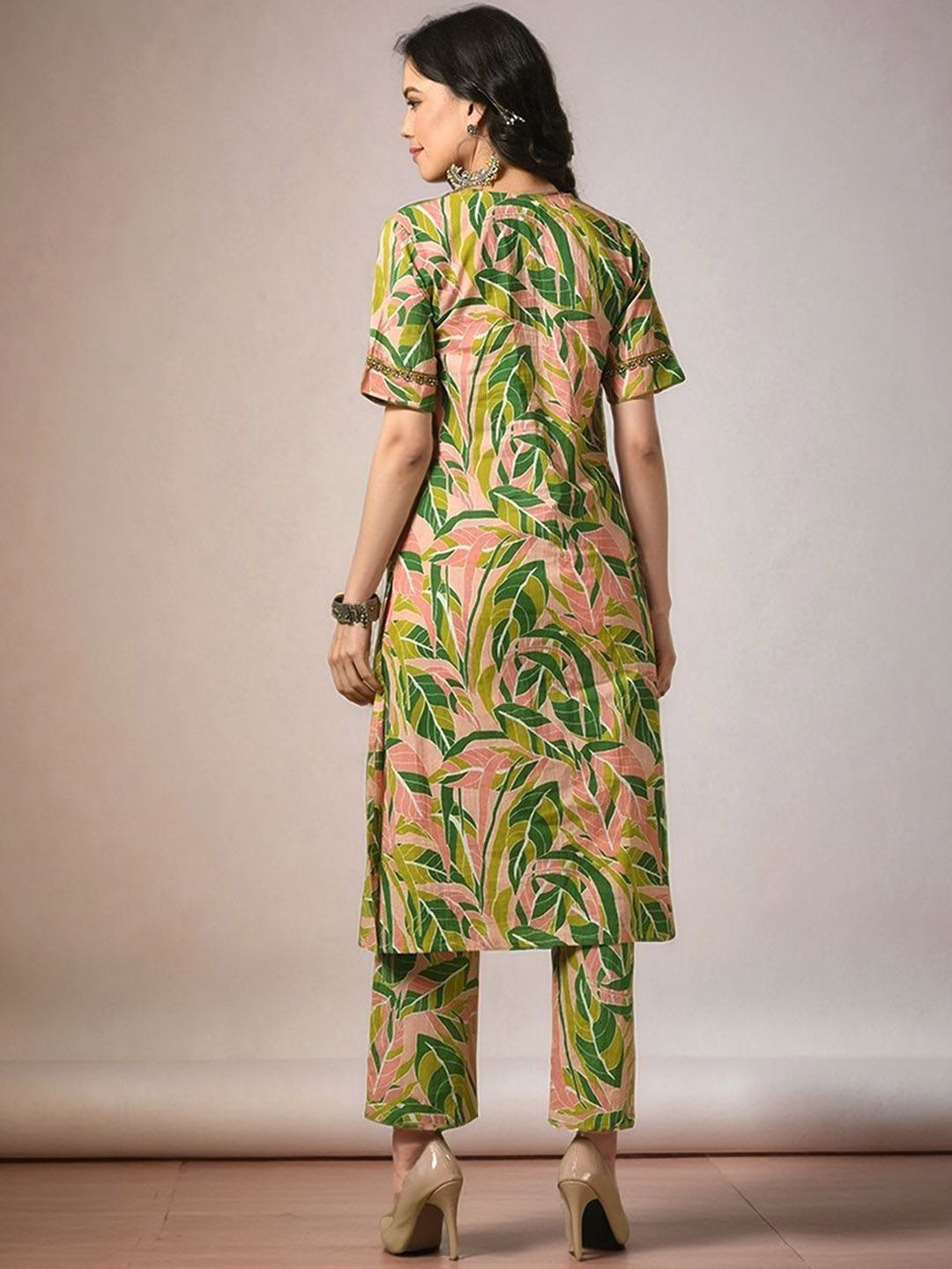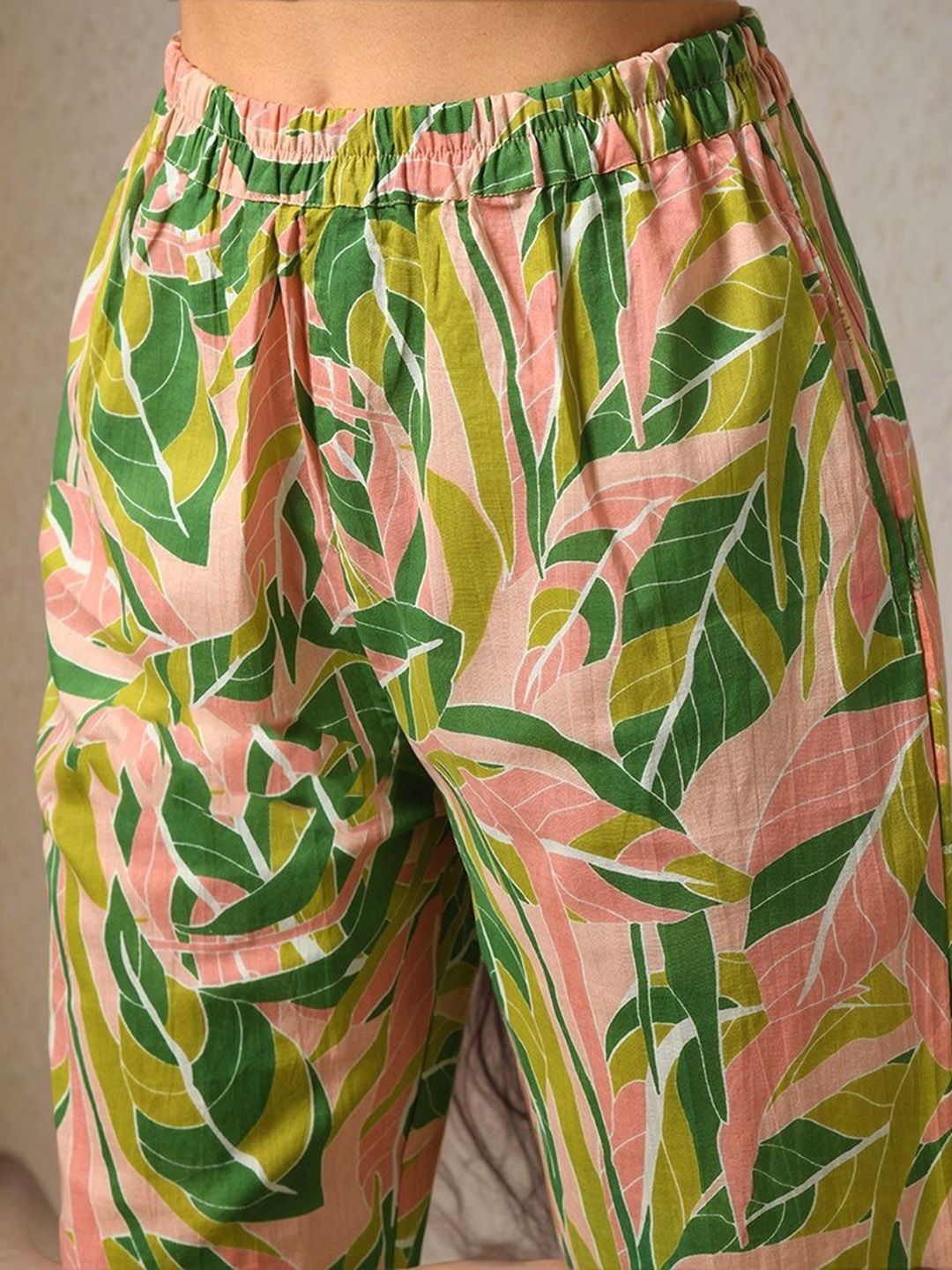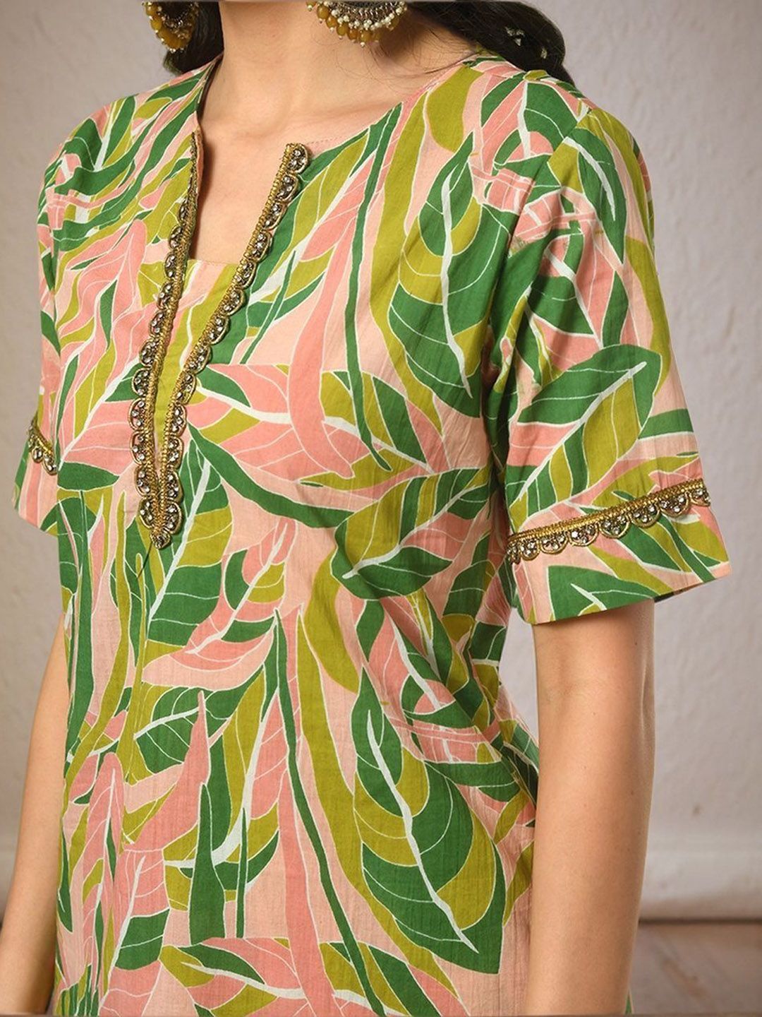 HERE&NOW Women Floral Printed Regular Beads and Stones Pure Cotton Kurta with Trousers