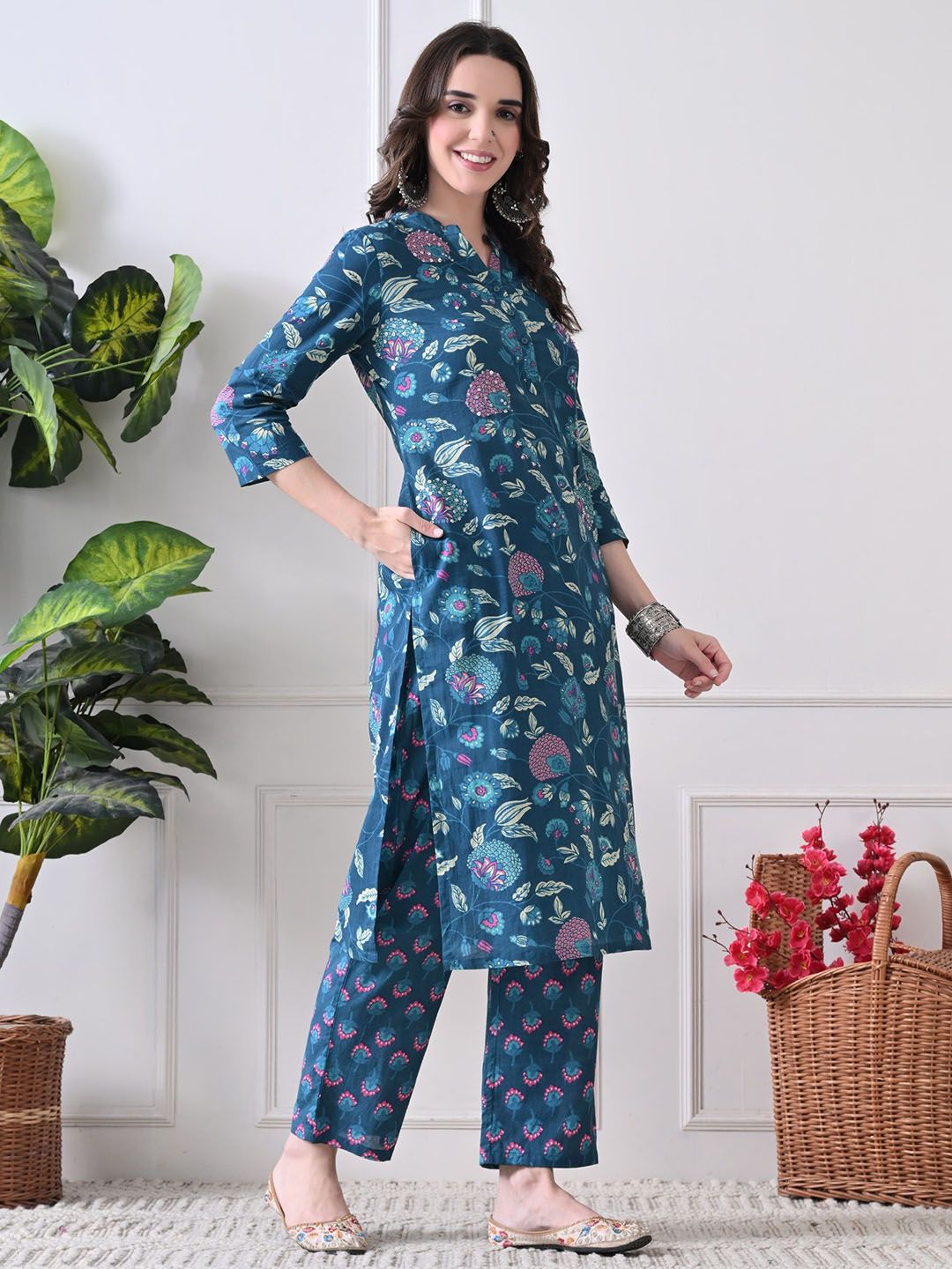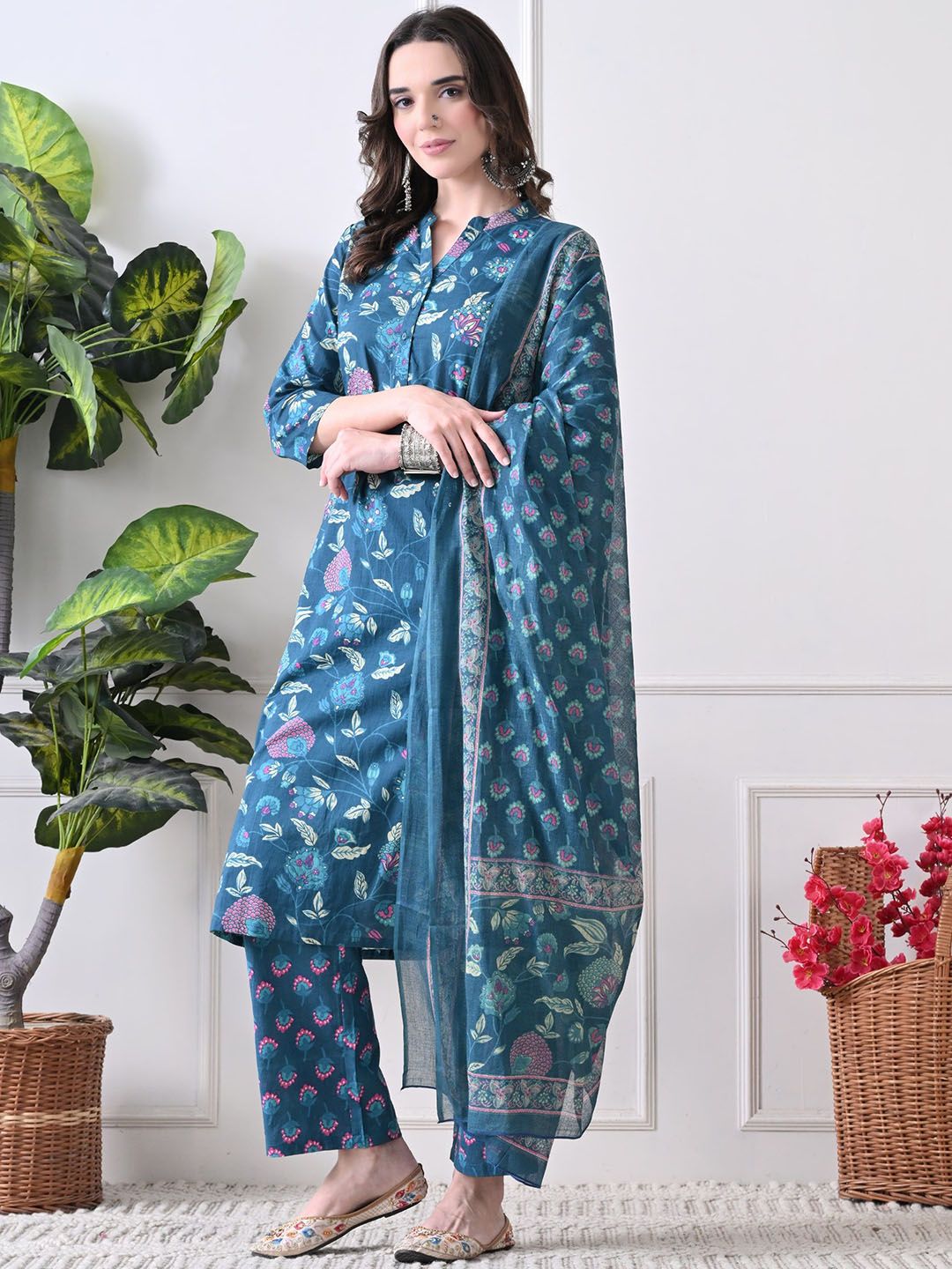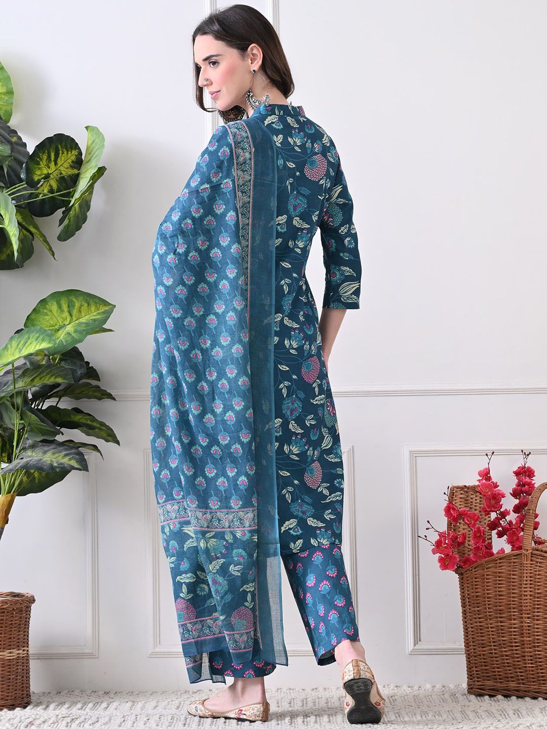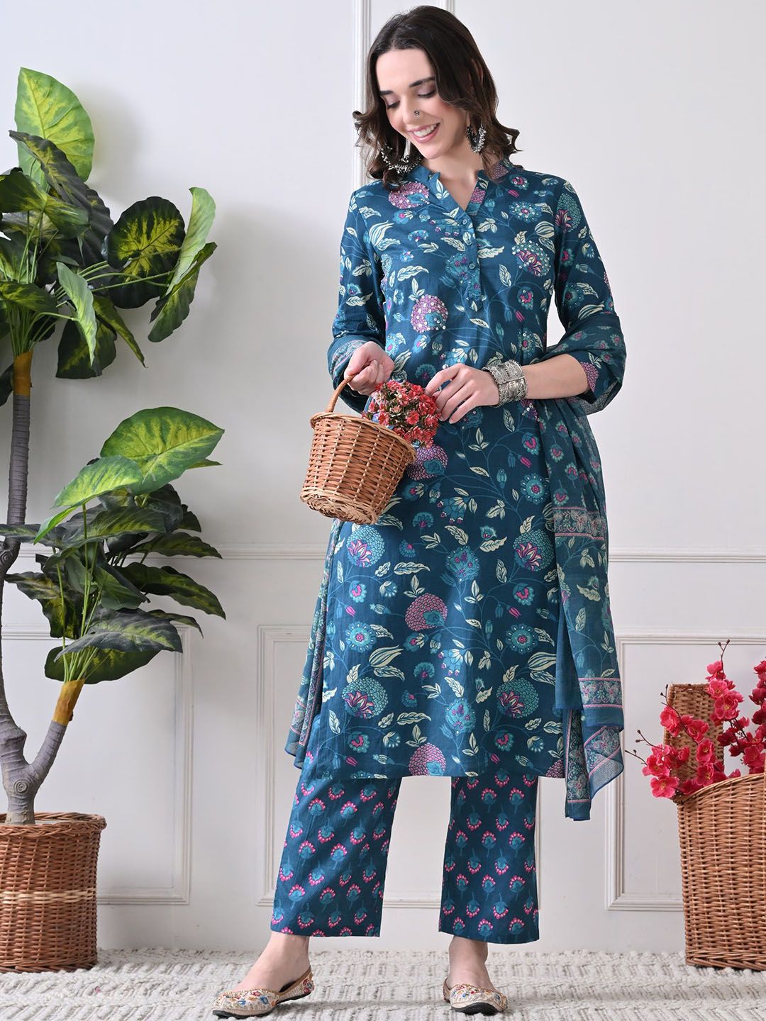 HERE&NOW Women Floral Printed Regular Pure Cotton Kurta with Trousers & Dupatta