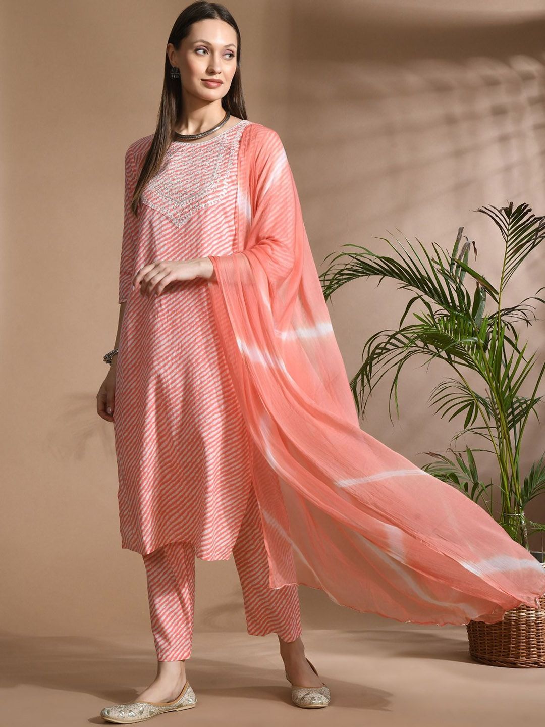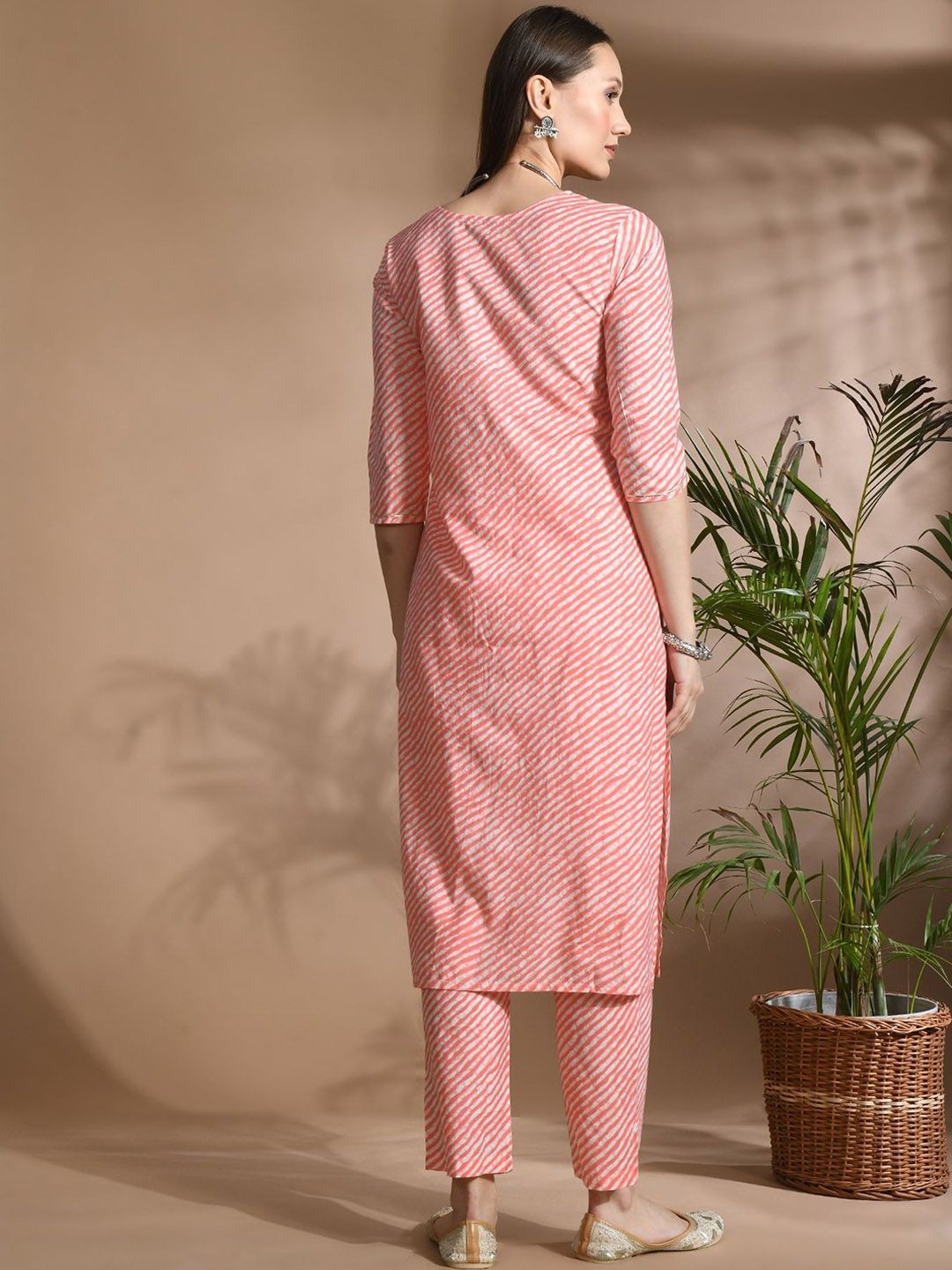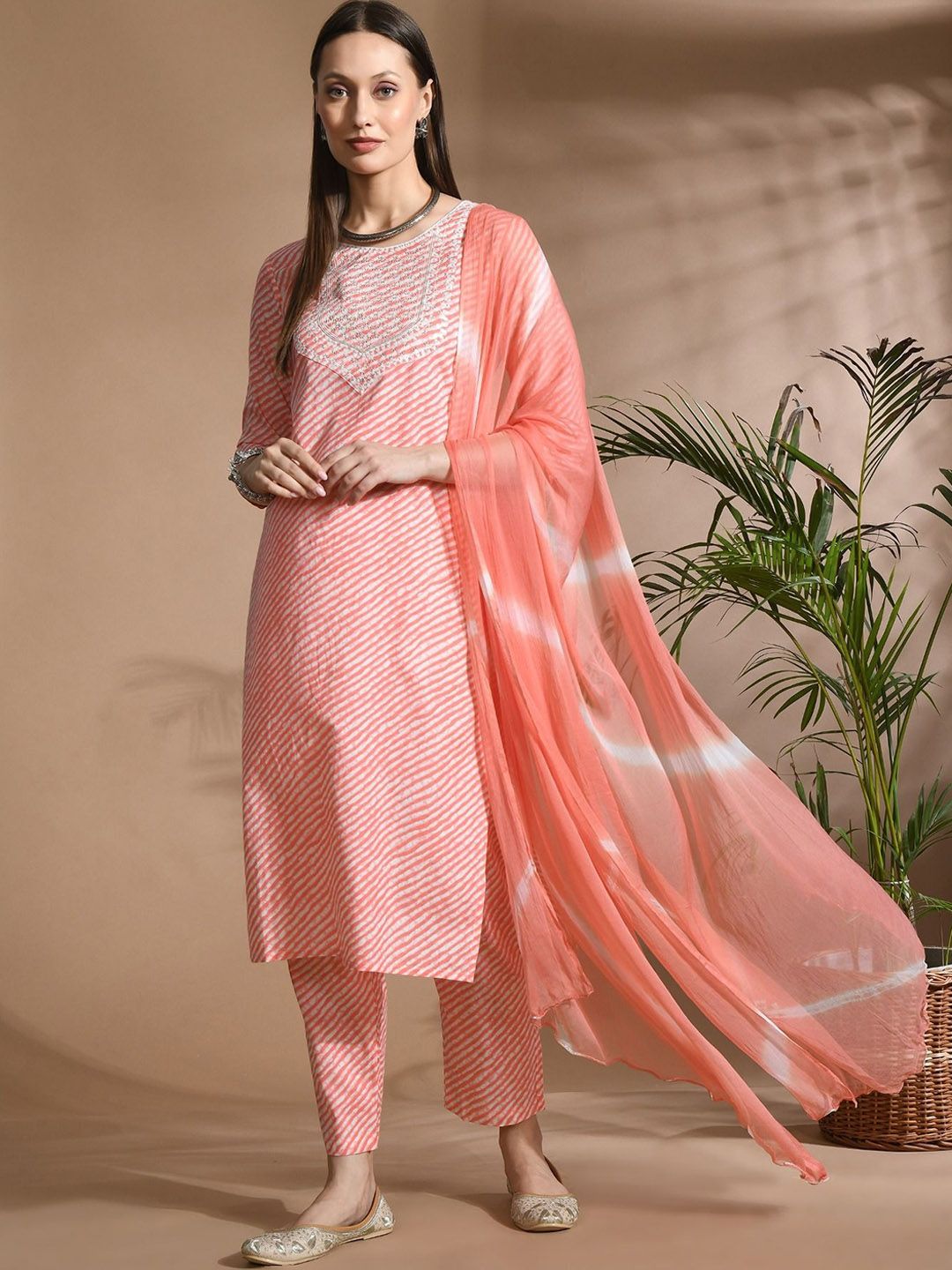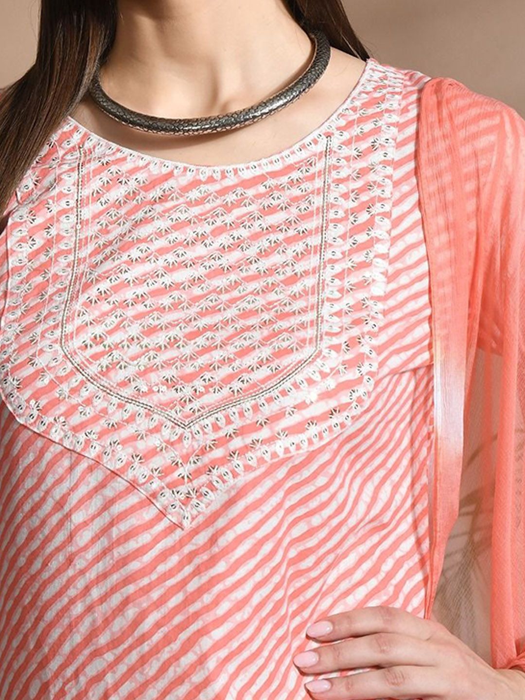 HERE&NOW Women Leheriya Striped Cotton Kurta with Trousers & Dupatta