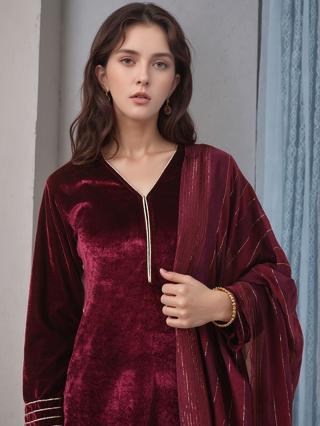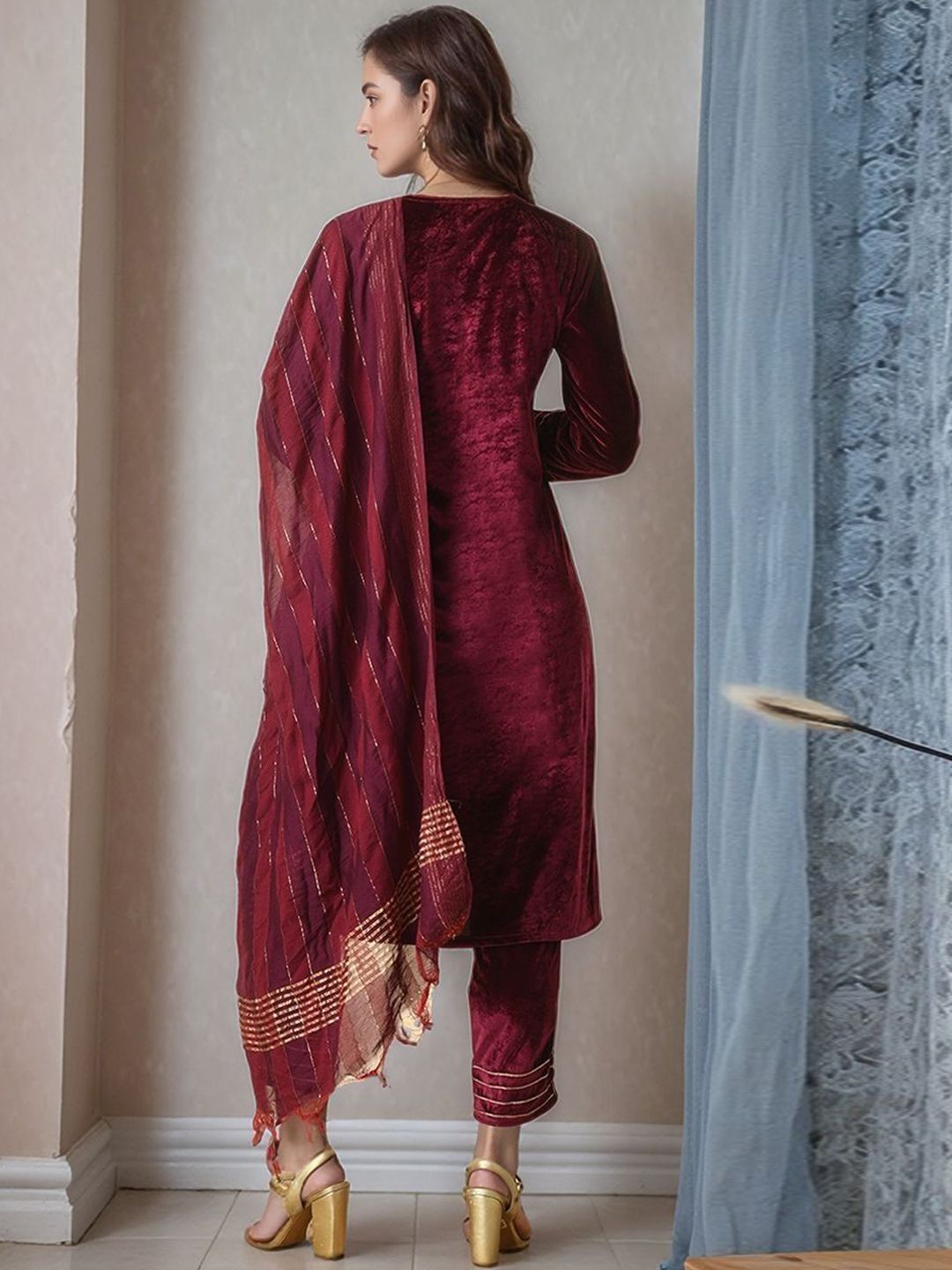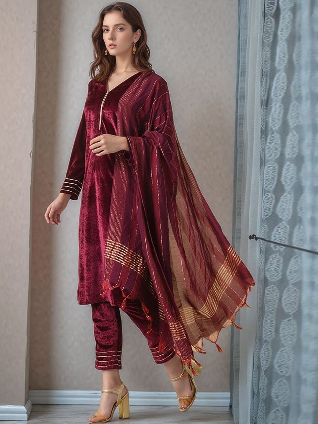 HERE&NOW Women Solid A-Line Kurta with Trousers & Dupatta