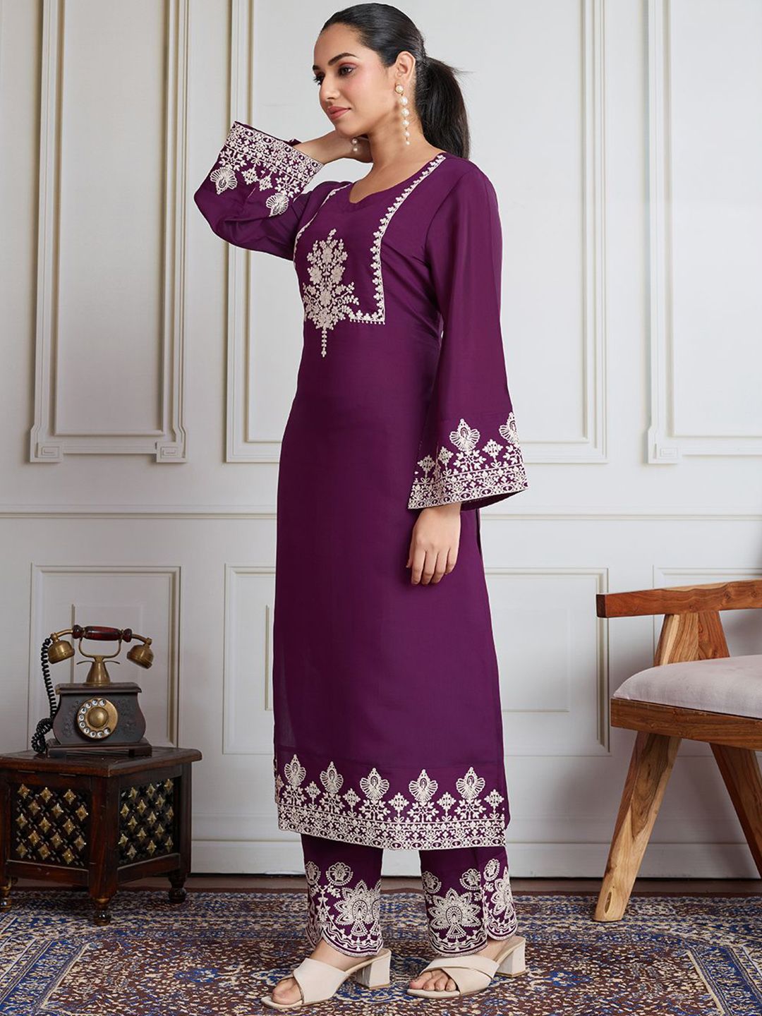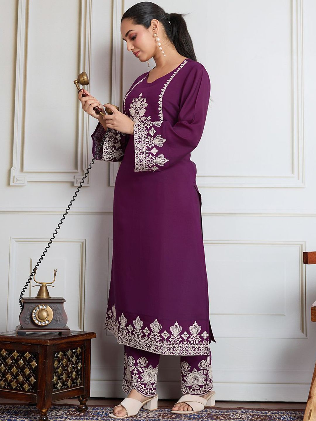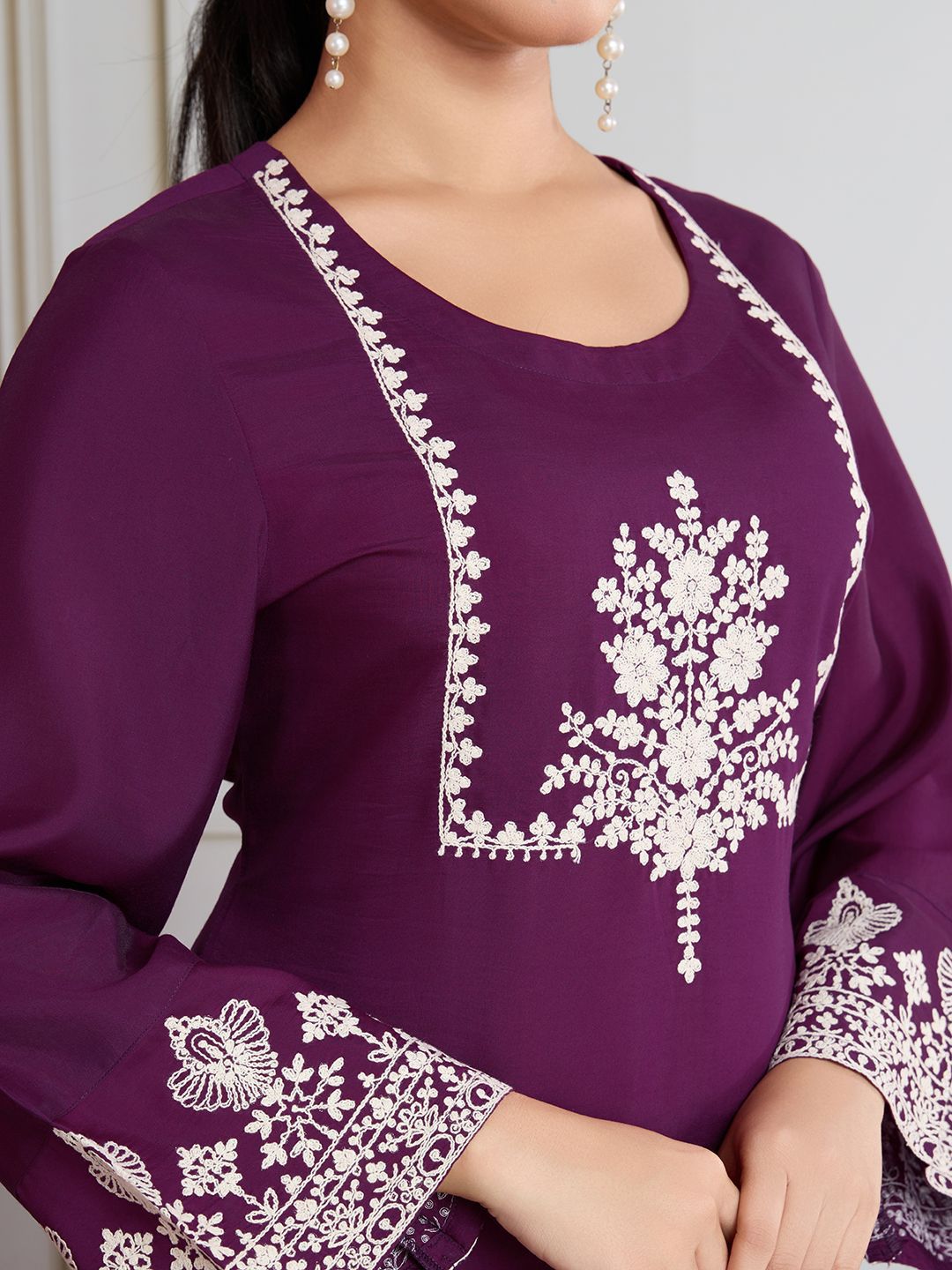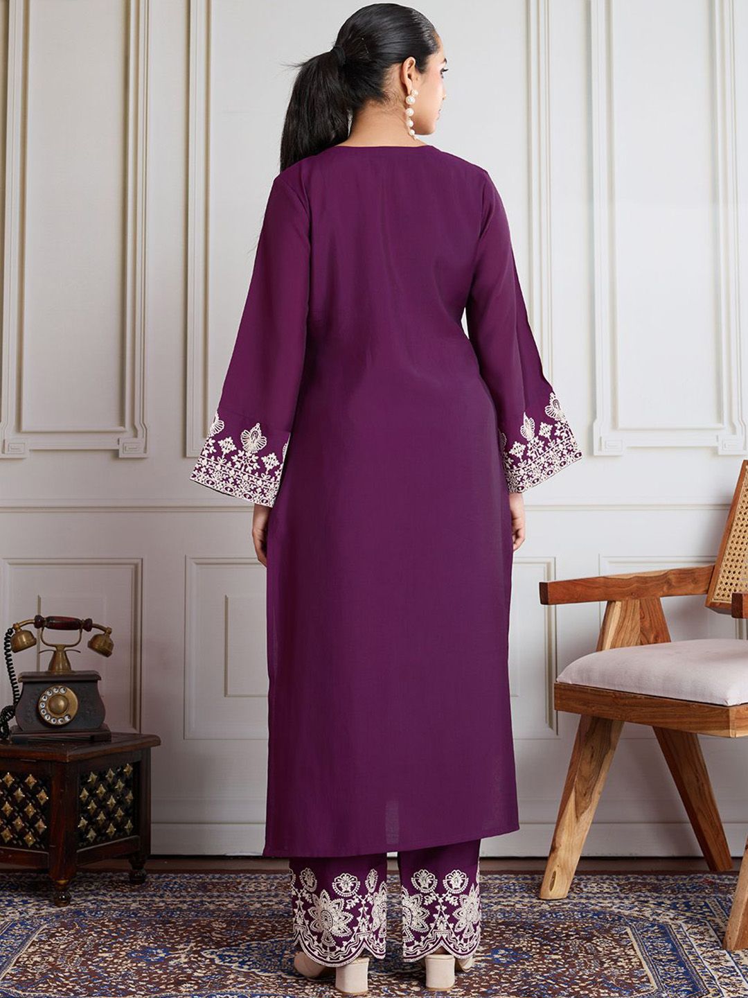 House of Pataudi Floral Embroidered Flared Sleeves Round Neck Straight Kurta With Trouser