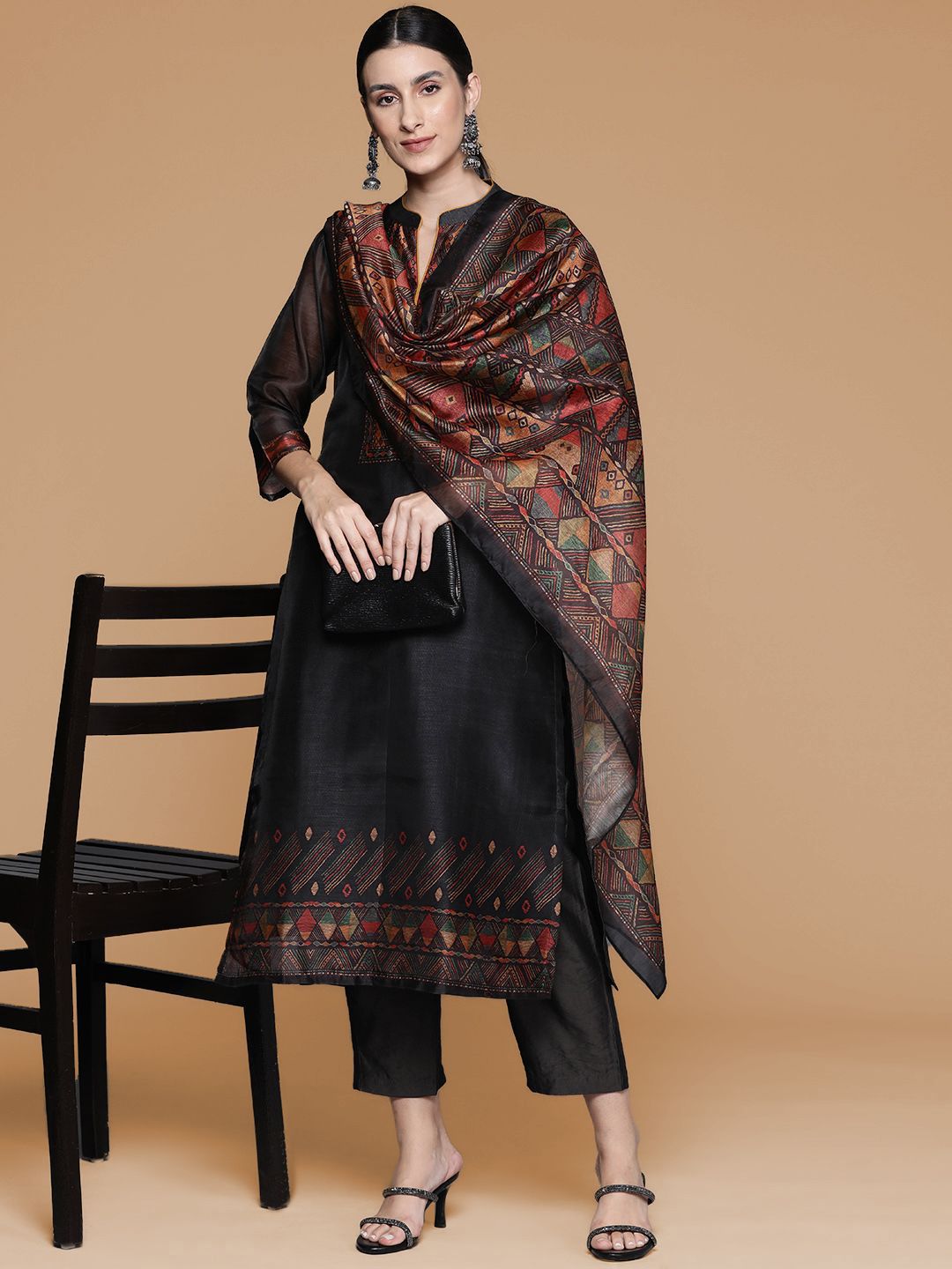 House of Pataudi Women Geometric Printed Straight Kurta With Trousers & Dupatta