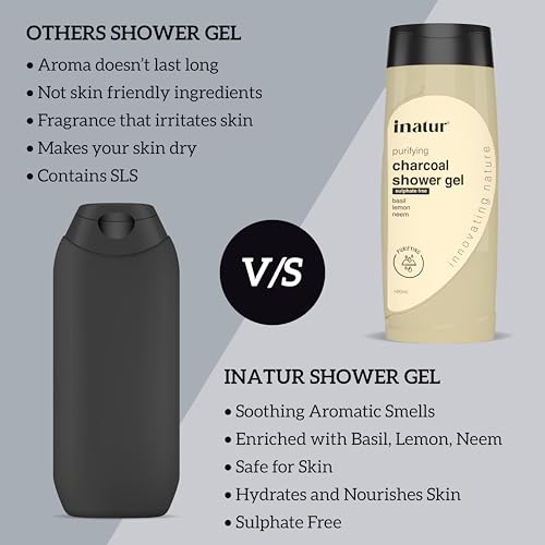 DEEP CLEANSING & DETOXIFYING SHOWER GEL: Infused with Activated Charcoal, this body wash effectively removes dirt, oil, and toxins, leaving your skin deeply cleansed and refreshed without stripping natural moisture. Perfect for oily, sweaty skin, and active lifestyles BALANCES & BRIGHTENS SKIN: Neem soothes and purifies, while Lemon brightens and refreshes, giving your skin a healthy, radiant glow. It helps reduce excess oil and prevent breakouts for a clearer complexion. SULFATE-FREE & GENTLE FORMULA: Free from harsh chemicals, our pH-balanced shower gel is enriched with Basil, Neem, and Lemon to nourish and clarify your skin. Safe for all skin types, including sensitive skin and kids. INVIGORATING FRESH FRAGRANCE: Enjoy a long-lasting, refreshing scent that keeps you feeling energized and smelling great all day. Ideal for gym-goers, outdoor enthusiasts, and anyone with an active routine. VEGAN & CRUELTY-FREE: Made with natural, eco-certified ingredients, our shower gel is dermatologically tested, vegan-friendly, and never tested on animals—kind to your skin and the planet