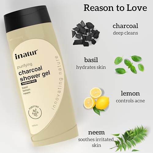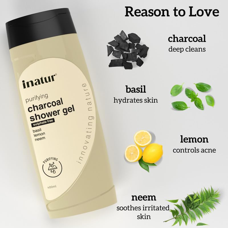 inatur Charcoal Shower Gel | Detoxifying Body Wash | Deep Cleansing & Purifying | Sulfate-Free & Natural | With Basil, Neem & Lemon | Ideal for All Skin Types | Refreshing & Hydrating | 400ml