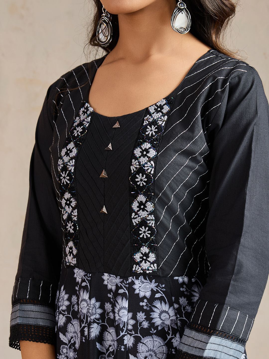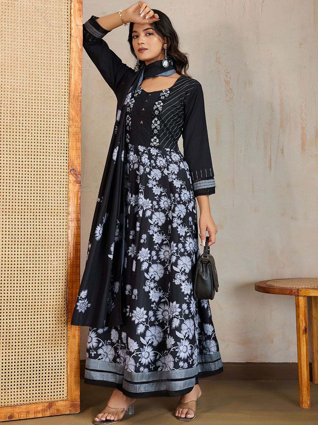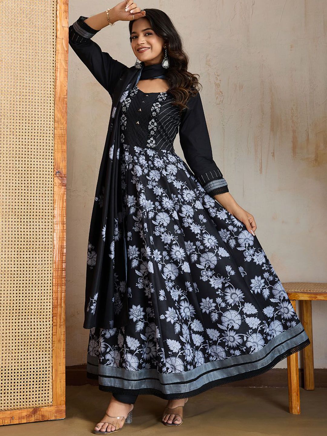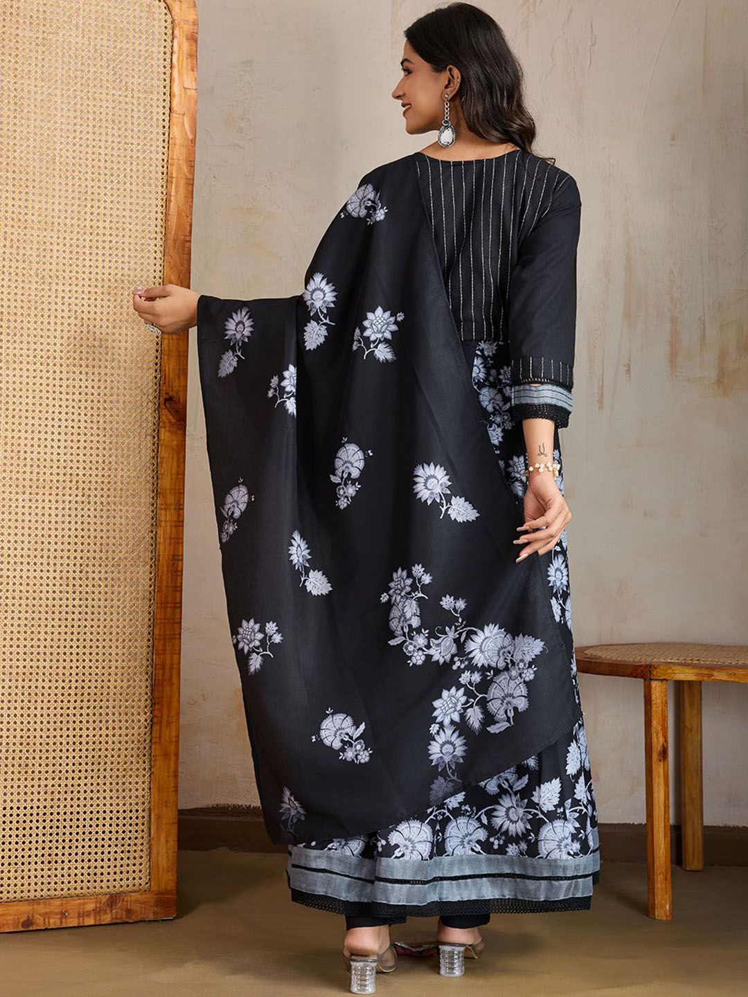 Inddus Floral Printed Round Neck Thread Work Kurta With Trousers & Dupatta