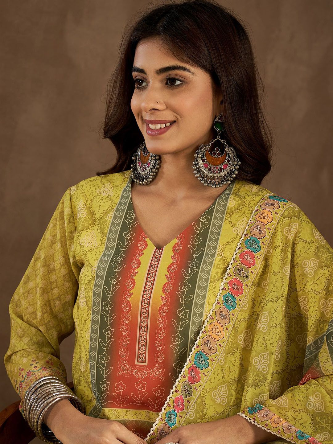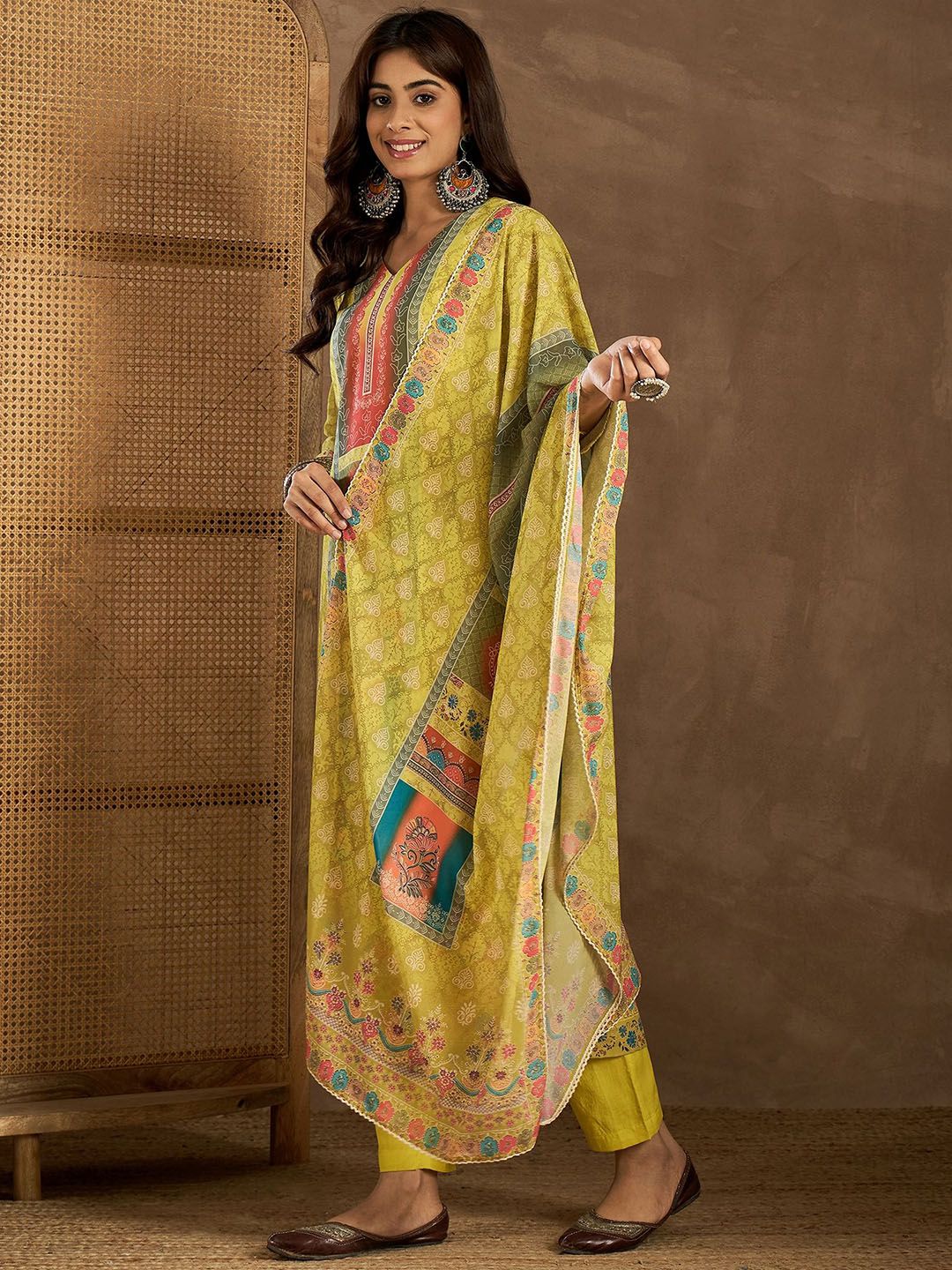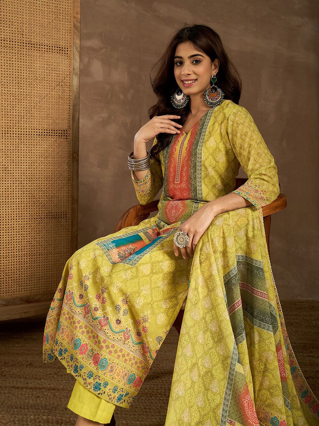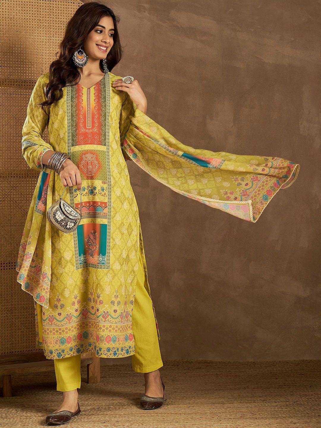 Inddus Floral Printed Straight Kurta With Trousers & Dupatta