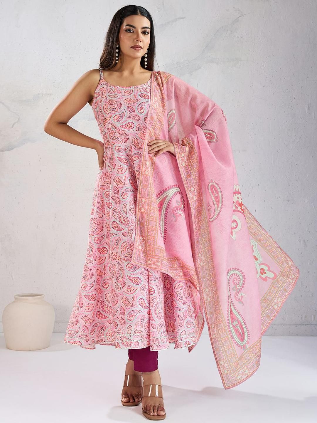 Inddus Paisley Printed A Line Gotta Patti Kurta With Trousers & With Dupatta