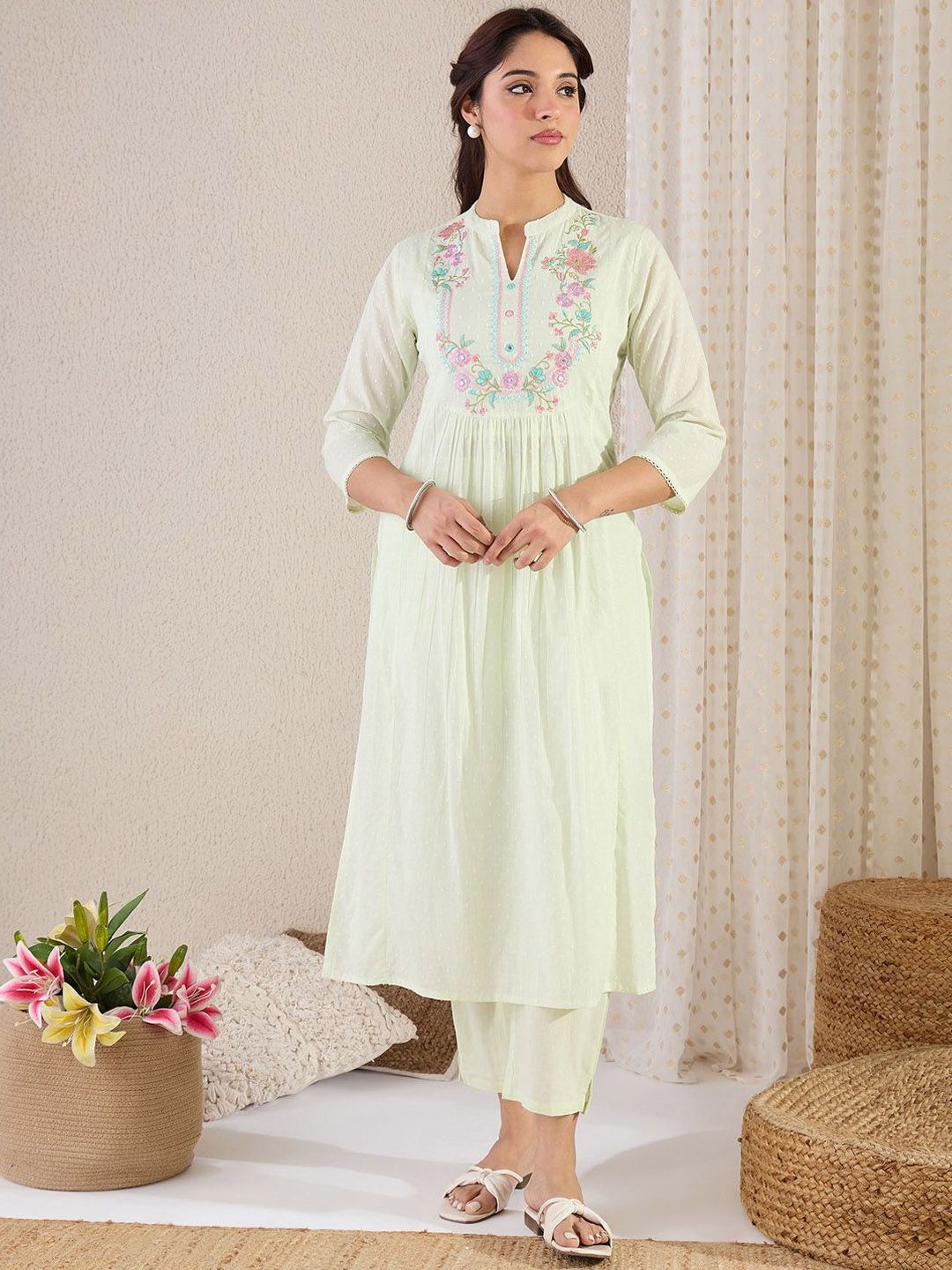 Indo Era Embroidered Mandarin Collar A-Line Pure Cotton Kurta With Trousers And Dupatta