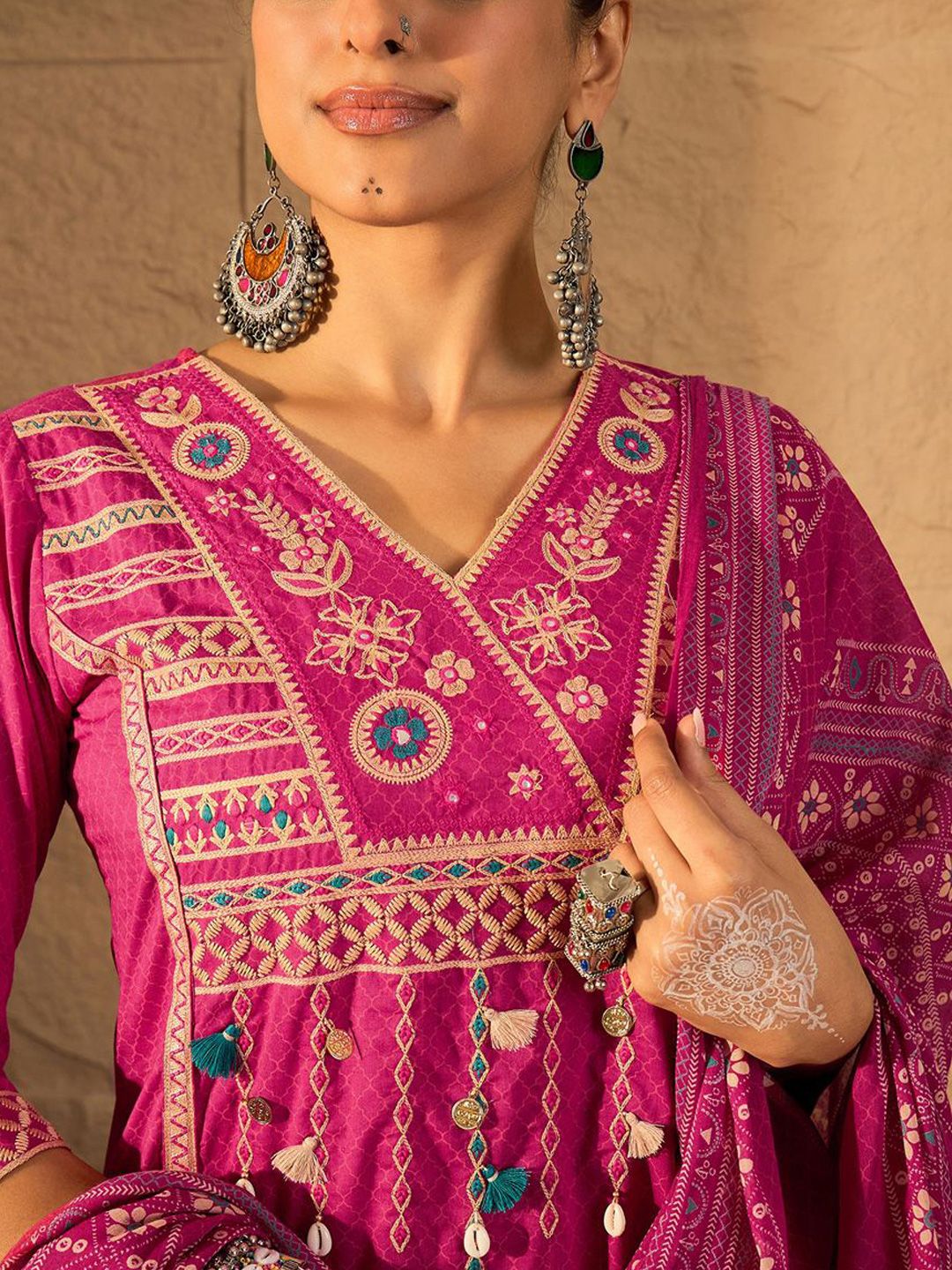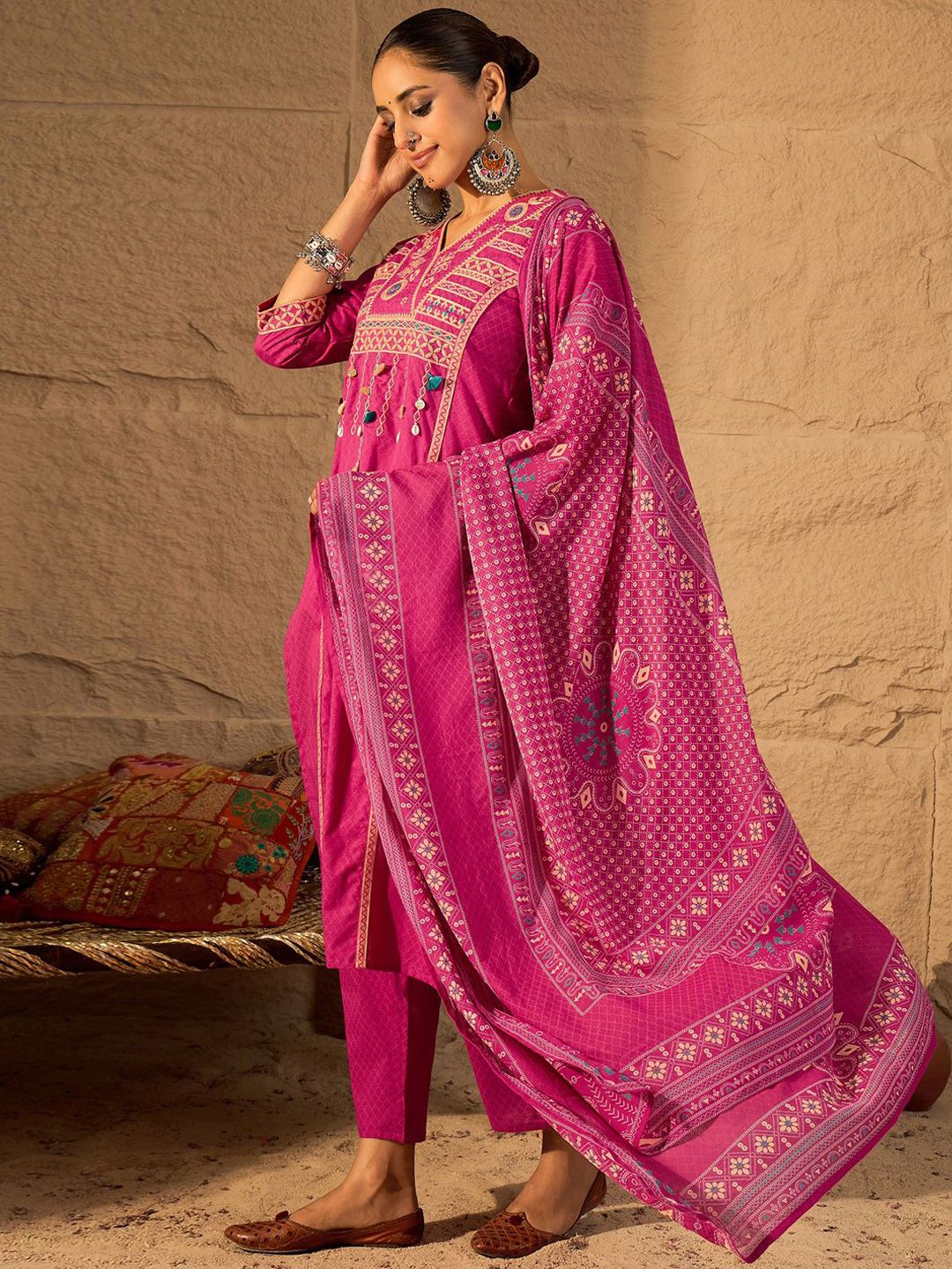 Indo Era Embroidered V-Neck Pure Cotton Straight Kurta With Trousers And Dupatta