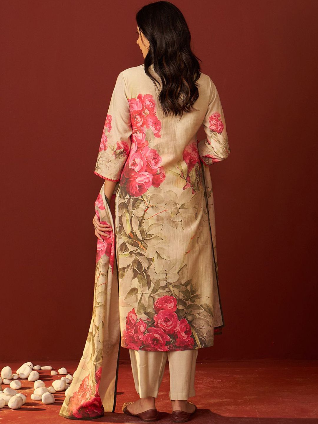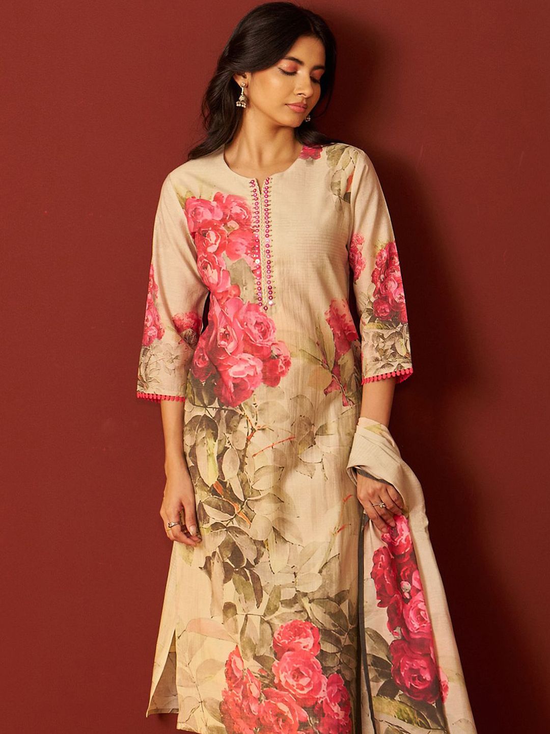Indo Era Floral Printed Notch-Neck Straight Kurta With Trousers And Dupatta
