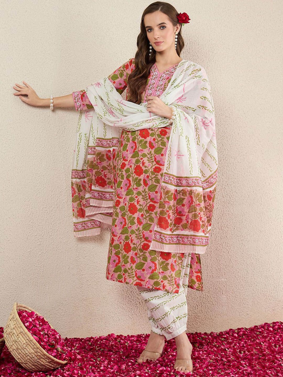 Indo Era Floral Printed Pure Cotton V-Neck Straight Kurta with Salwar and Dupatta