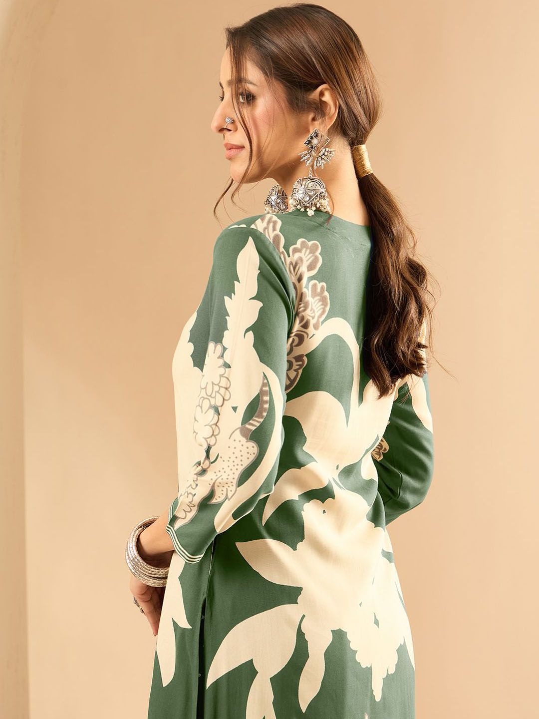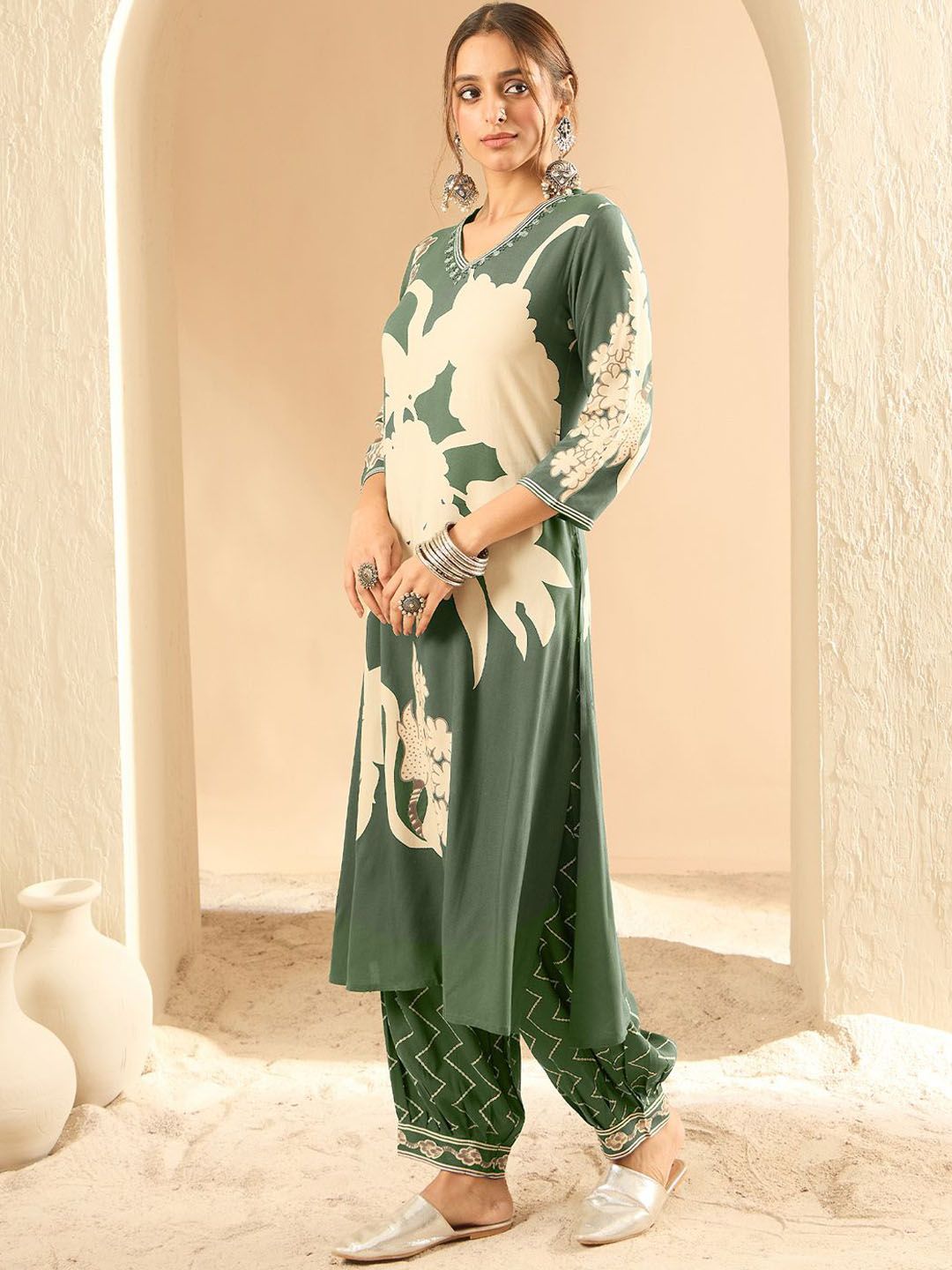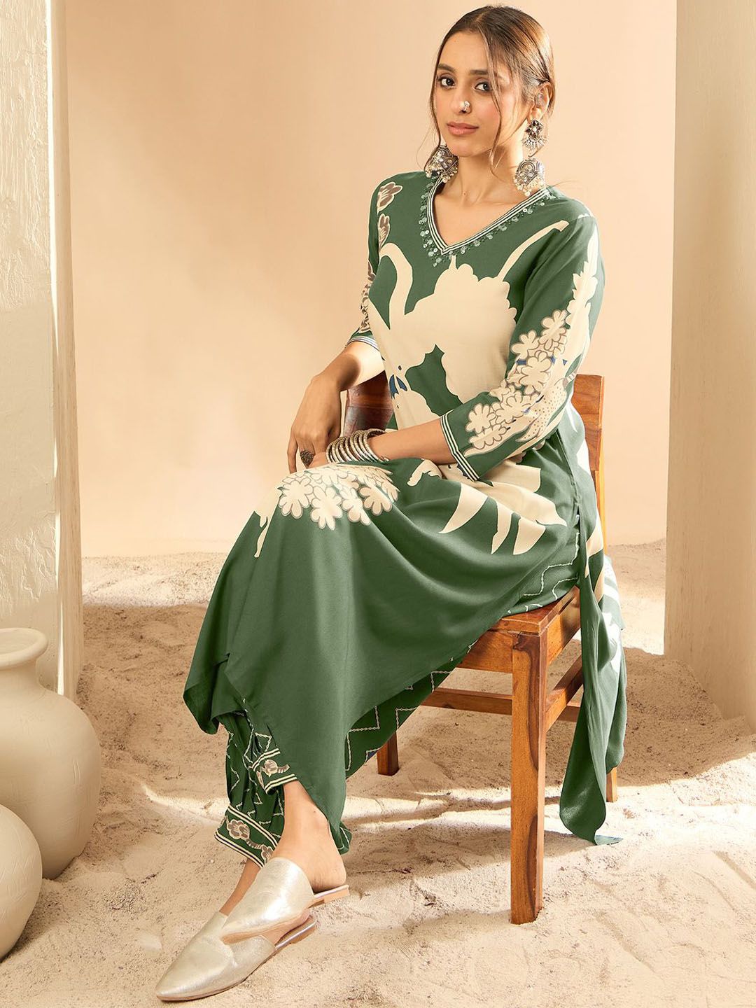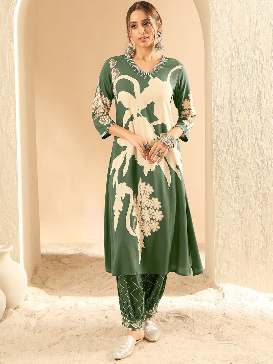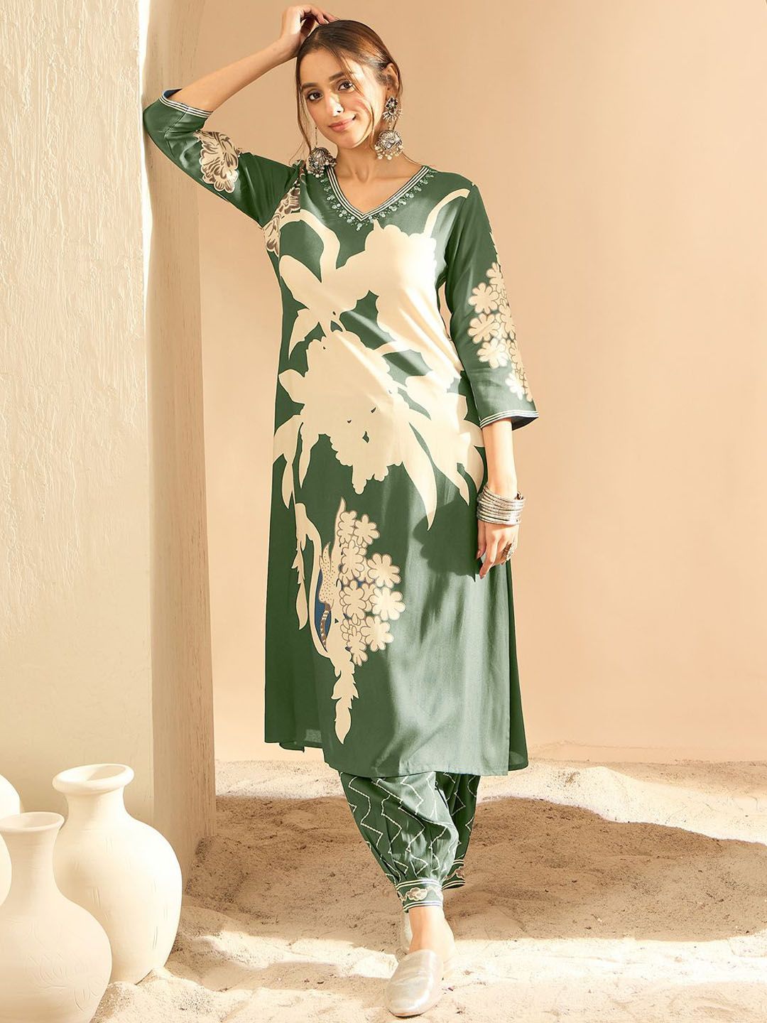 Indo Era Floral Printed V-Neck Beads and Stones Screen Technique Kurta With Salwar