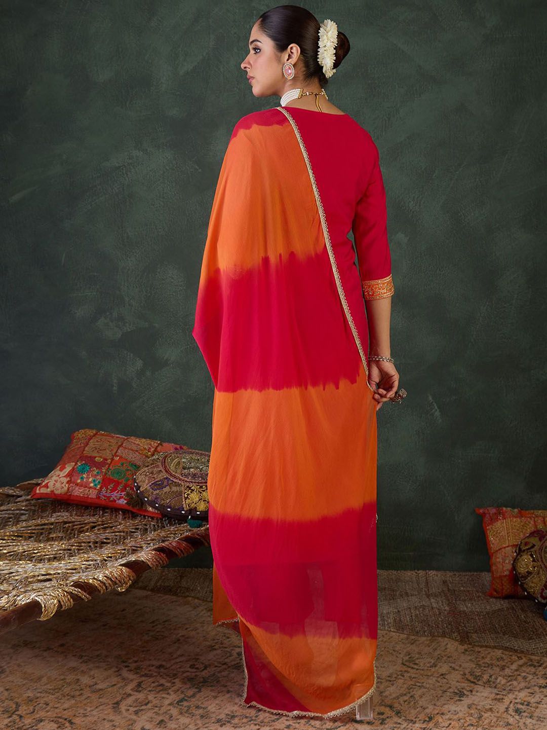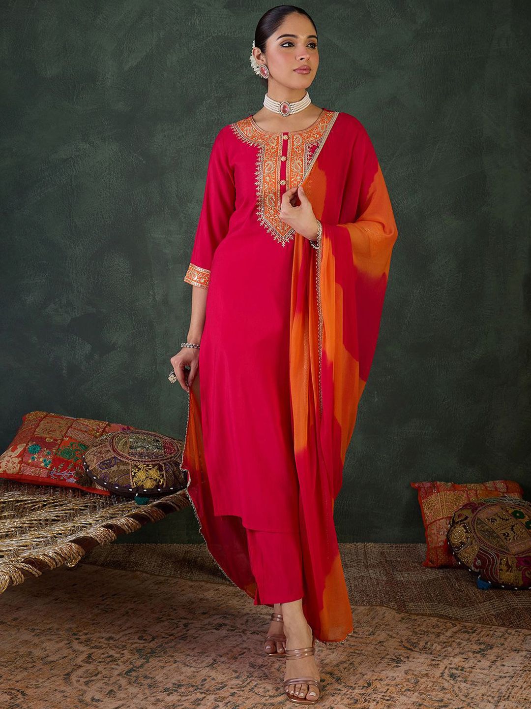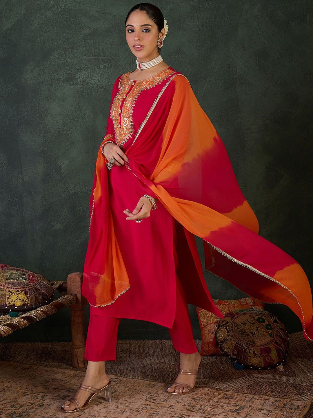 Indo Era Floral Yoke Design Round Neck Zari Straight Kurta With Trousers & Dupatta