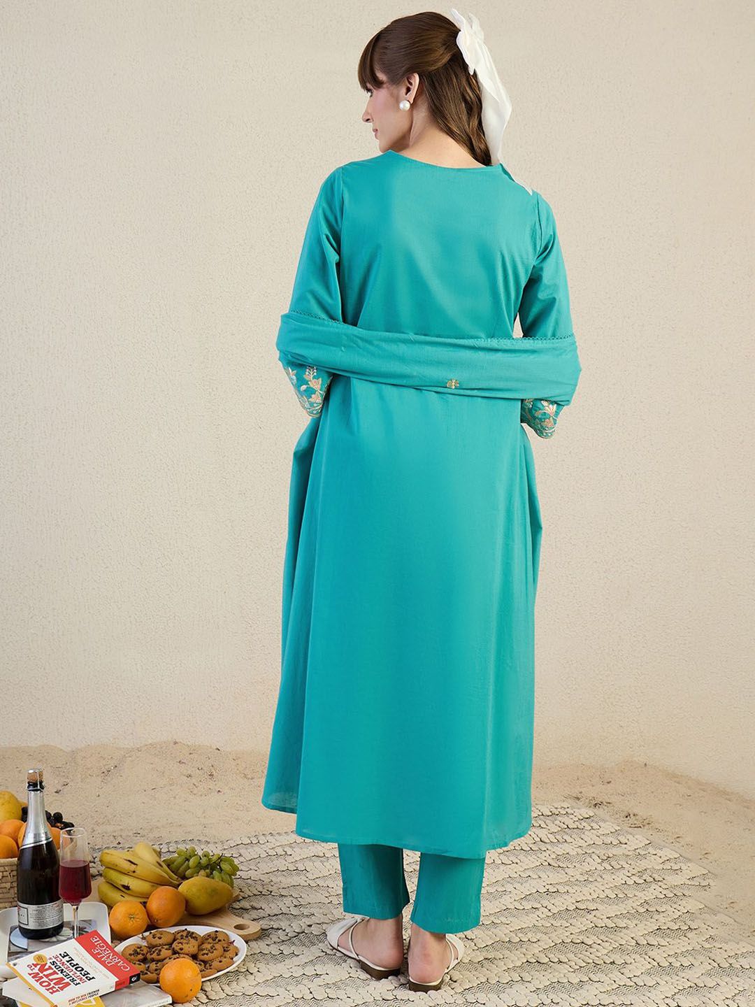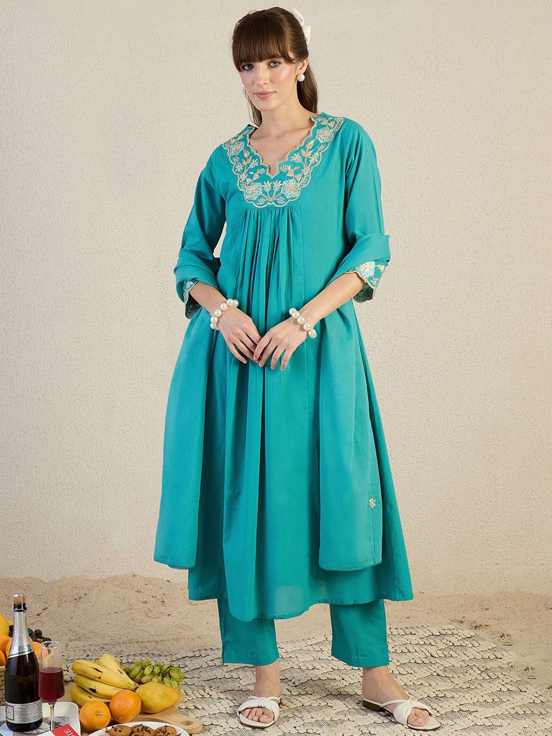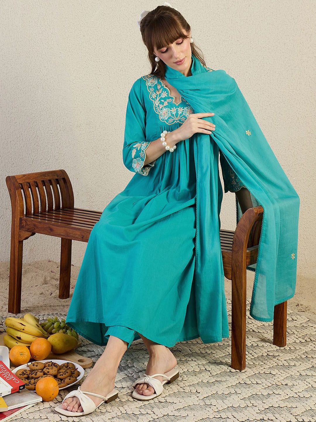 Indo Era Women Embroidered Beads & Stones Pure Cotton Kurta with Trousers & Dupatta