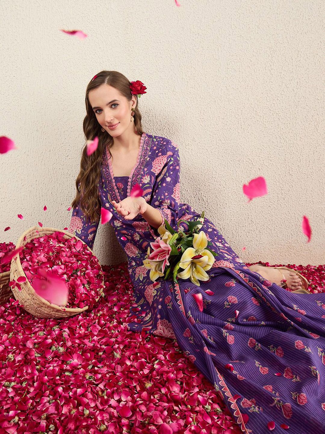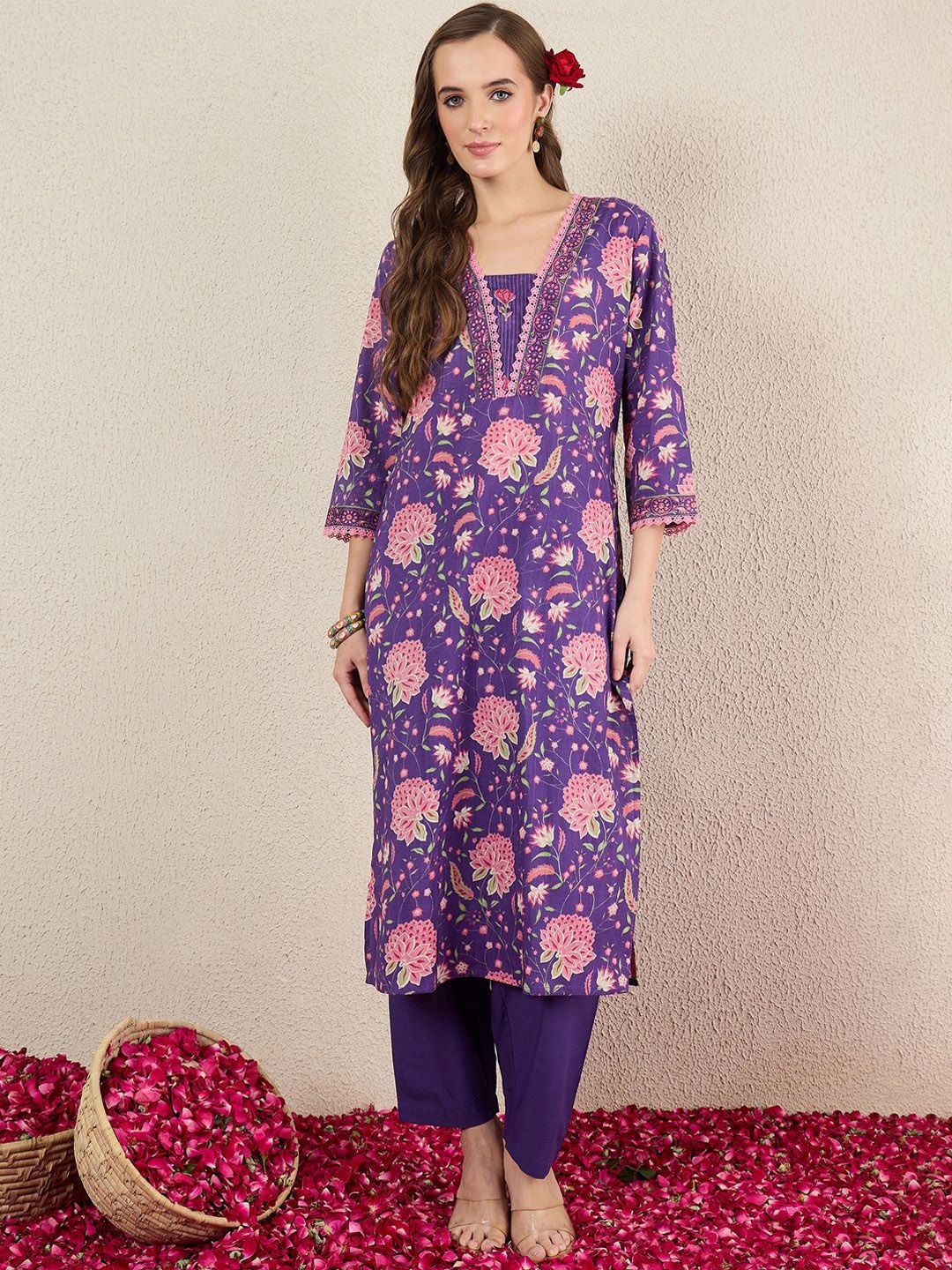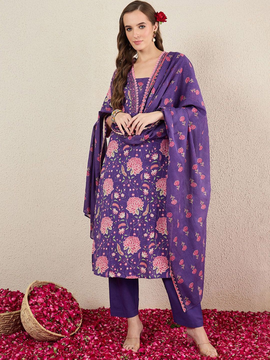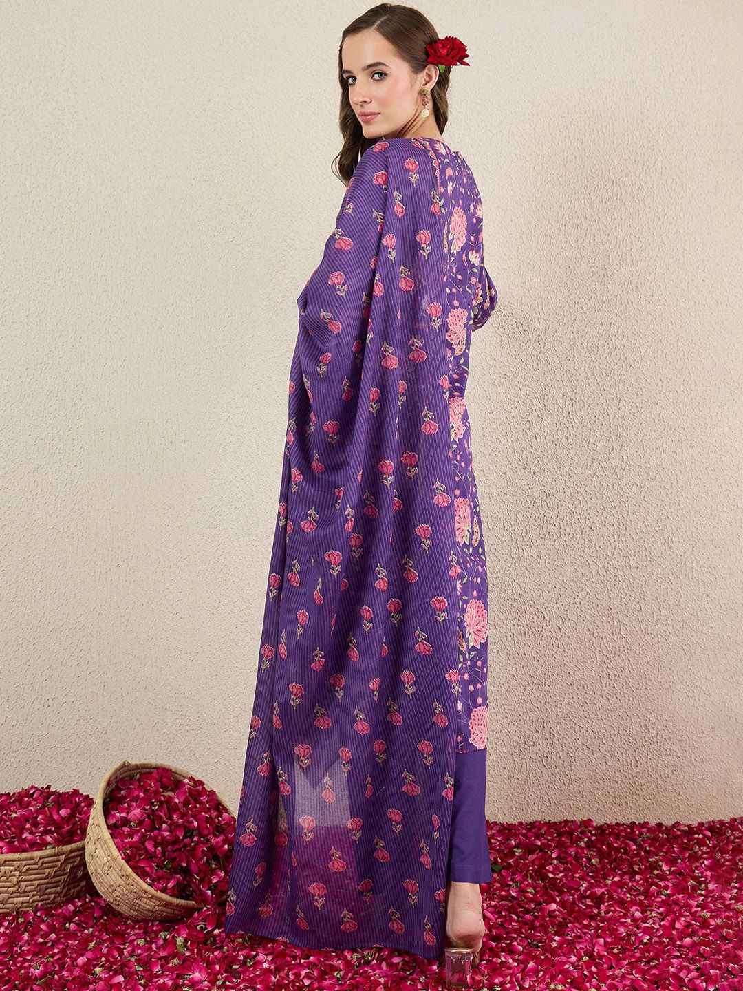 Indo Era Women Floral Printed Cotton Kurta with Trousers & Dupatta