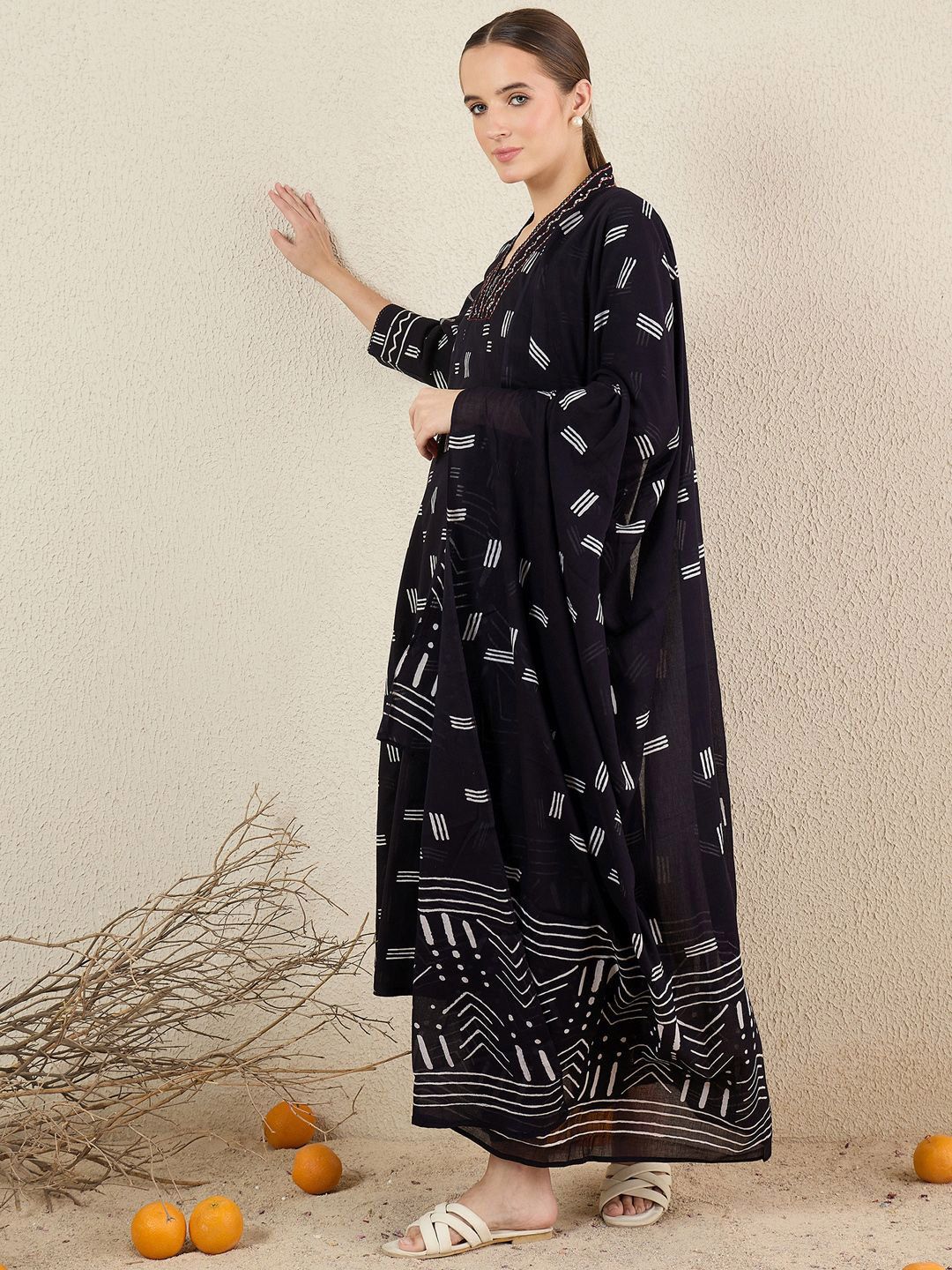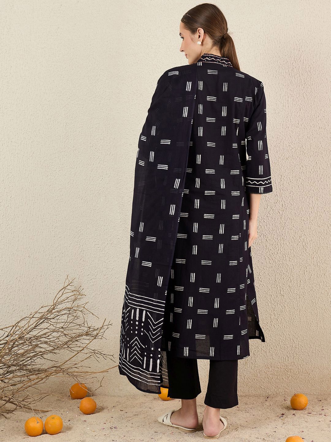 Indo Era Women Striped Cotton Kurta with Trousers & Dupatta
