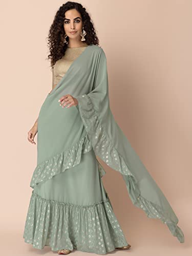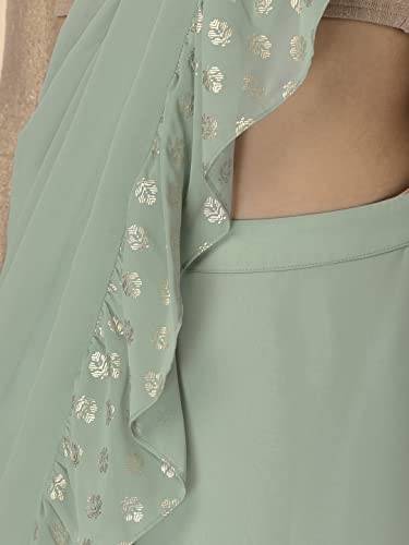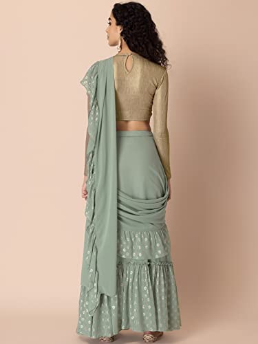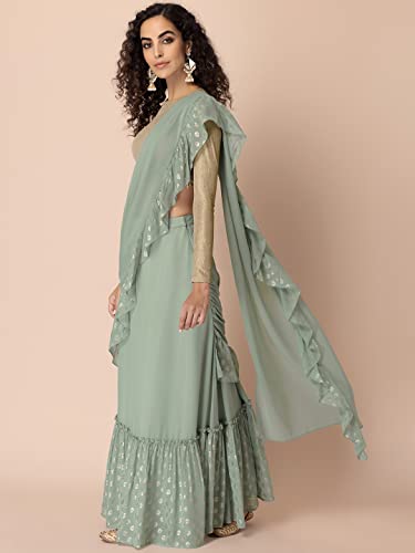 Indya Women's Polyester Floral Foil Frilled Pre-Stitched Saree