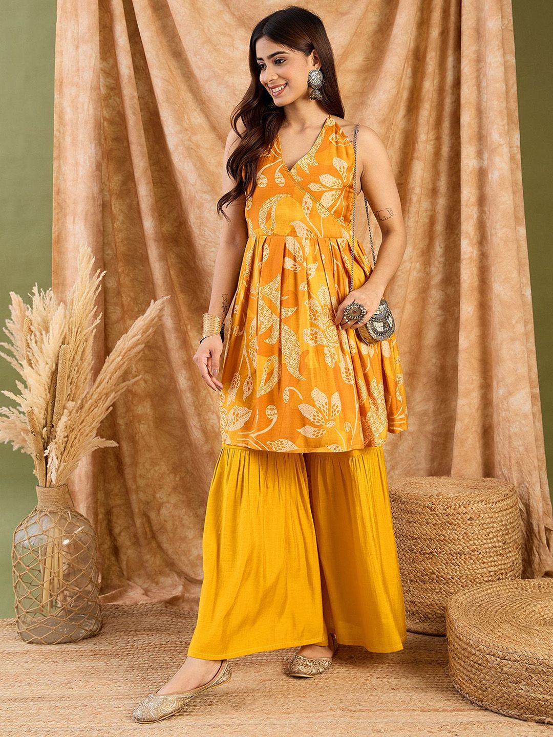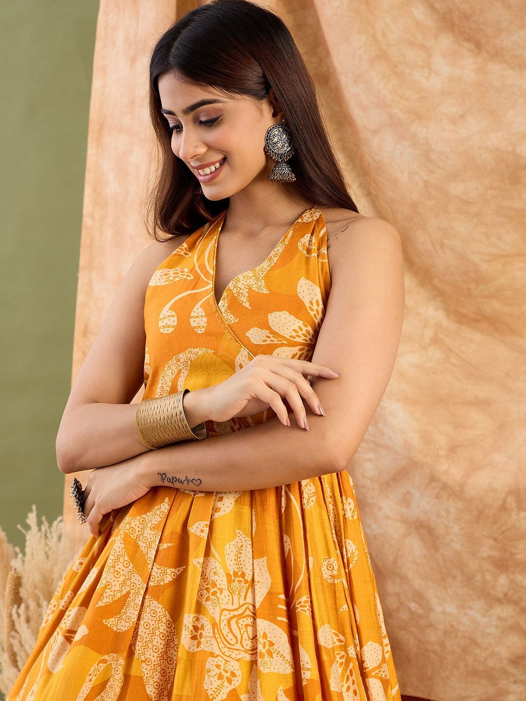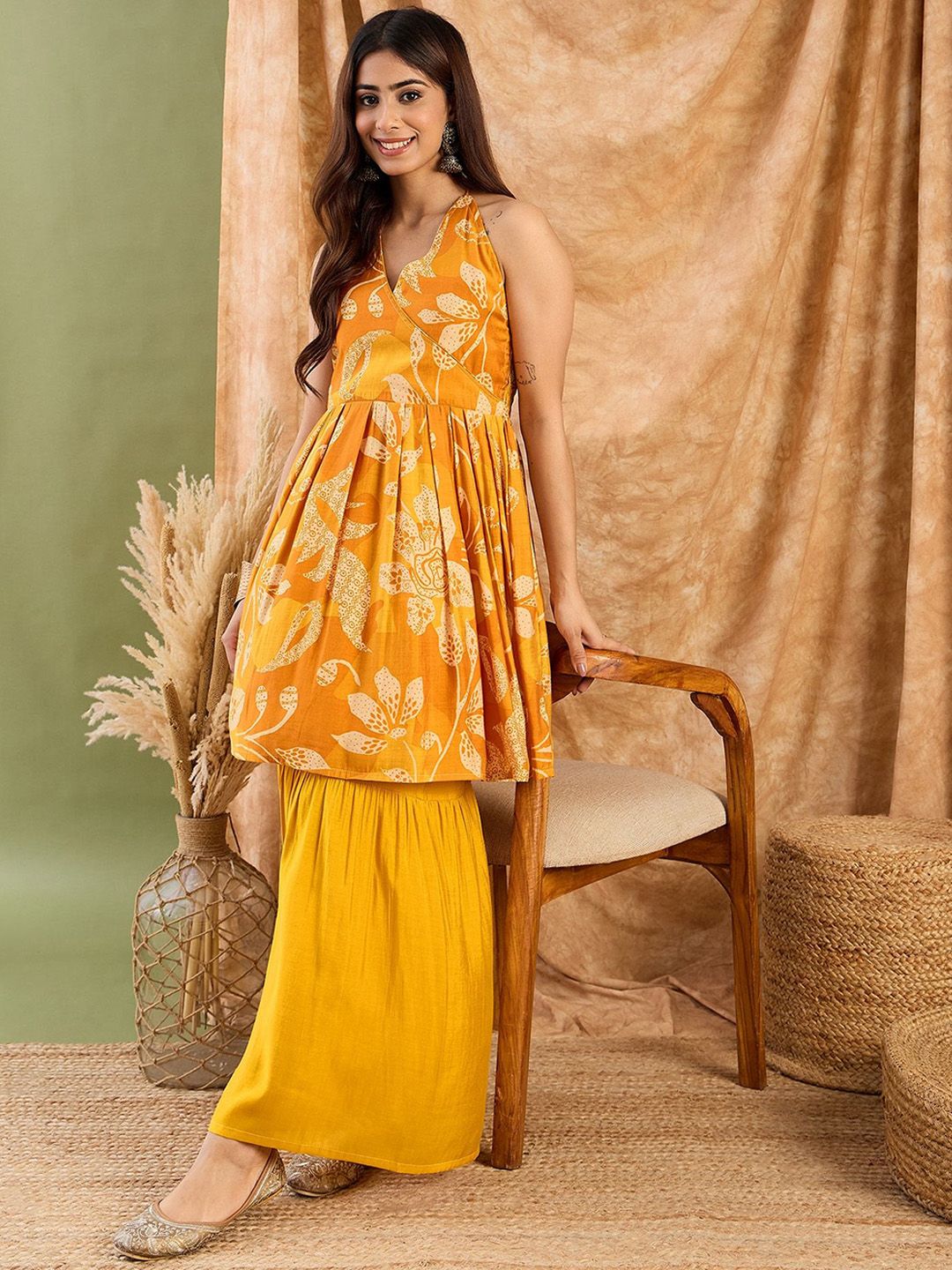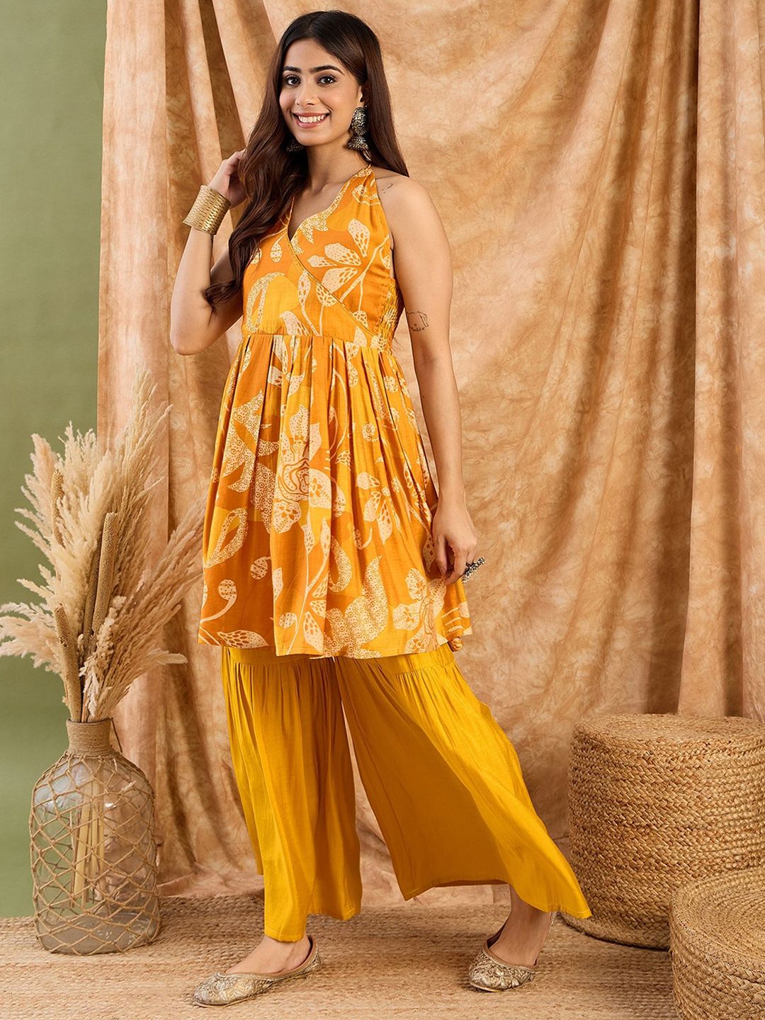 InWeave Floral Printed Pleated Halter Neck A-Line Kurta With Palazzos