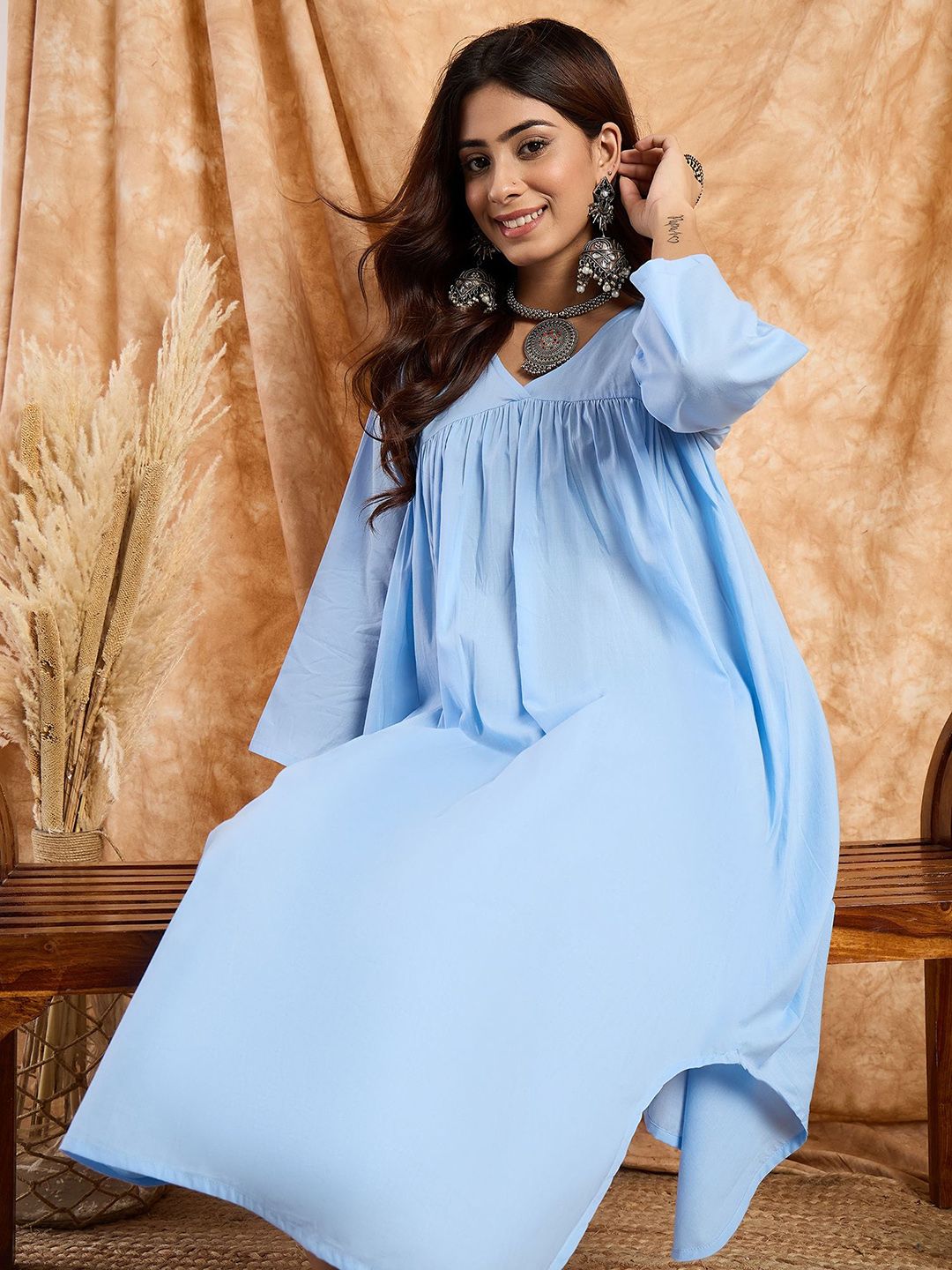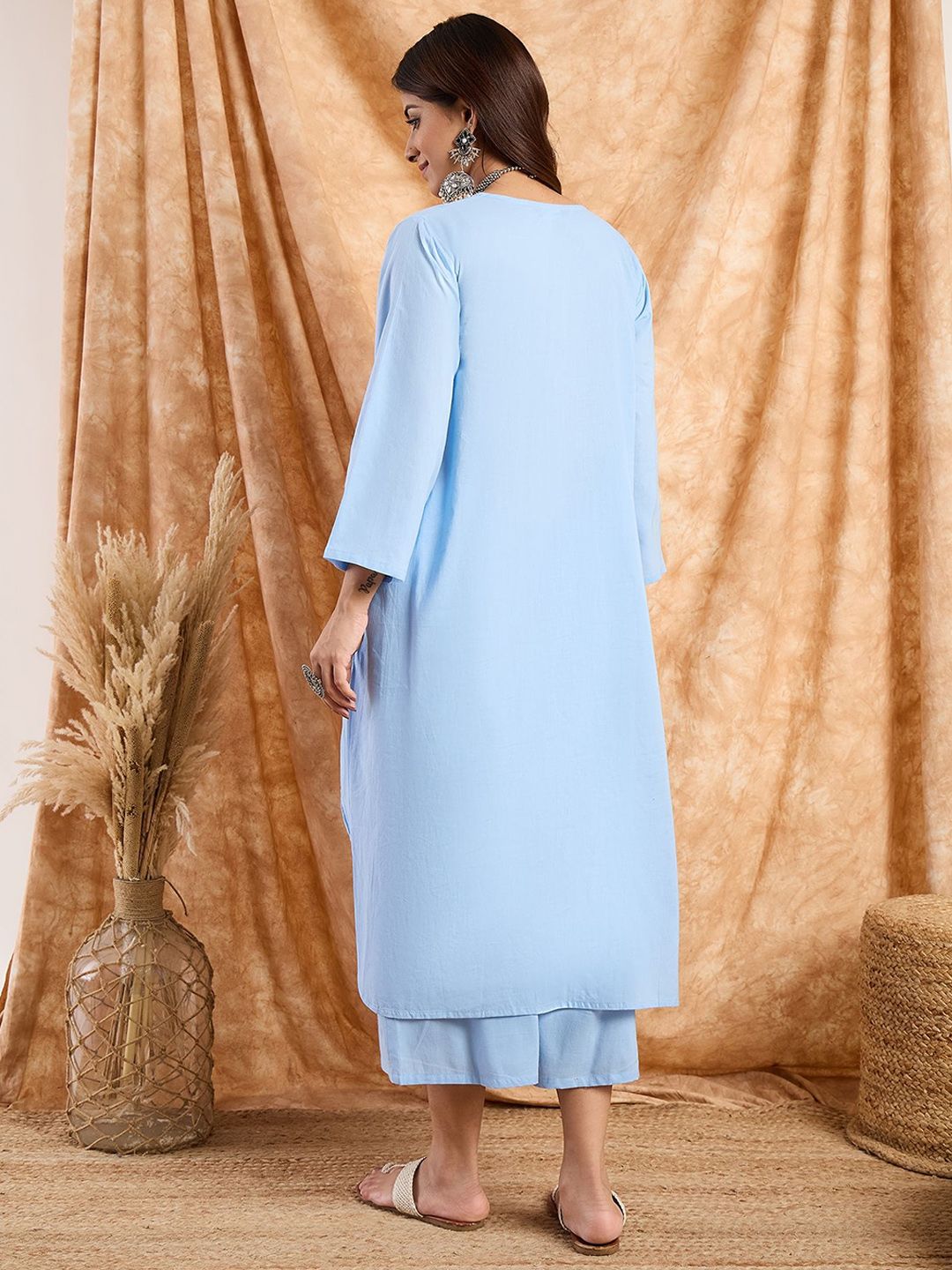 InWeave Pleated V-Neck Pure Cotton A-Line Kurta With Palazzos