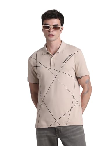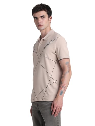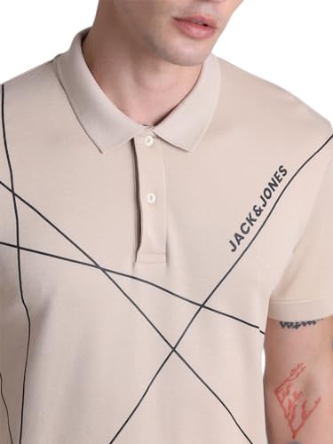 JACK & JONES Men Cotton Brand Logo Printed Polo Collar Short Sleeves Applique Slim Fit T-Shirt