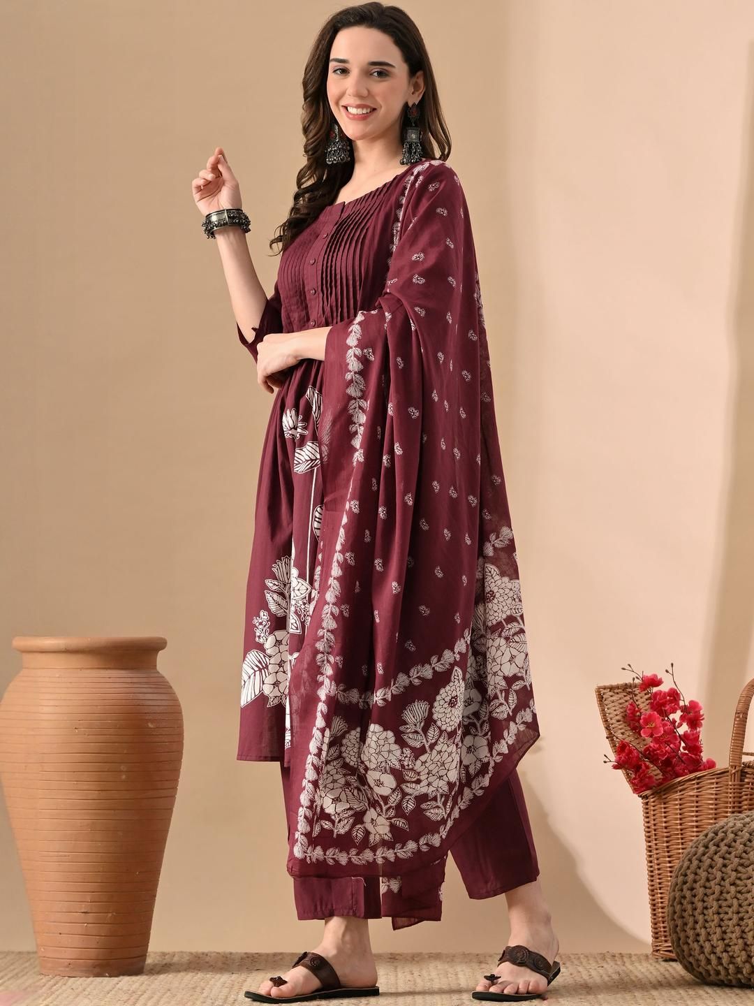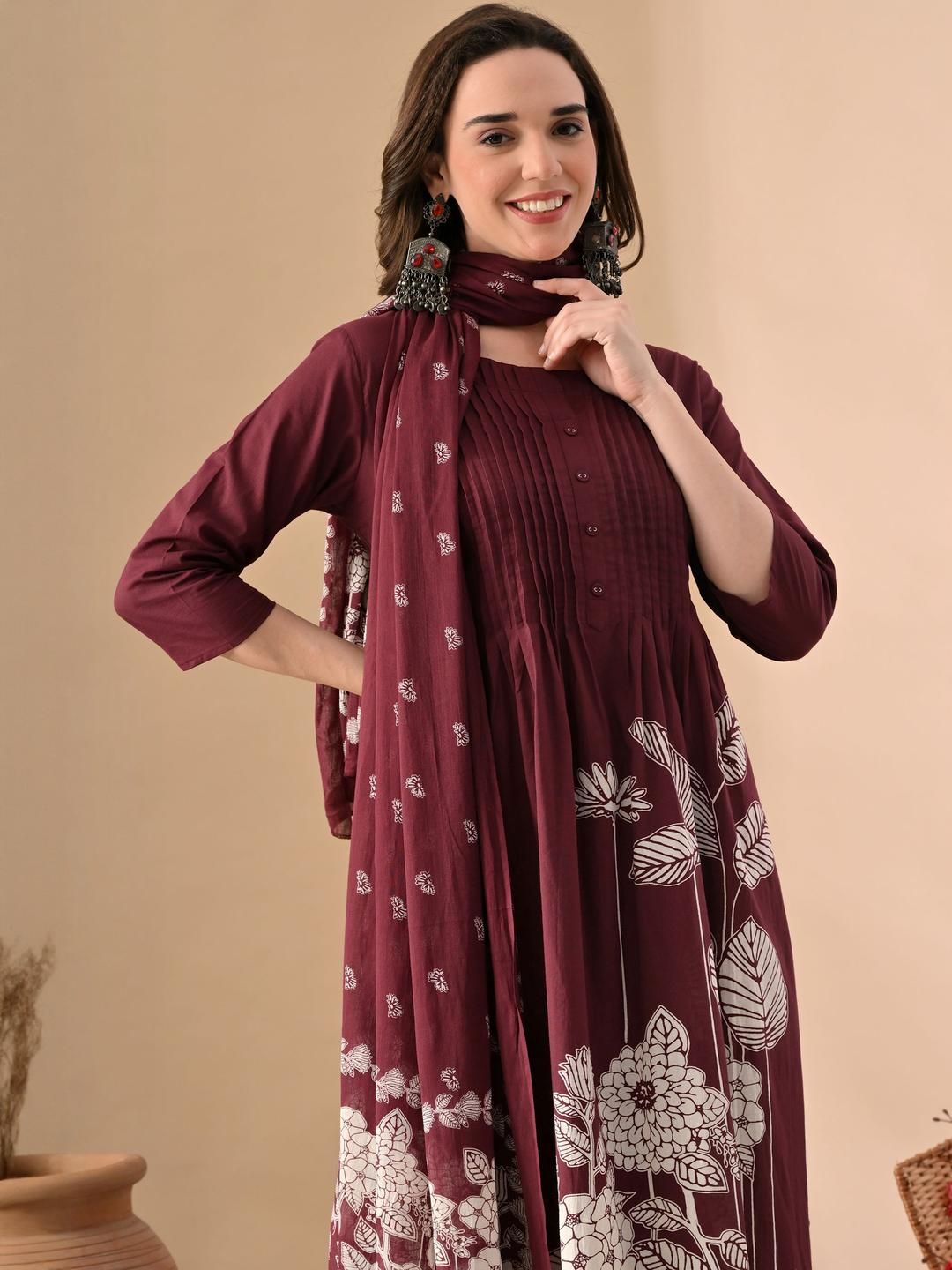 Jaipuri Fashionista Women Floral Printed Pleated Pure Cotton Kurta with Trousers & Dupatta