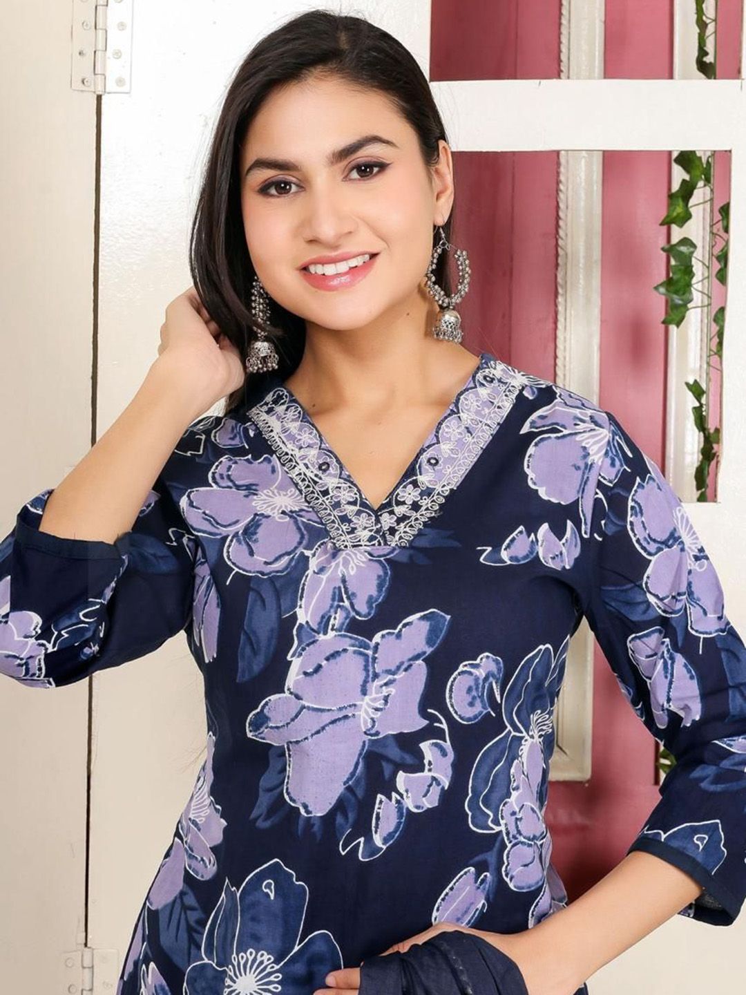 JALTHER Women Floral Embroidered Thread Work Pure Cotton Kurta with Pyjamas & Dupatta