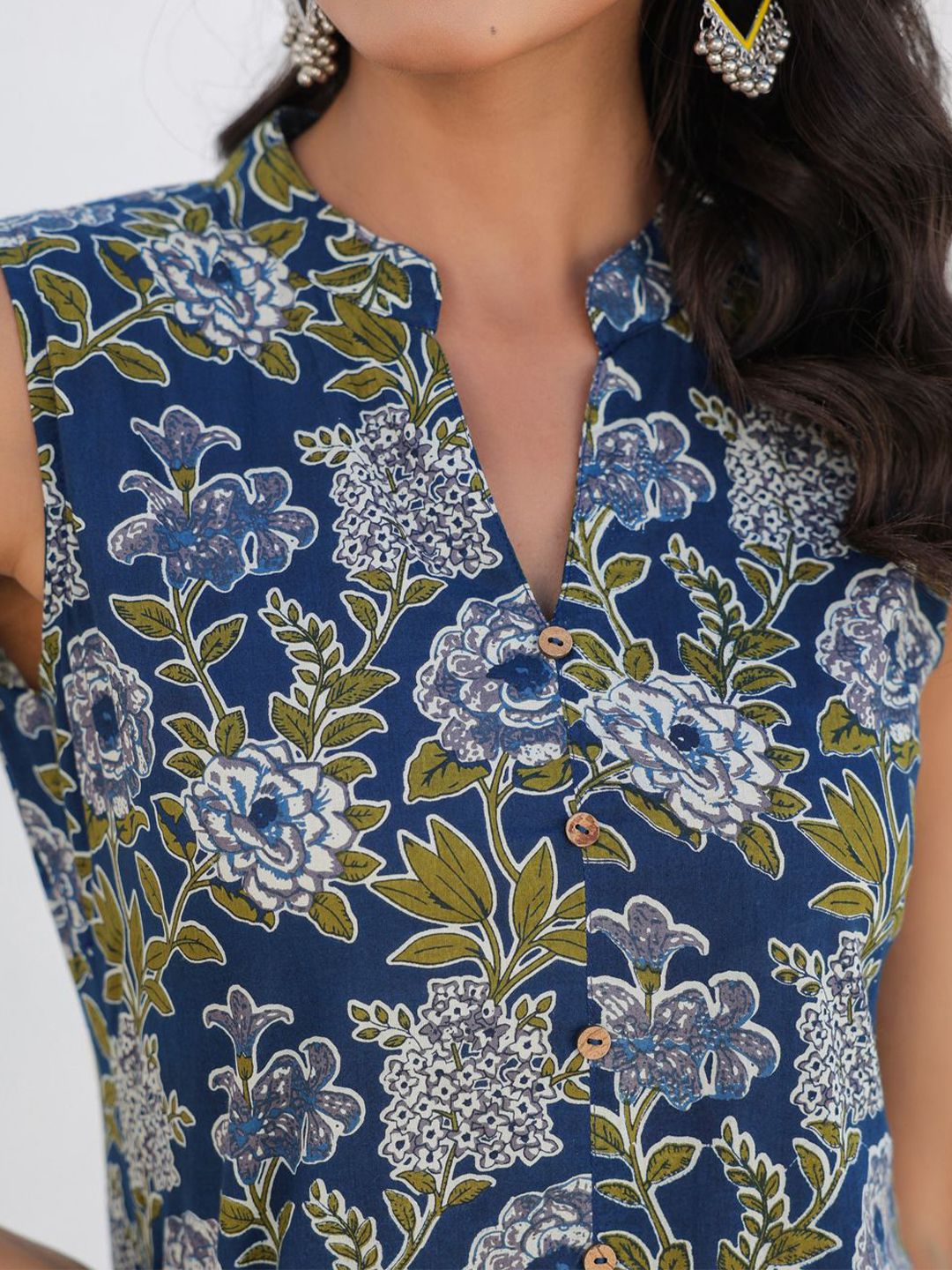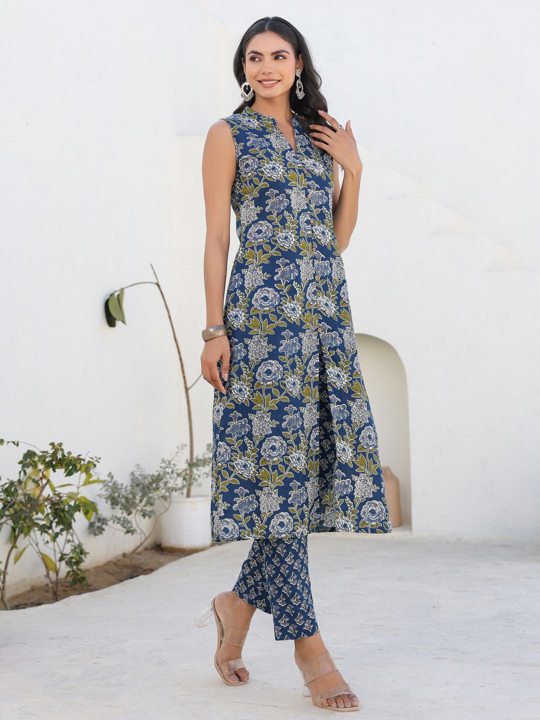Janasya Women Dark Blue Pure Cotton Floral Printed A-line Kurta Pant Set