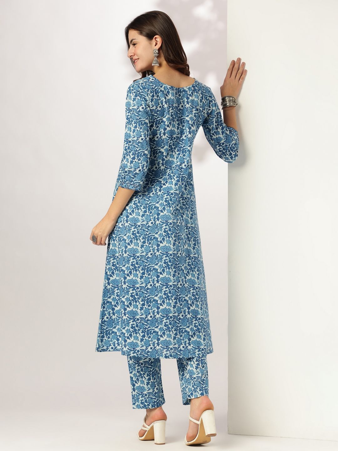 Janasya Women Indigo Pure Cotton Floral Printed A-line Kurta Pant Set