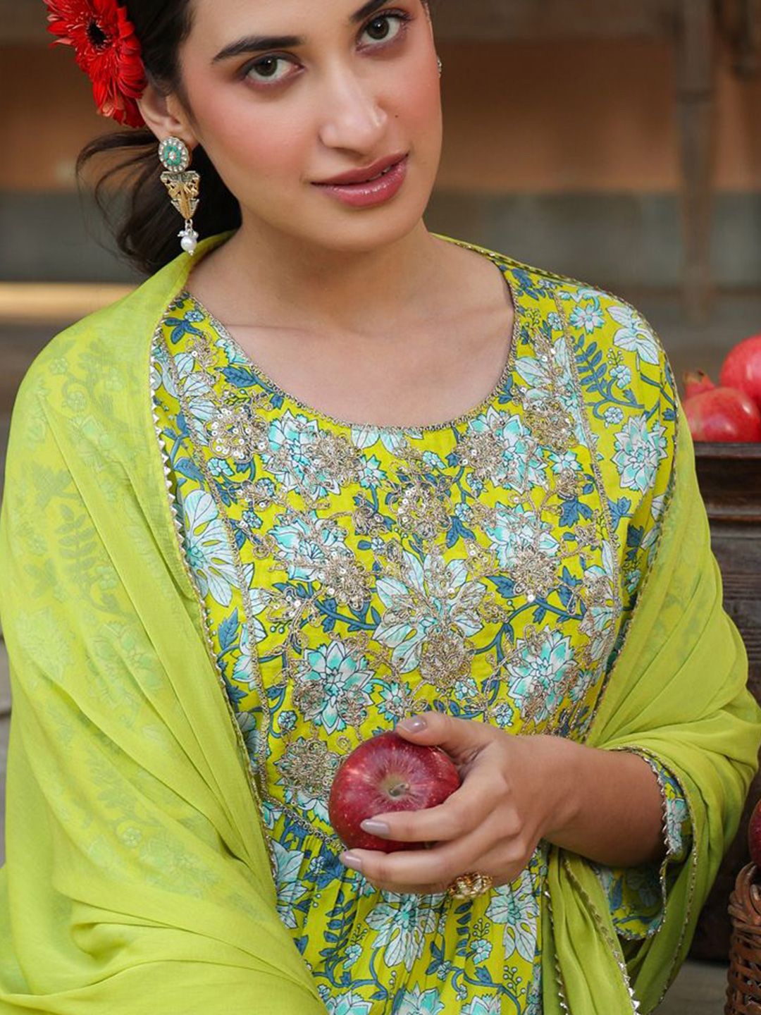 Janasya Women Lime Green Pure Cotton Floral Printed Yoke Design A-line Kurta Set