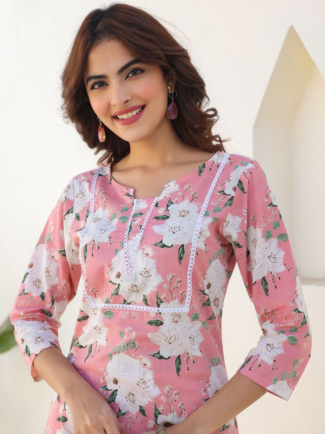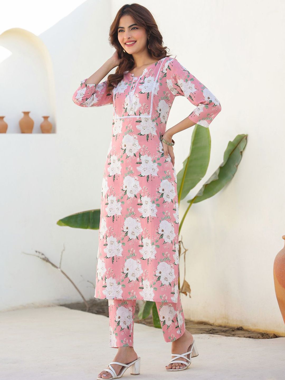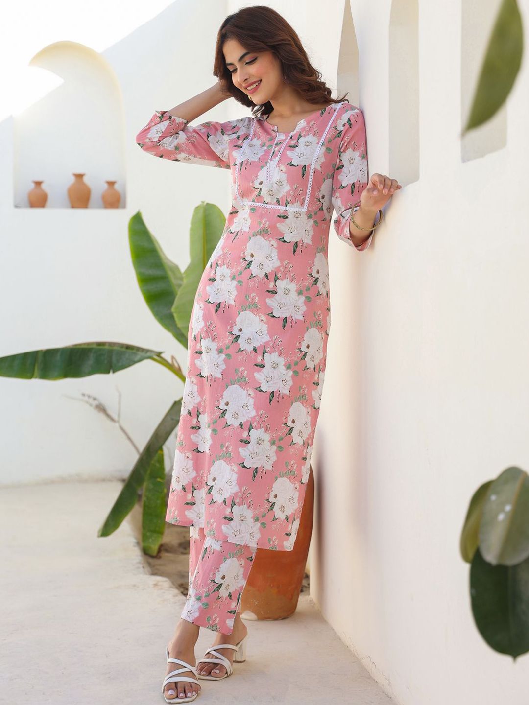 Janasya Women Pink Pure Cotton Floral Printed Straight Kurta Pant Set