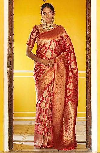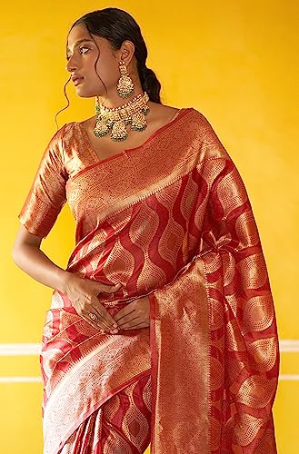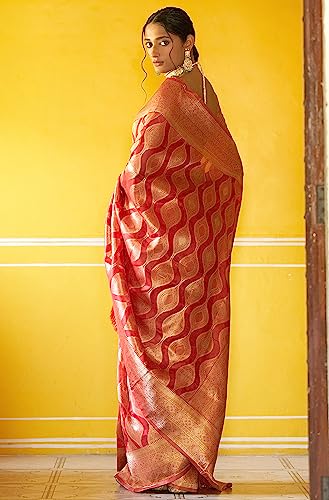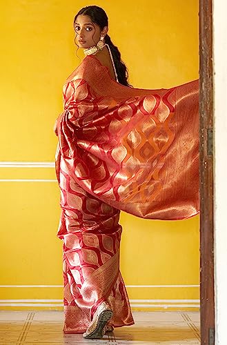 Janasya Women's Red Organza Woven Ethnic Motifs Saree with Unstitched Blouse Piece