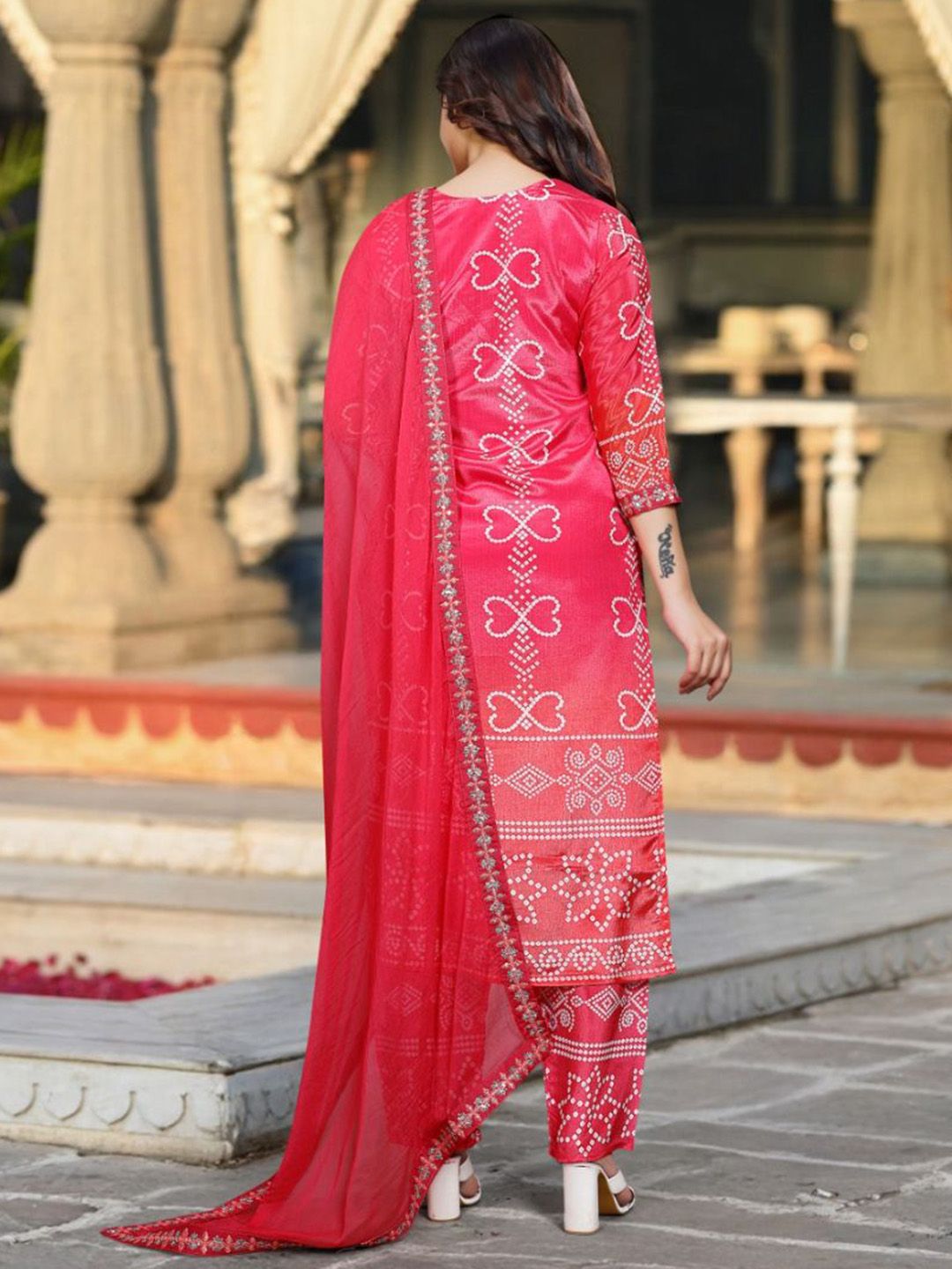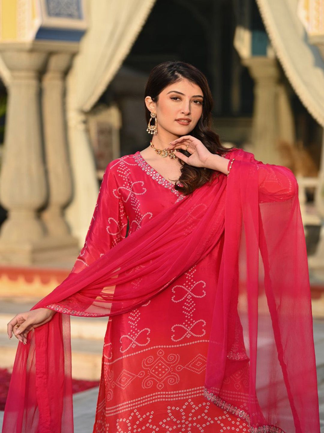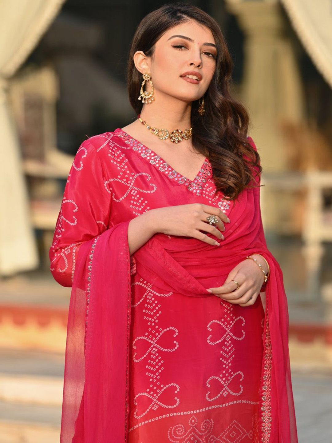 JAPNAAM Bandhani Printed V-Neck Chinon Silk Straight Kurta With Trousers & Dupatta
