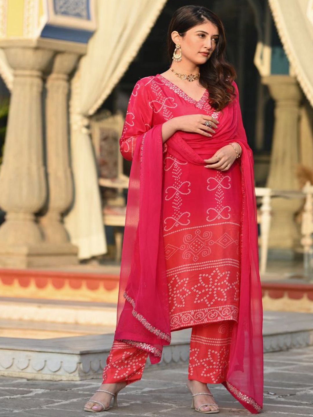 Buy this stylish JAPNAAM Bandhani Printed V-Neck Chinon Silk Straight Kurta With Trousers & Dupatta at Marincart Nepal. This product offers great quality and value. Perfect for those looking for the latest trends in fashion. Get yours now at unbeatable prices.