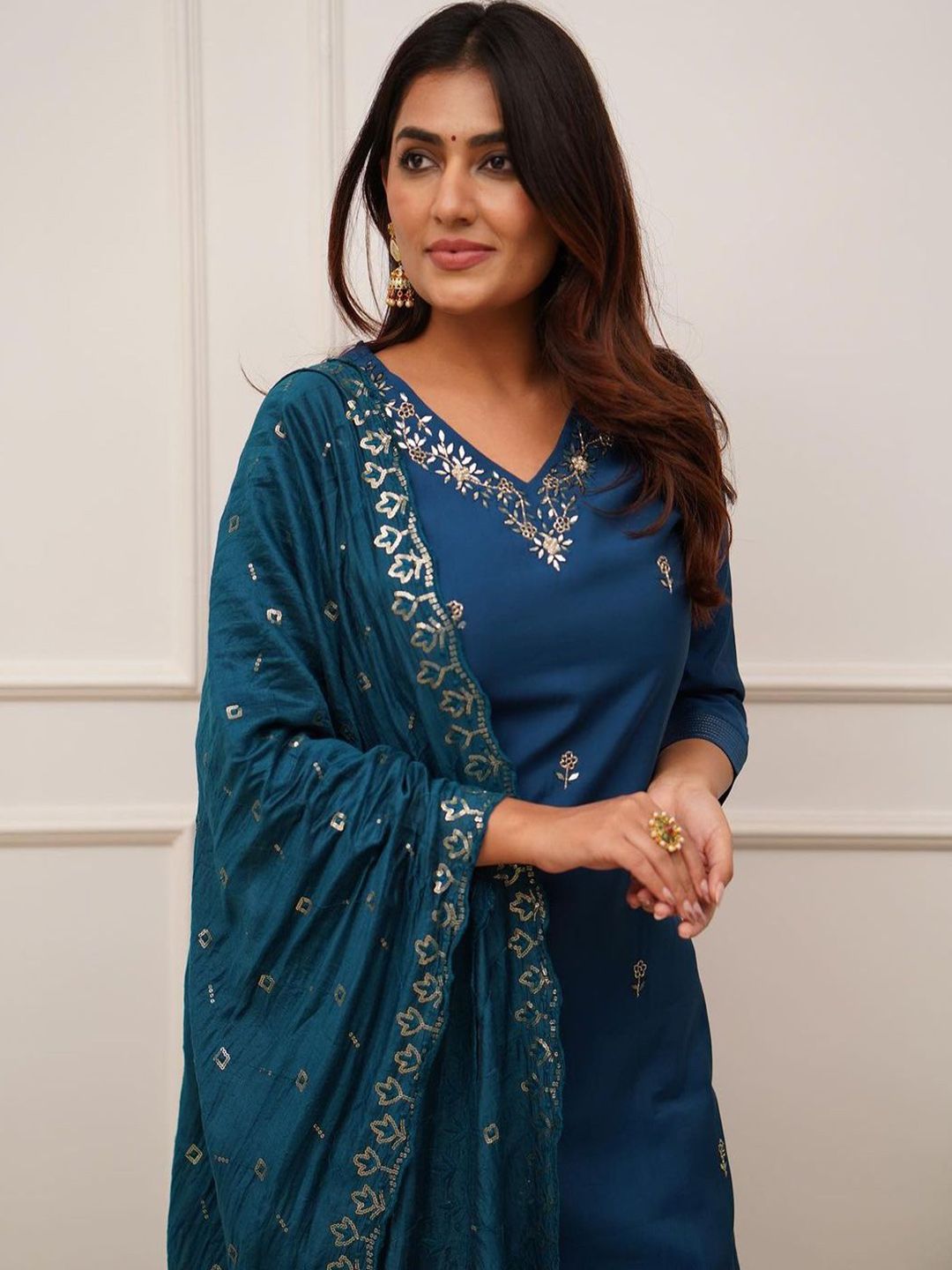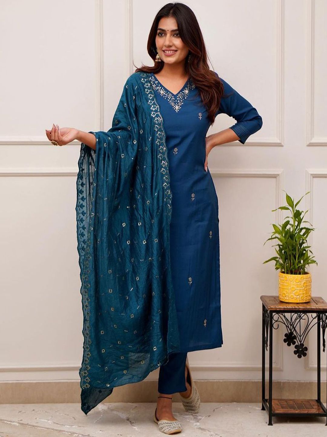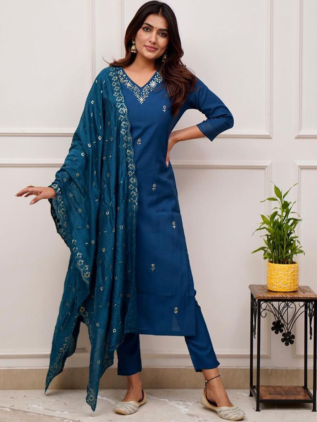 JAPNAAM Floral Embroidered V-Neck Straight Kurta With Trousers & Dupatta
