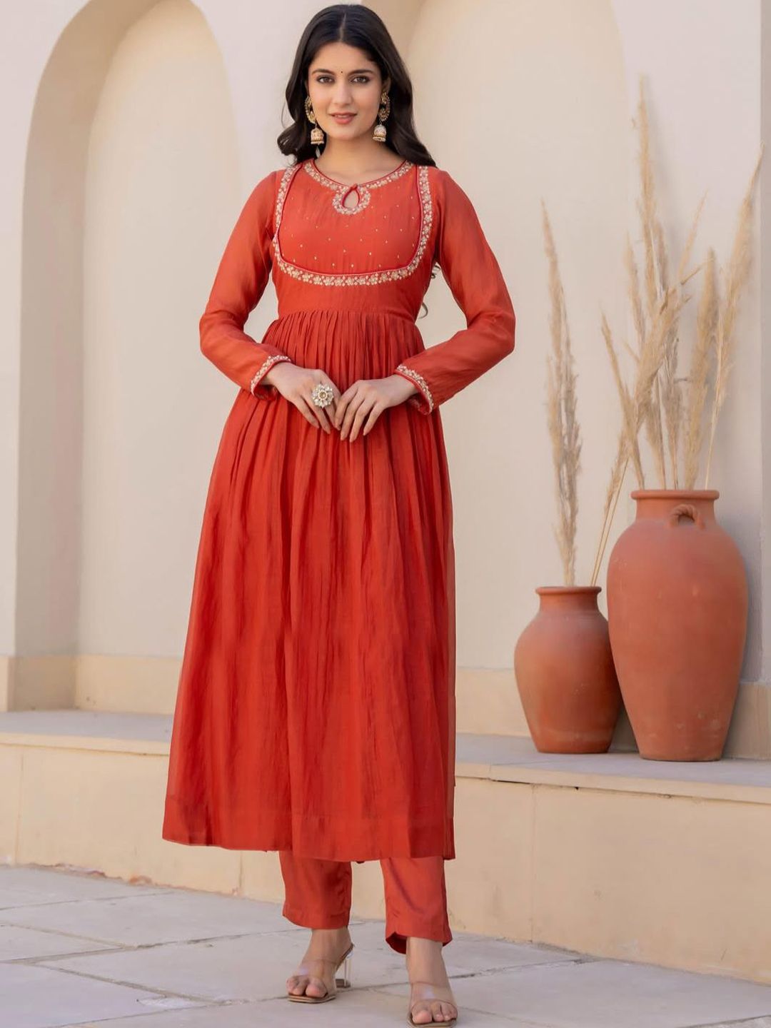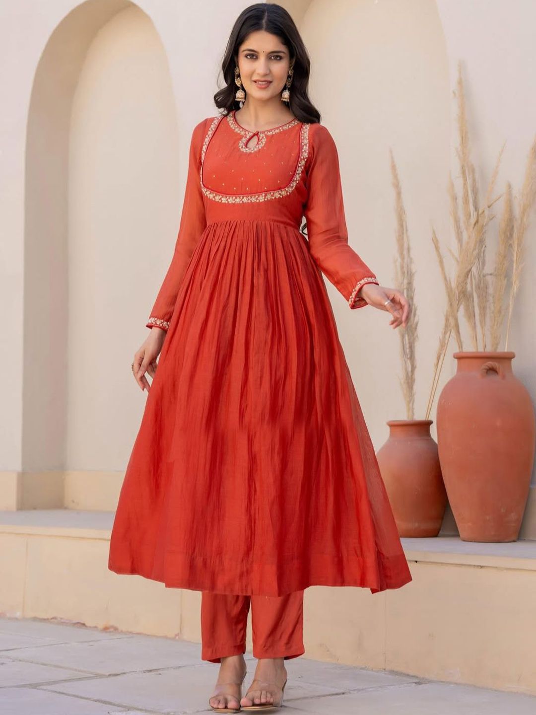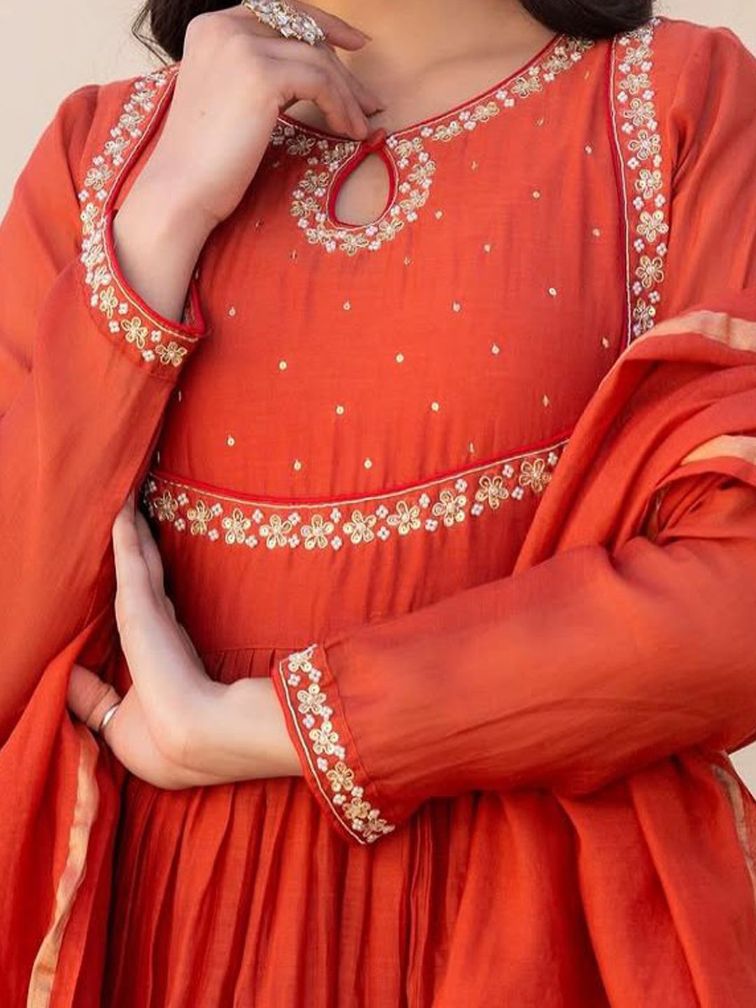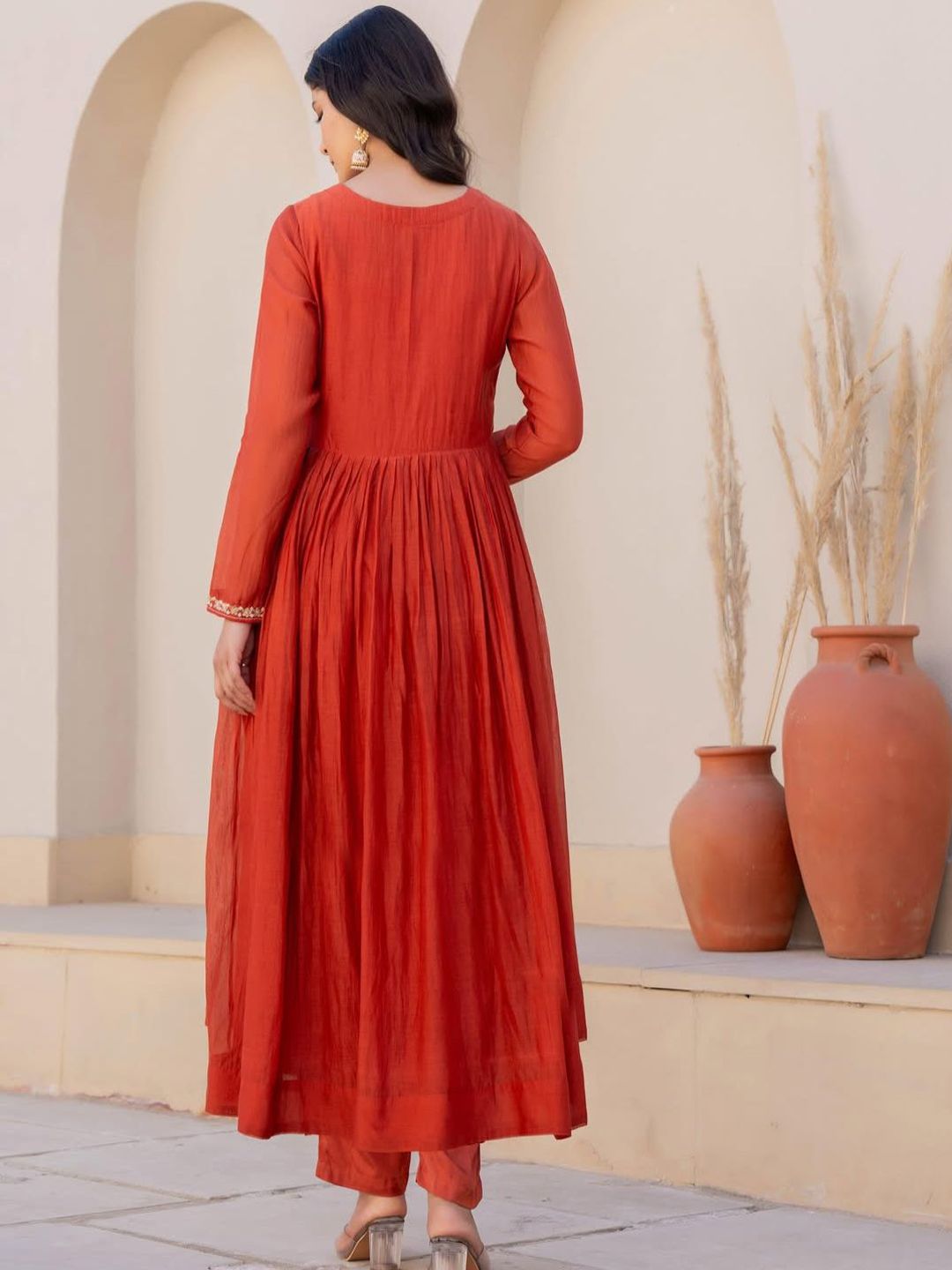 JAPNAAM Floral Yoke Design Pleated Pure Silk Anarkali Kurta With Trousers & Dupatta
