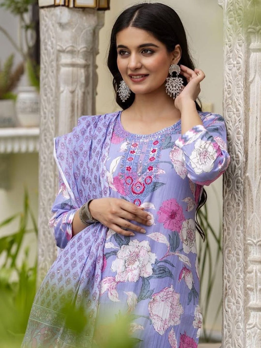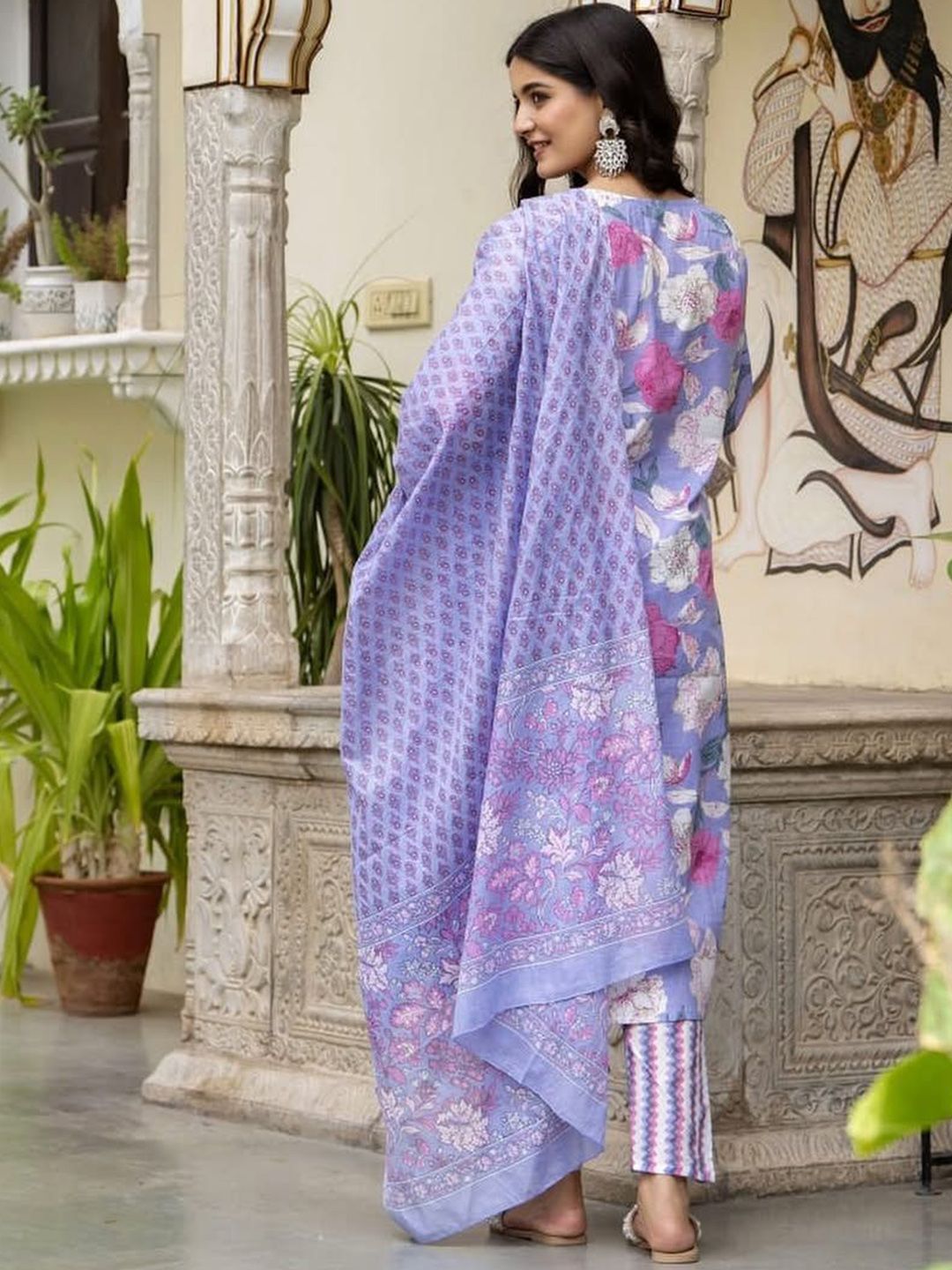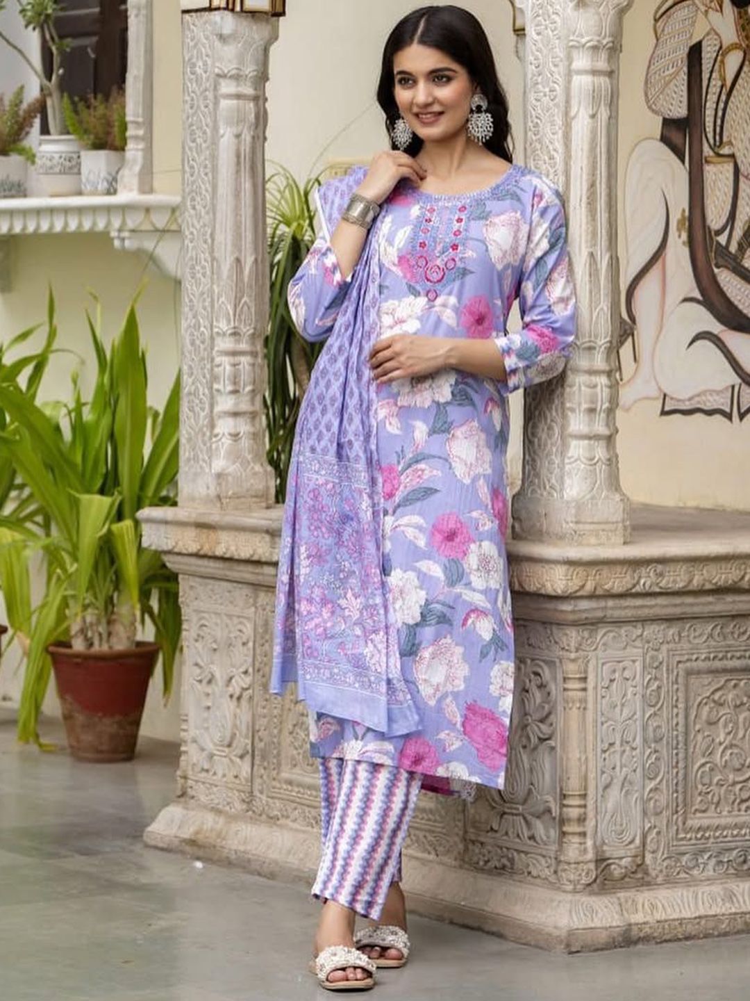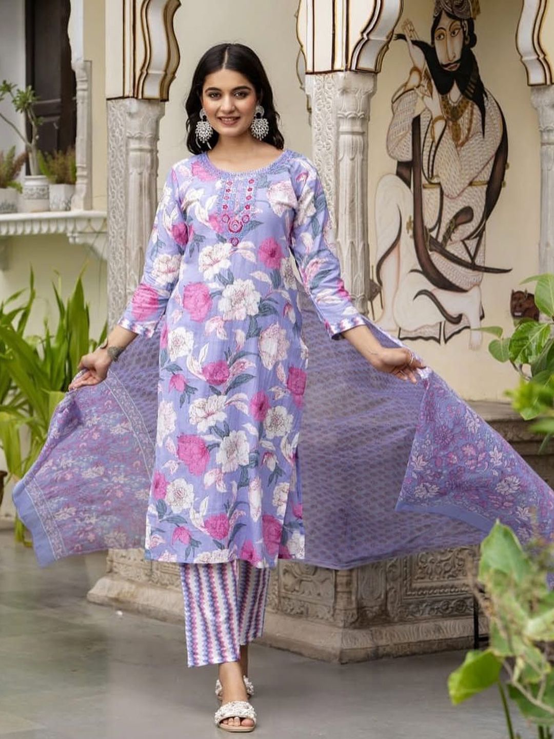 Jasoriya Floral Printed Thread Work Pure Cotton Straight Kurta With Trousers & Dupatta