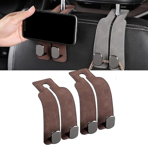 Juflix Car Seat Back Double Hooks,2024 Car Seat Headrest Hook,Leather Car Seat Headrest Double Hooks and Mobile Phone Holder,Multifunctional Hook for Car Seat Back,Universal Car Headrest Hook