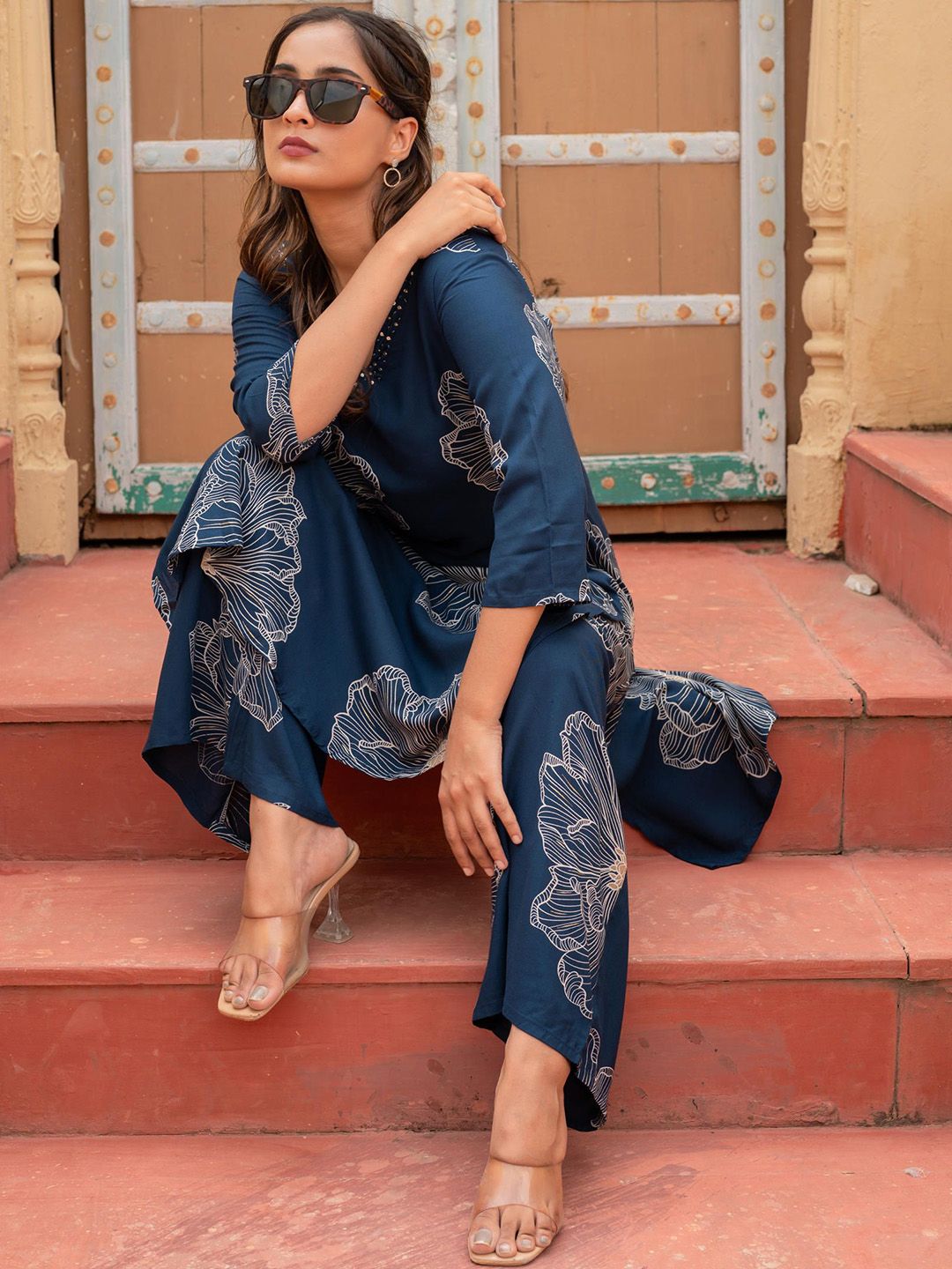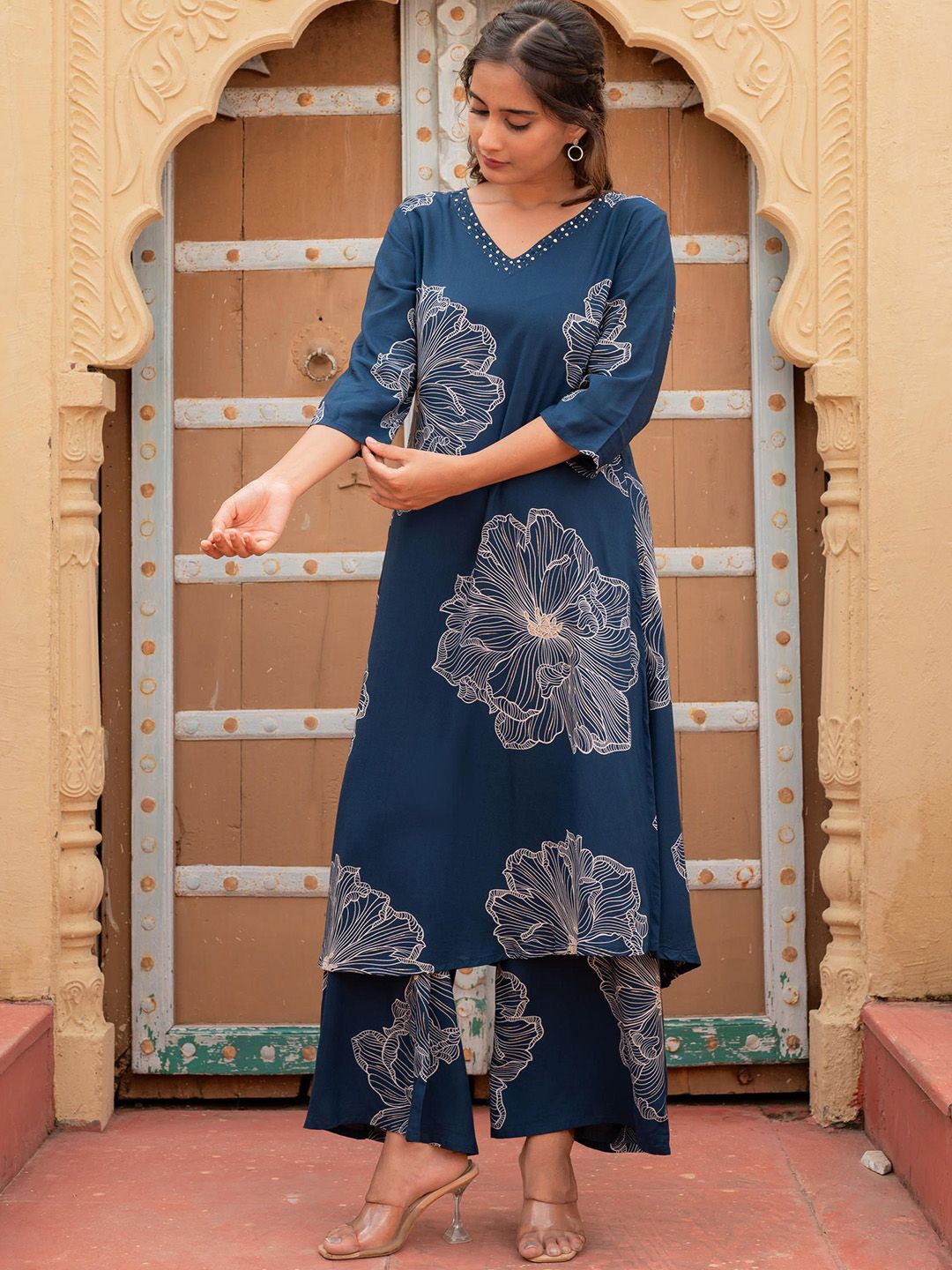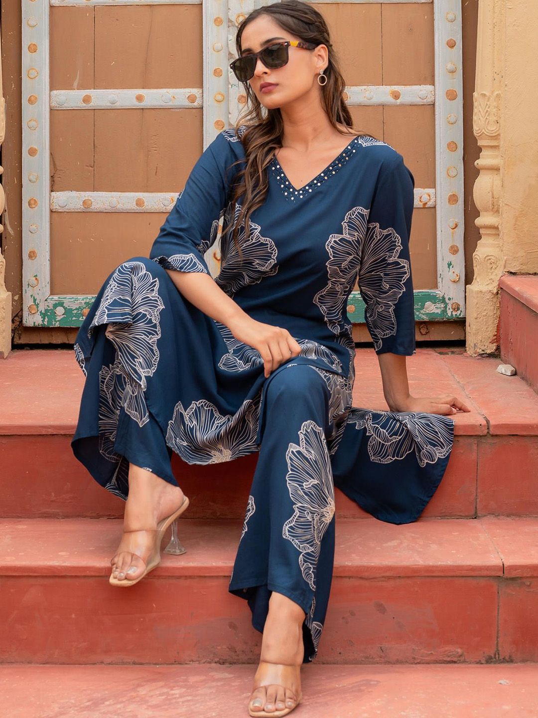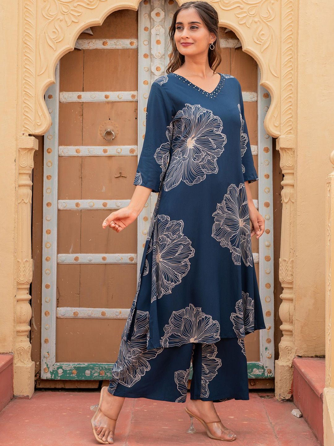 Juniper Floral Printed V-Neck Straight Kurta With Palazzos
